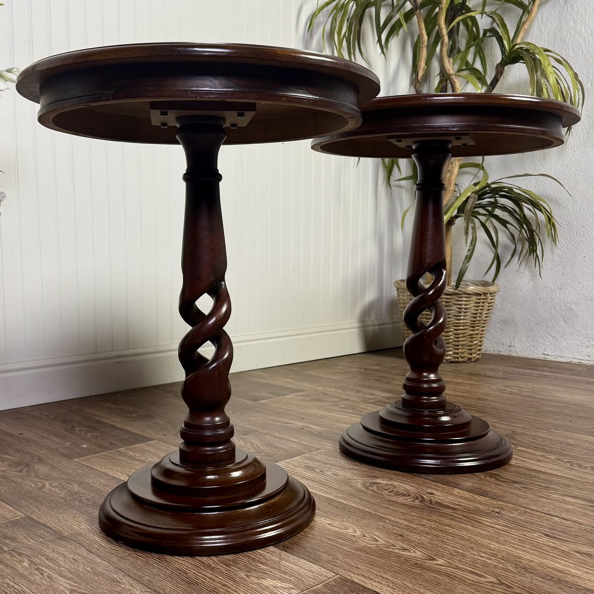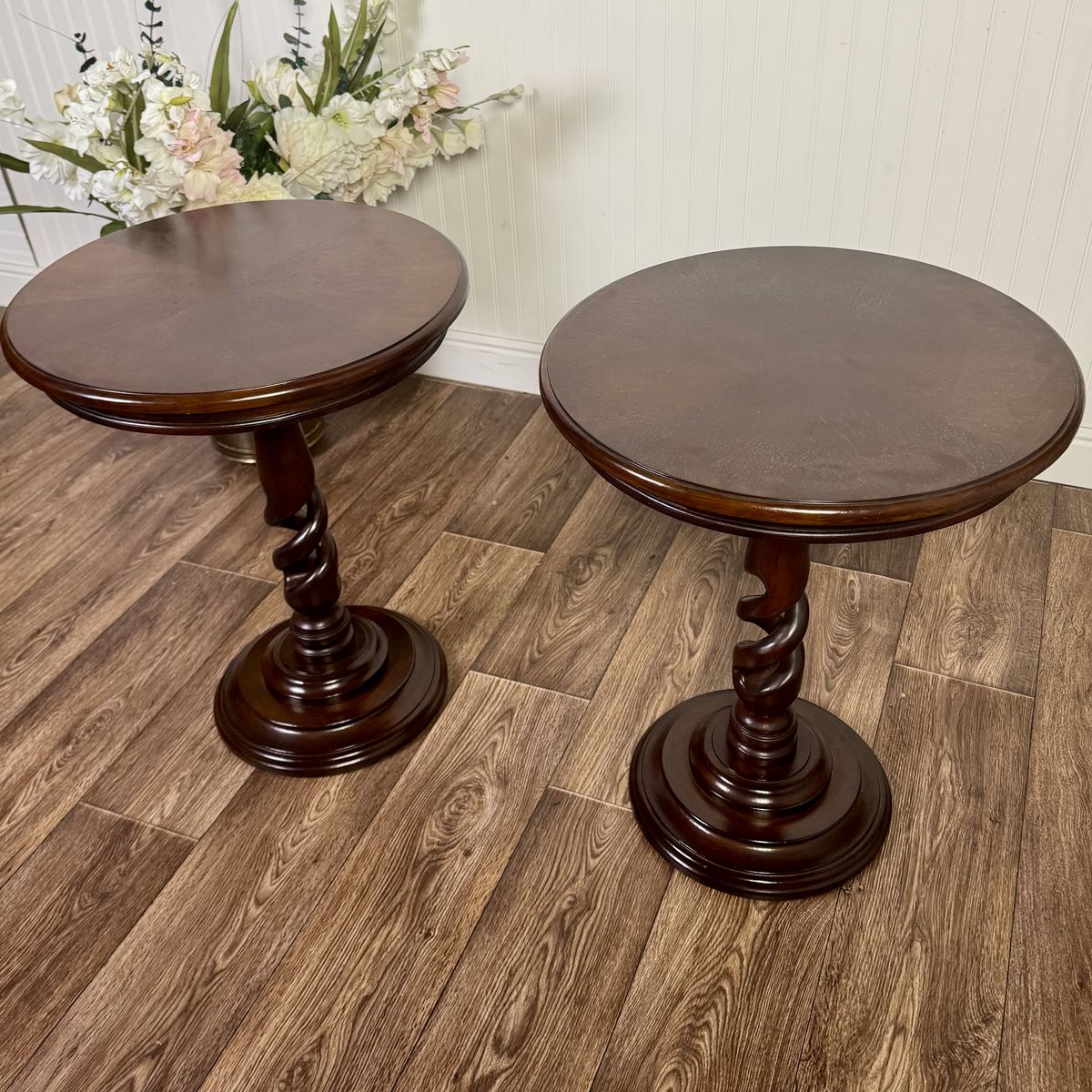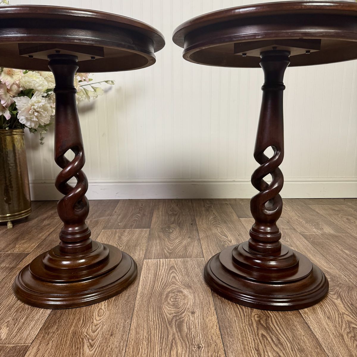 VenmoMatching set of round accent/end tables featuring a classic barley twist pedestal base, a decorative sunburst top, and a rich, dark cherry/walnut finish.