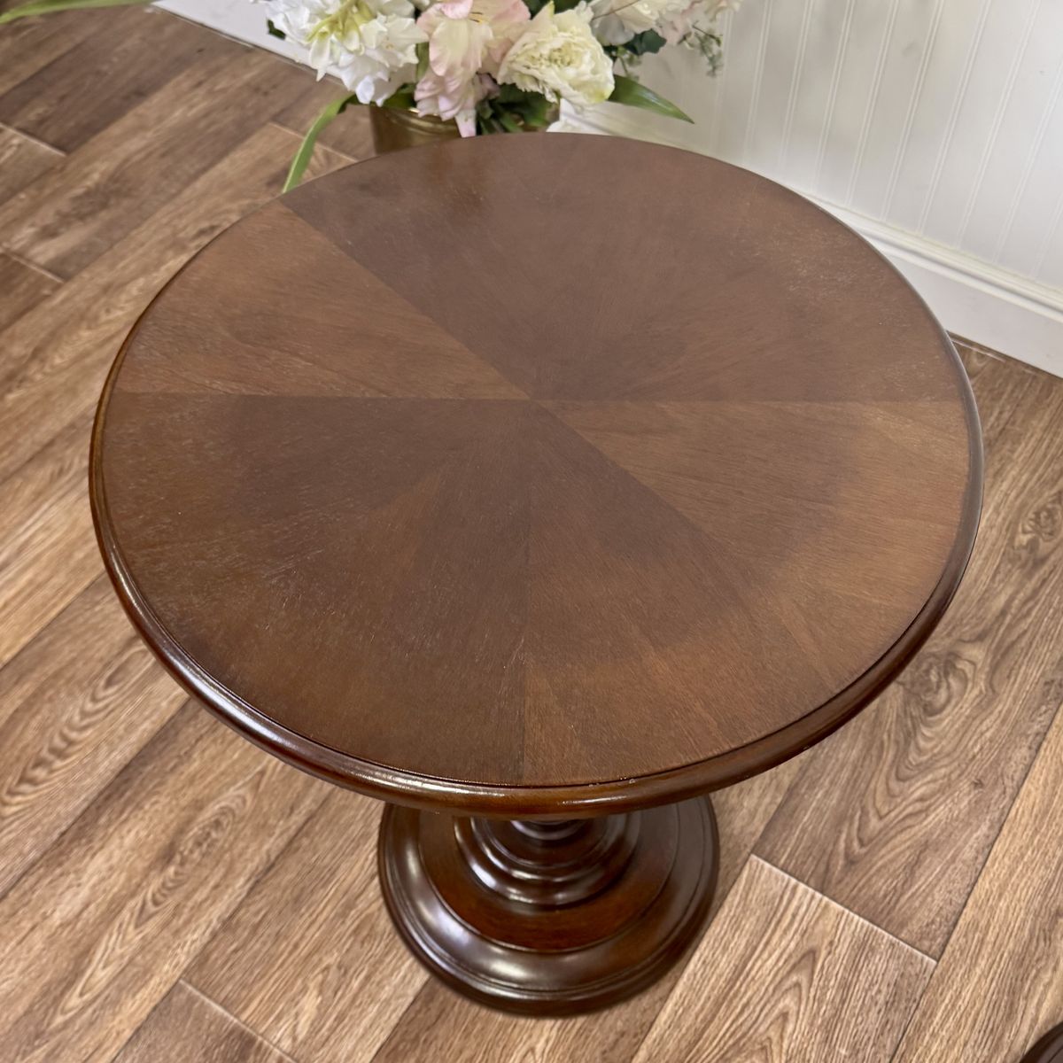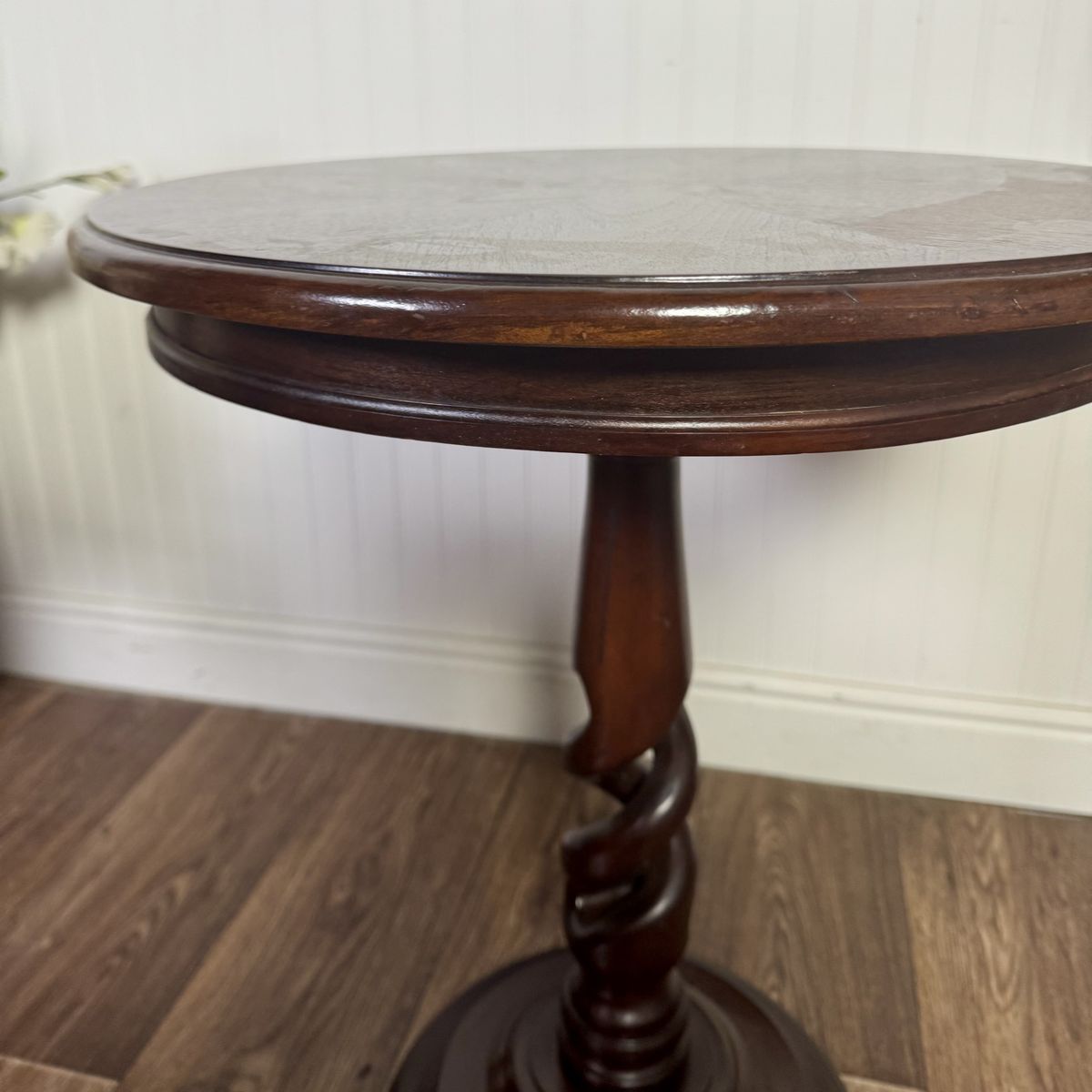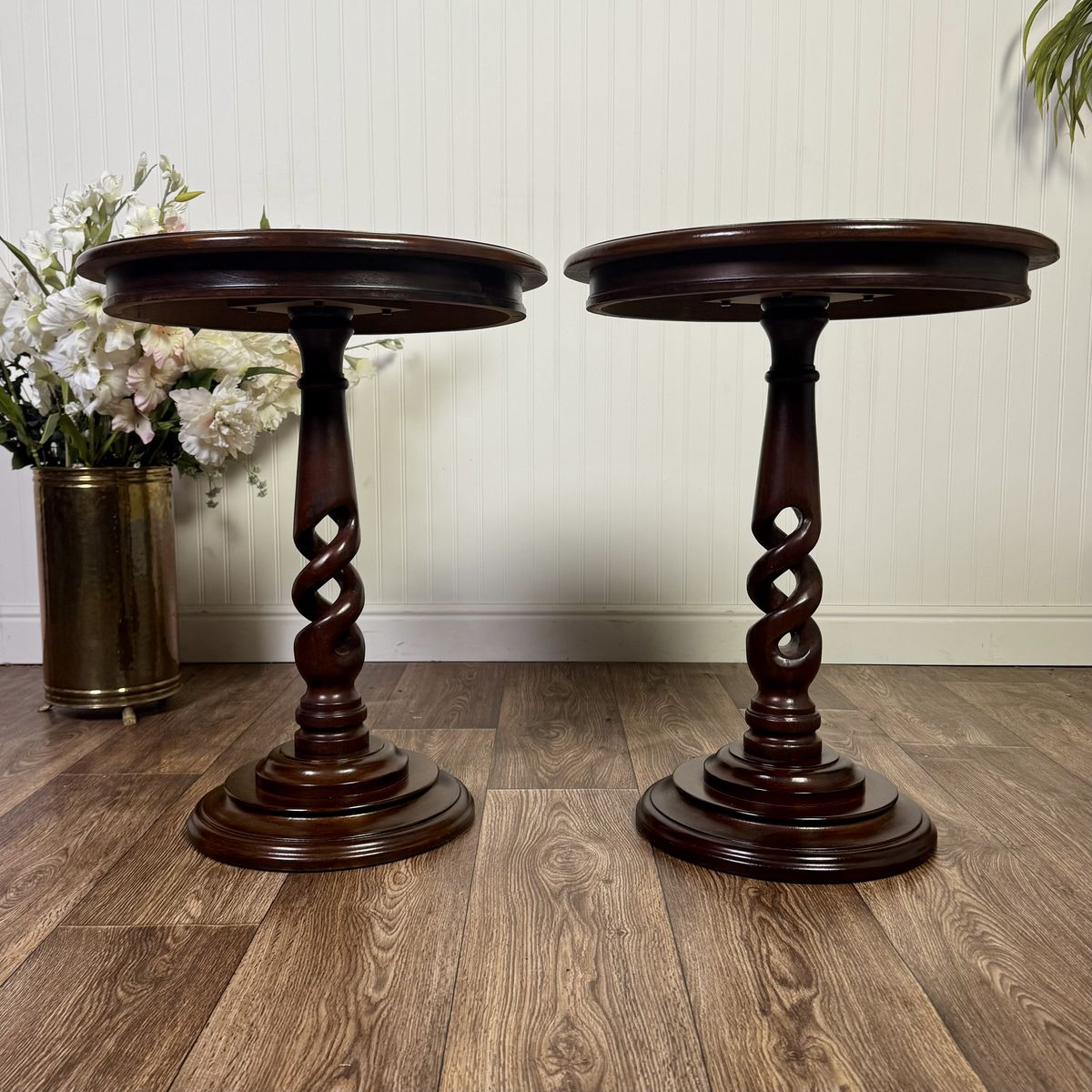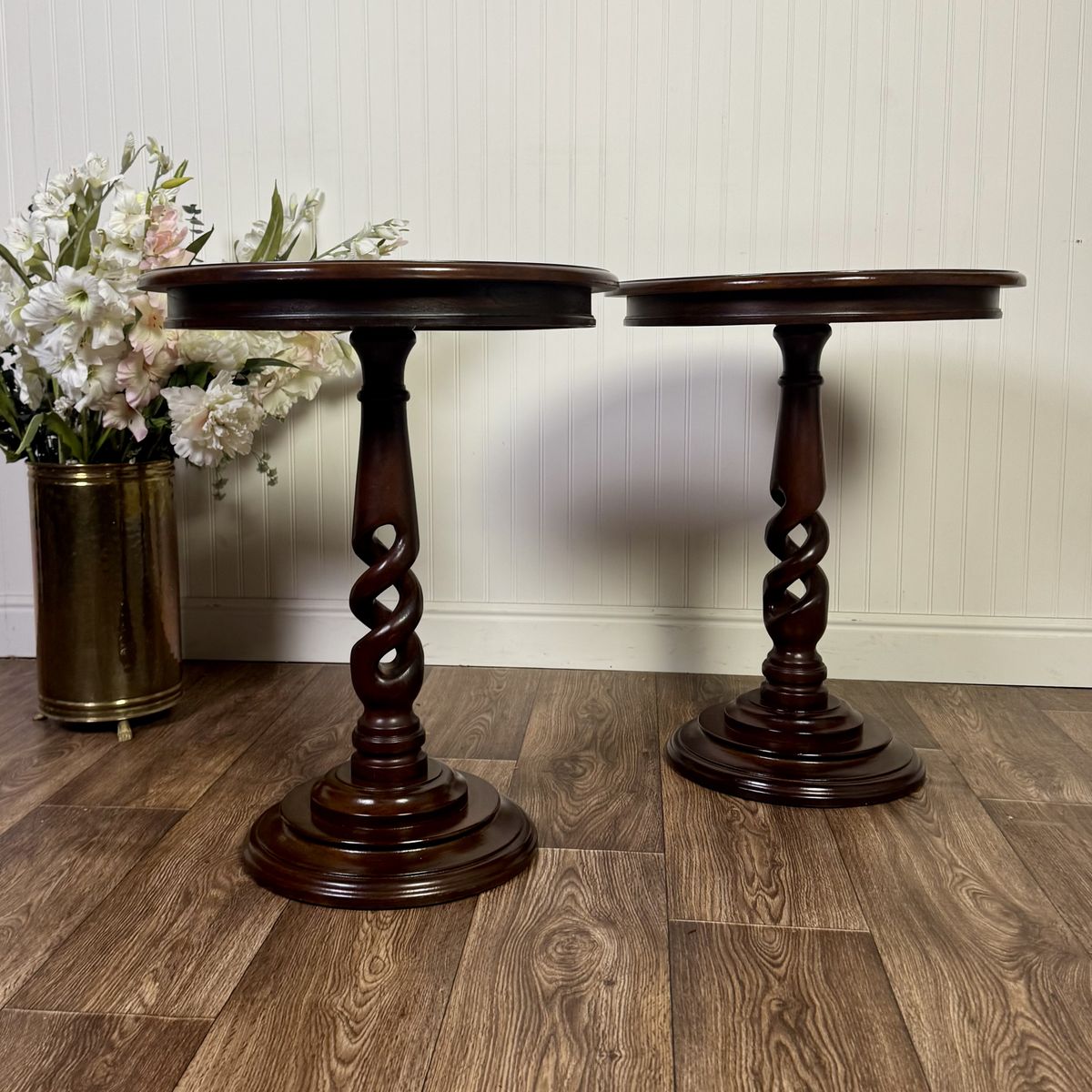 VenmoMatching set of round accent/end tables featuring a classic barley twist pedestal base, a decorative sunburst top, and a rich, dark cherry/walnut finish.