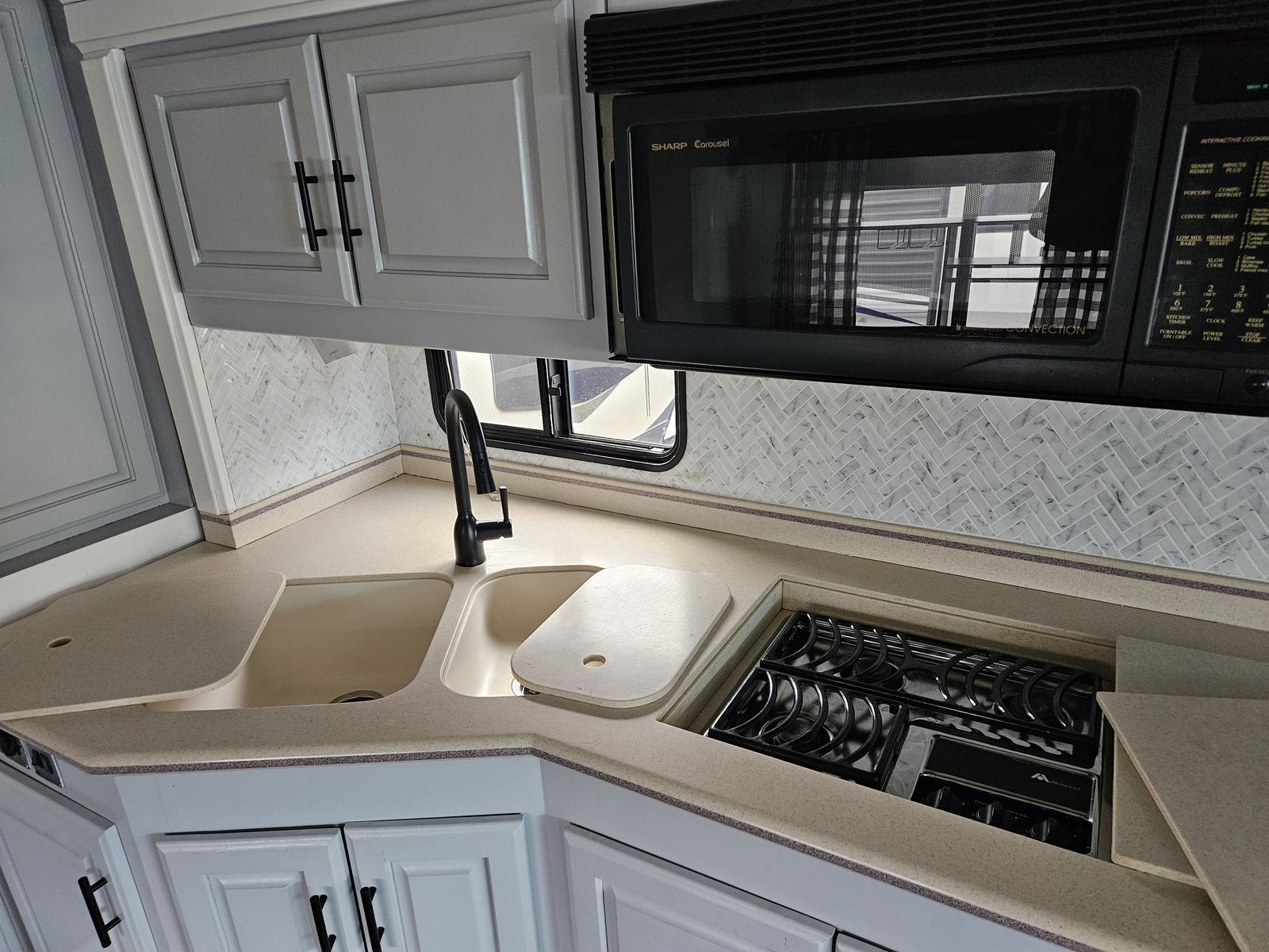 Kitchen has Comforts of Home with Full Size Residential Fridge, Convection Microwave, Luxury Cooktop with Matching Covers, and Large Double Sink with Matching Covers!