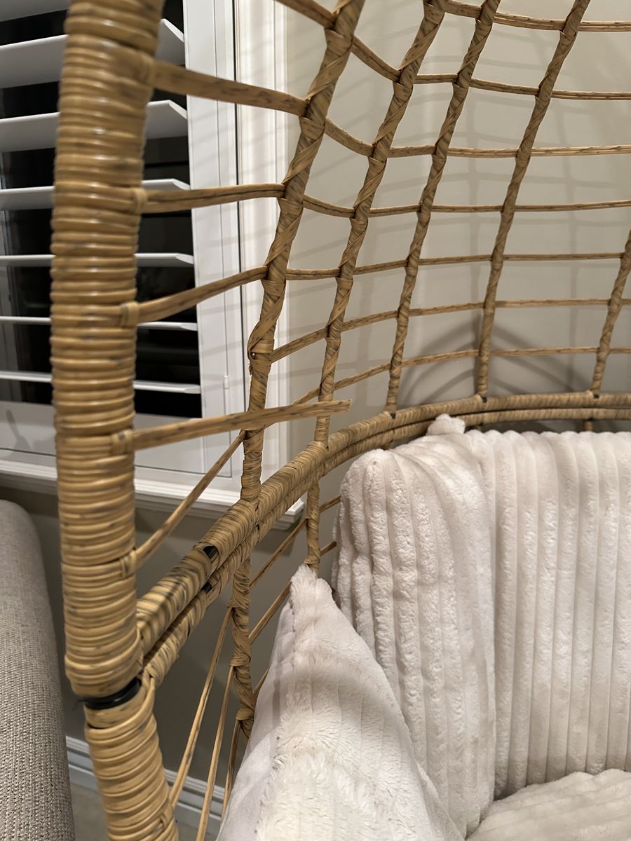 Includes seat cushion and pillows. Small loose rattan piece on the side (see photo) but does not affect use.