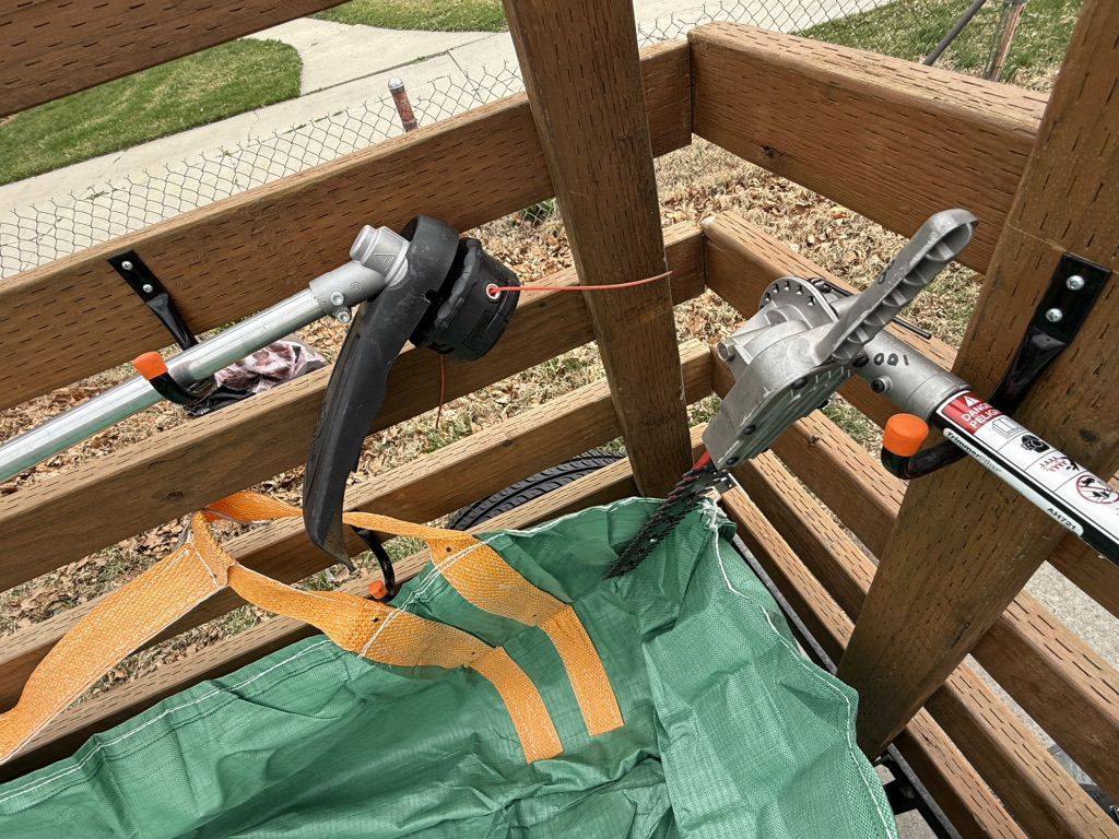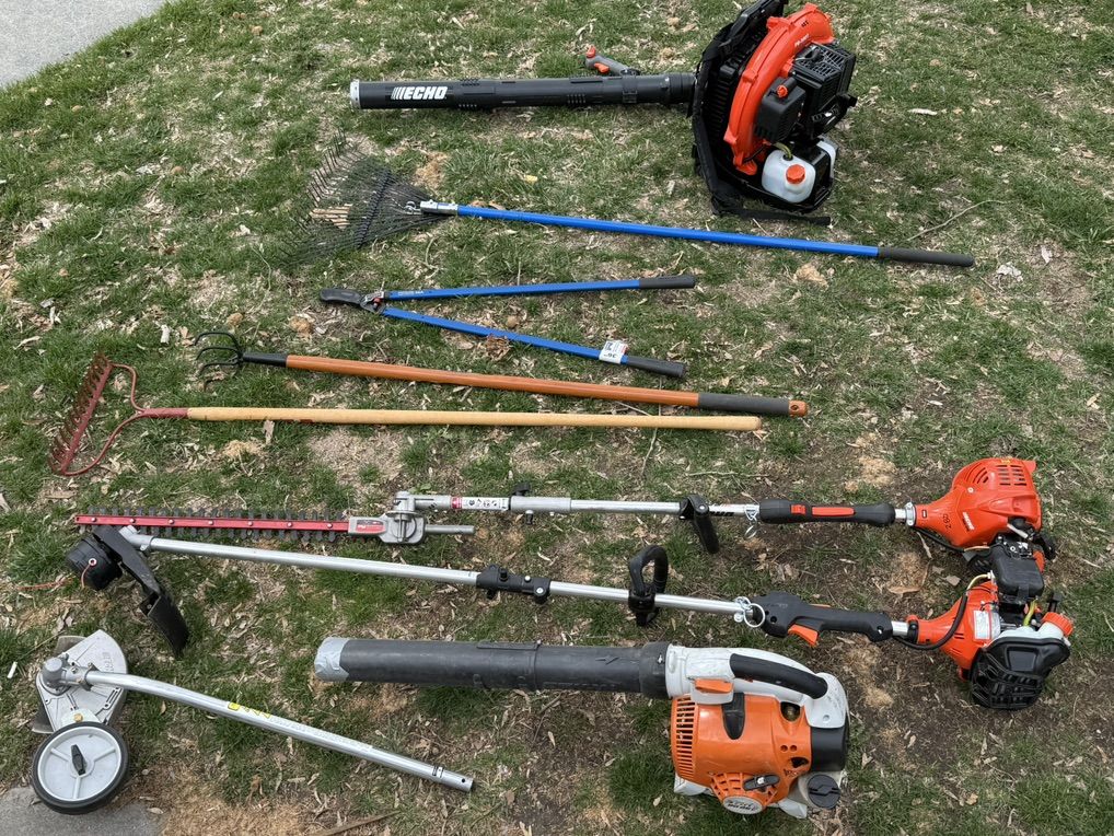 Includes: Echo PAS-225 system (trimmer, edger, pole saw, hedge trimmer), Echo PB-580T backpack blower, heavy duty loppers, rakes, shovels, 2 large tarps and other tools.