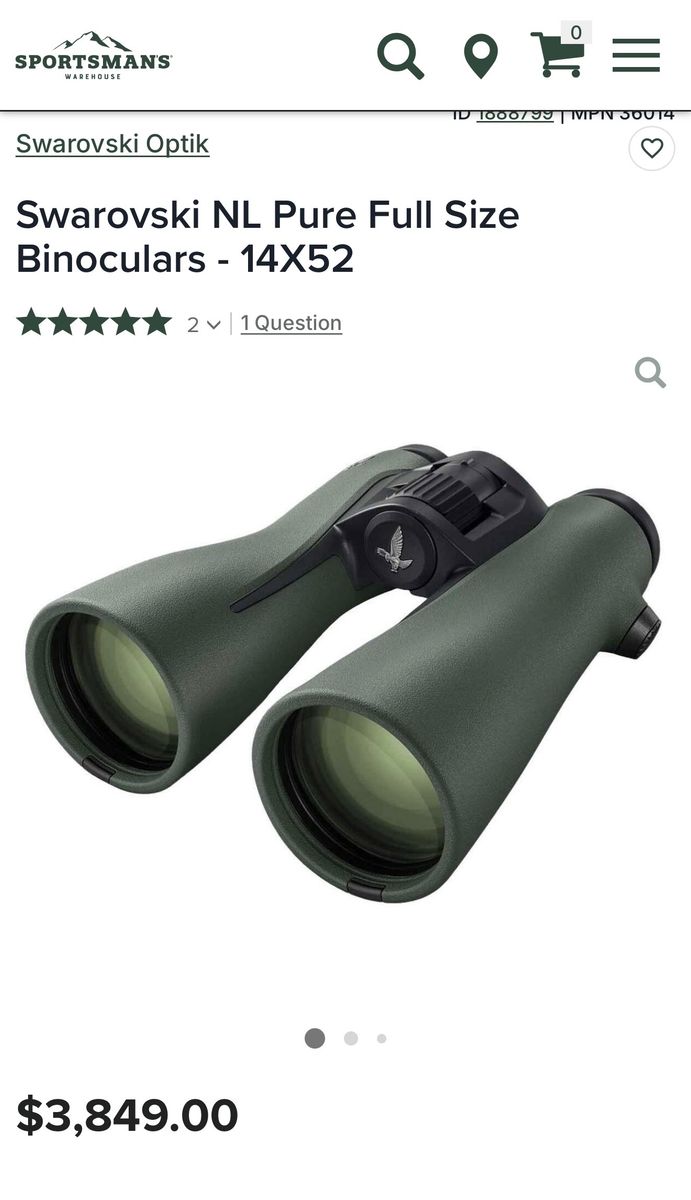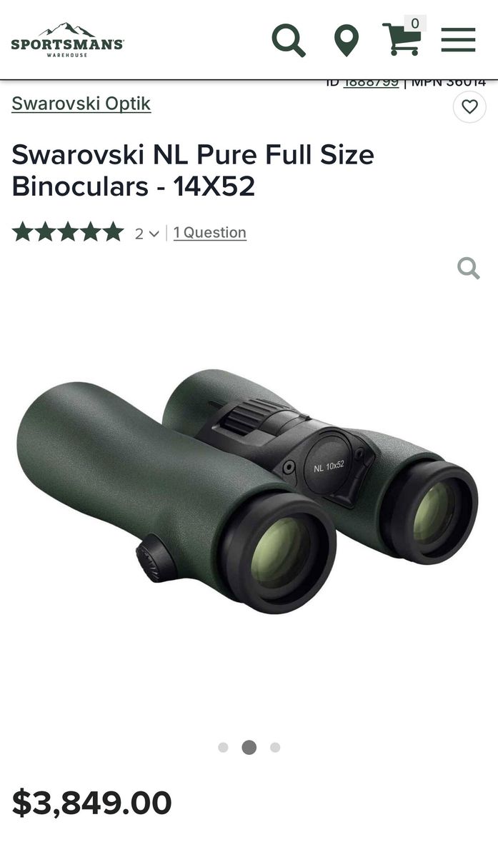 VenmoNo Trades New last fall slightly used Swarovski 14X52 NL Pure’s. These are without a doubt the best glass money can buy. I am also including a Marsupial Medium Bino case. Still have the box for warranty. It also has an Outdoorsman’s stud installed for glassing. Will also include an Outdoorsman’s post to connect to your tri pod.