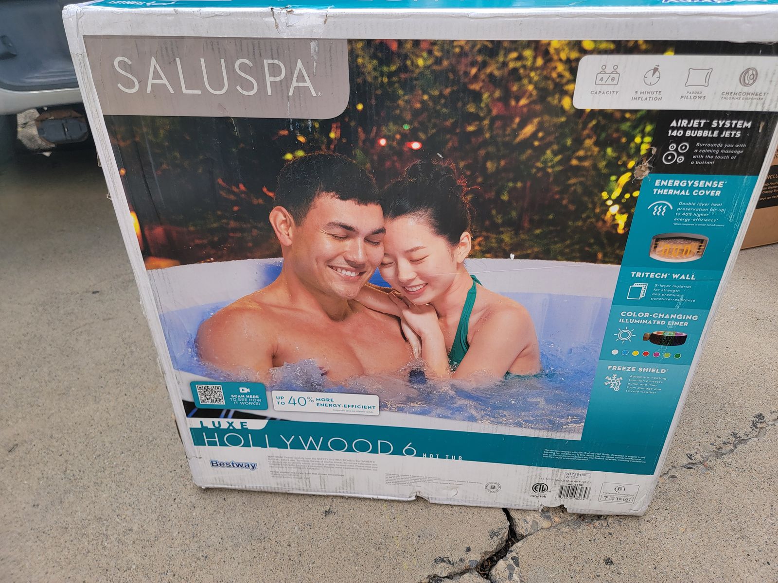 New in Box Bestway SaluSpa Hollywood EnergySense Luxe AirJet Round Inflatable 4 to 6 Adult Hot Tub with Heater, Filter, 2 Covers, and 140 AirJet System.