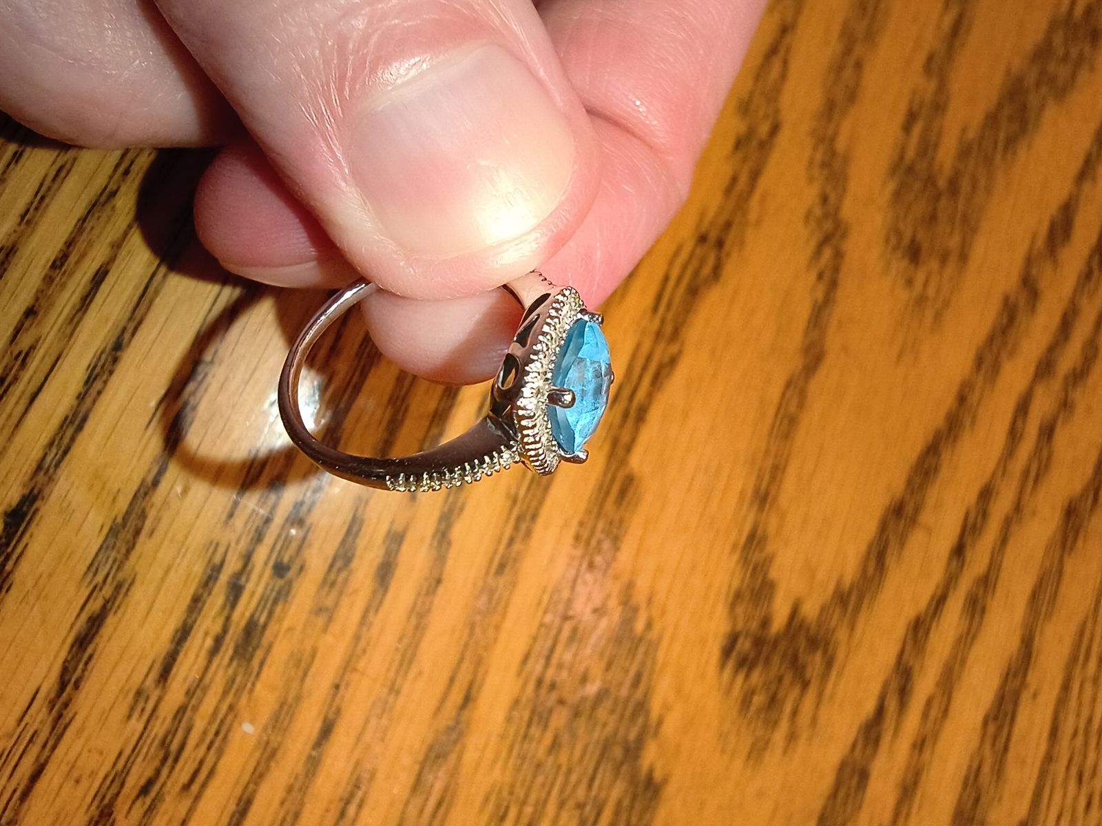 10k White Gold ring, blue topaz 7MM(1-3/8 ct.v t.w.) and diamonds 1/5 c.t. t.w) size 5.5