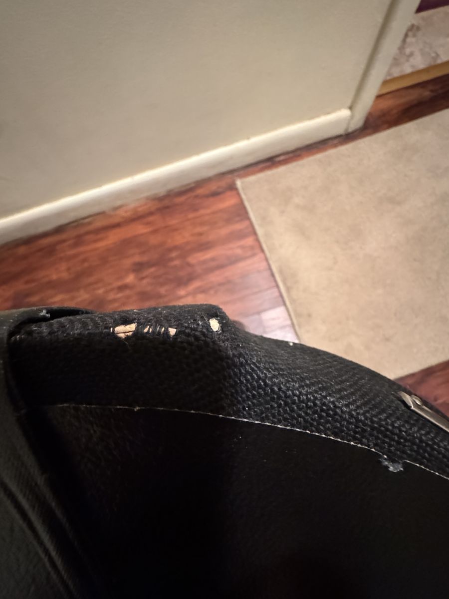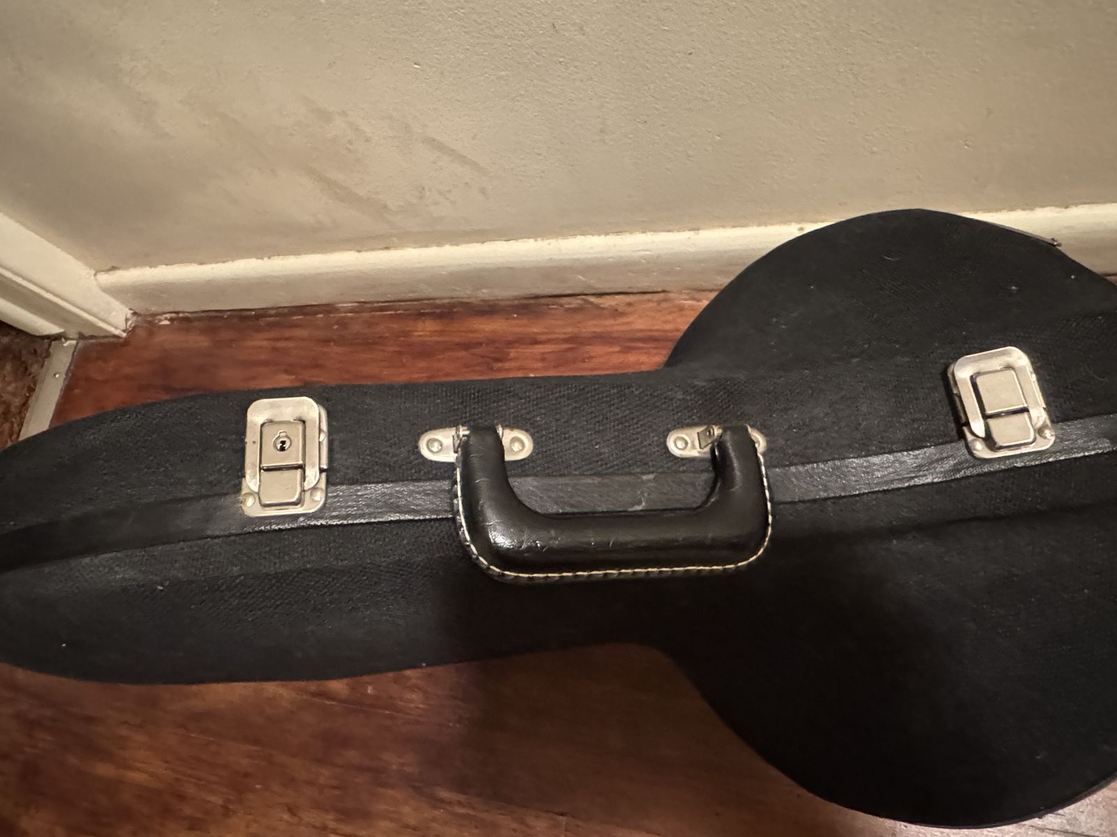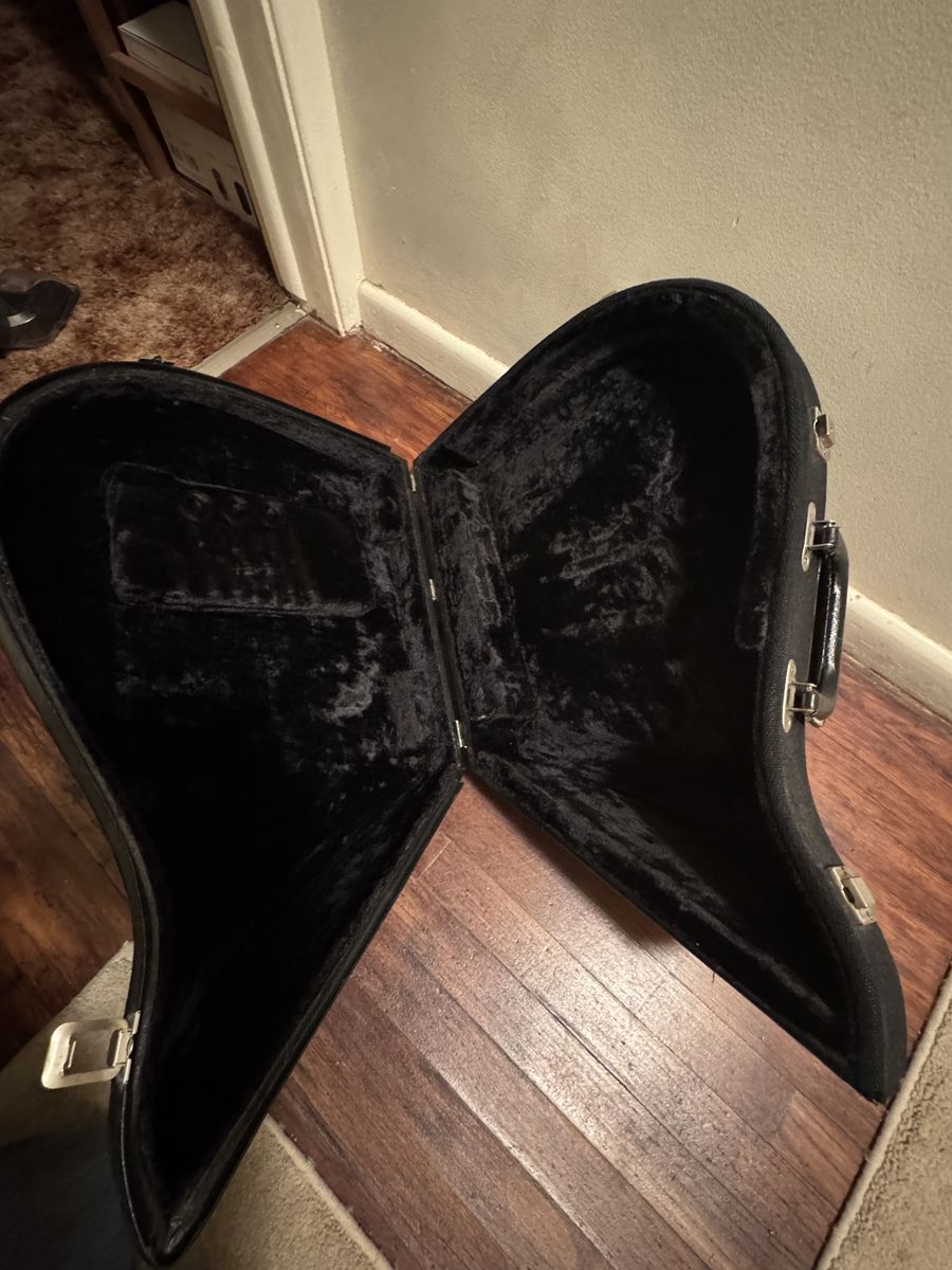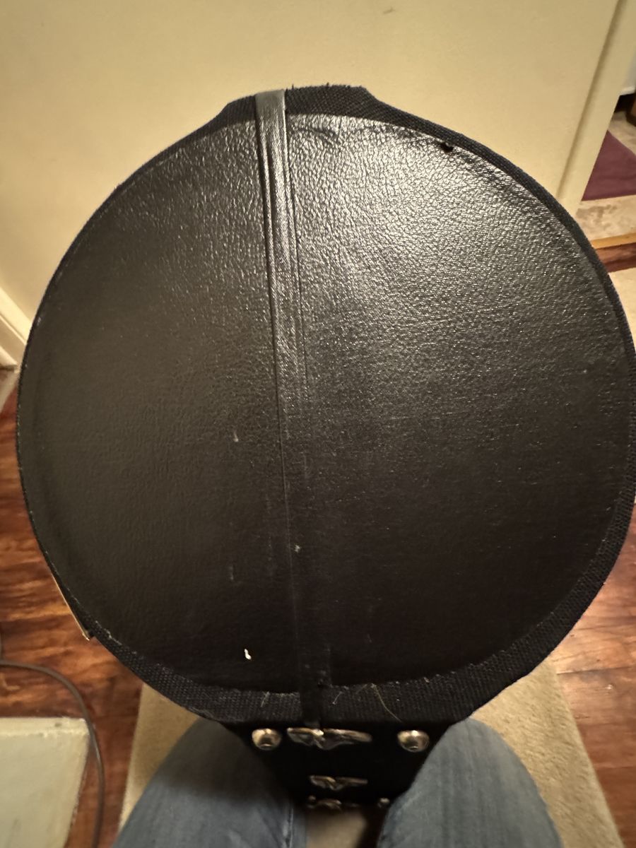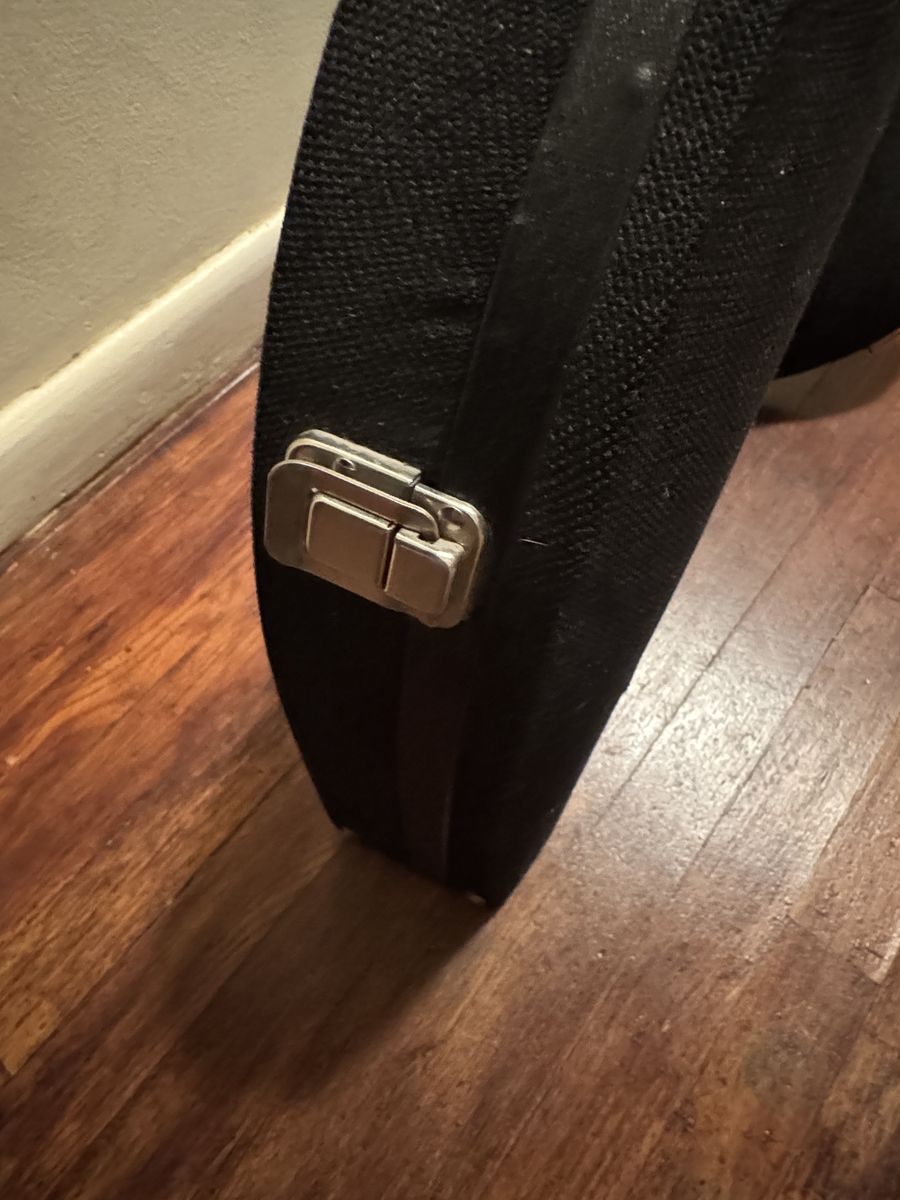 VenmoOutside is covered with a canvas material, unknown maker and it does have a scuff on the bottom side (see Pictures), and there are 3 latches as well as a long lasting handle. It is a sturdy well made case. Other then the scuff mark there is no other damage.