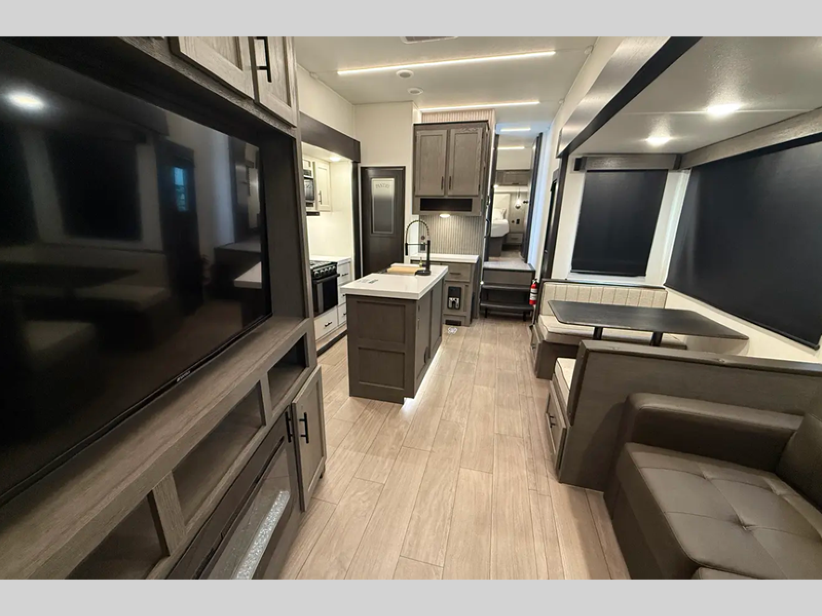 There's not much about this fifth wheel that you won't love! Your guests can claim the rear bunkhouse suite with a 54" x 74" bunk/bed, a 60" x 80" loft bunk, and a half bath for added convenience. You'll have the front private bedroom all to yourselves, and the spacious full bath is close by for easy nighttime use. Everyone can meet in the combined kitchen and living area that is made open thanks to the dual opposing slides. There is also a kitchen island with a trash can, a hutch, a booth dinette, and a tri-fold sofa across from the fireplace; how cozy!