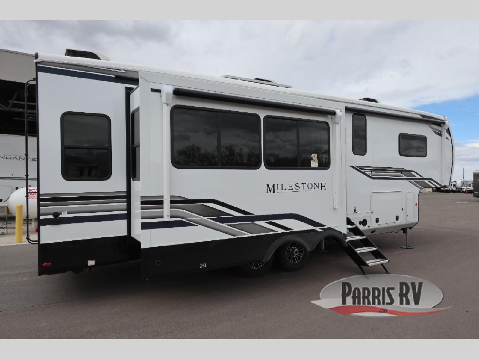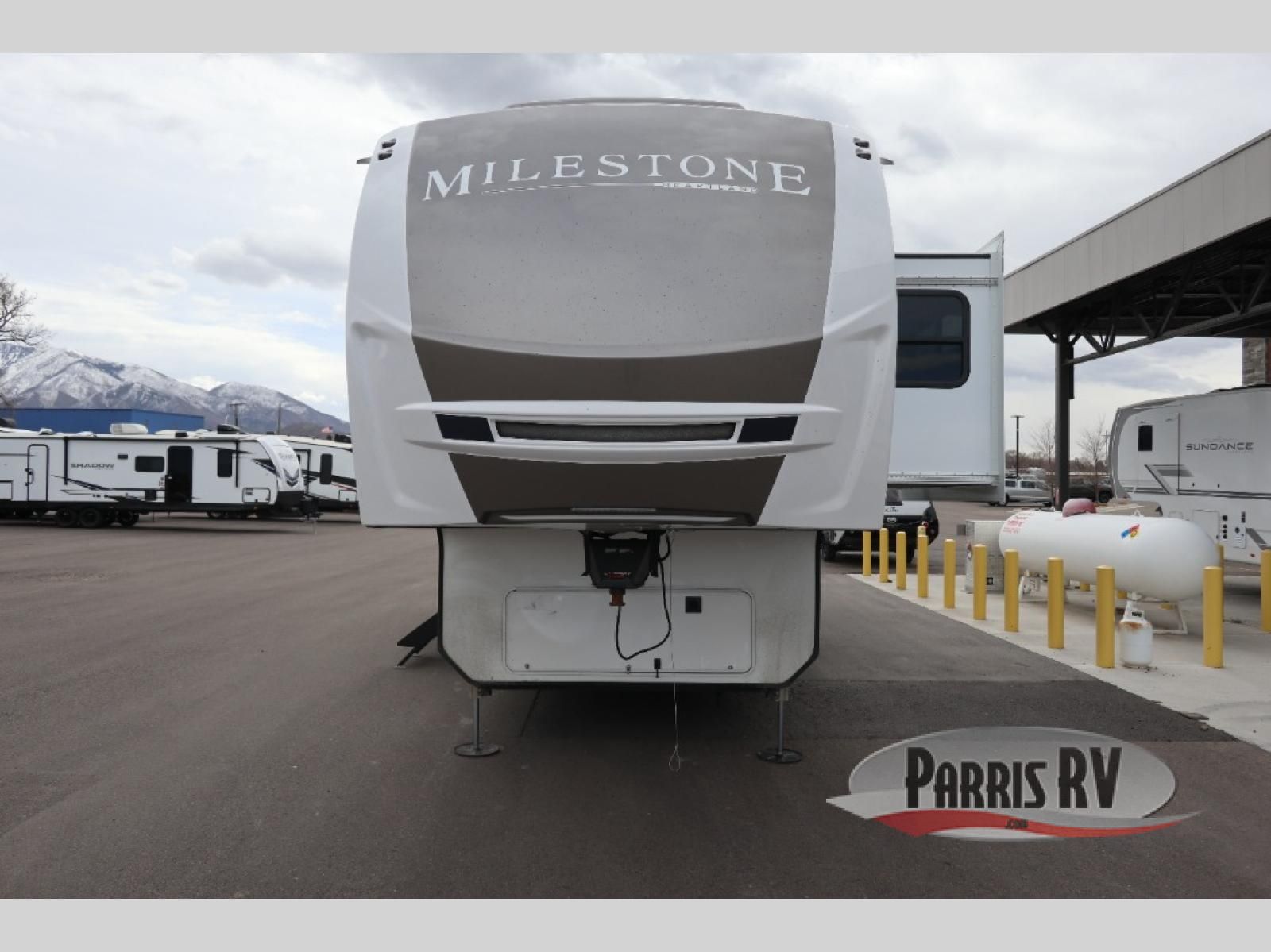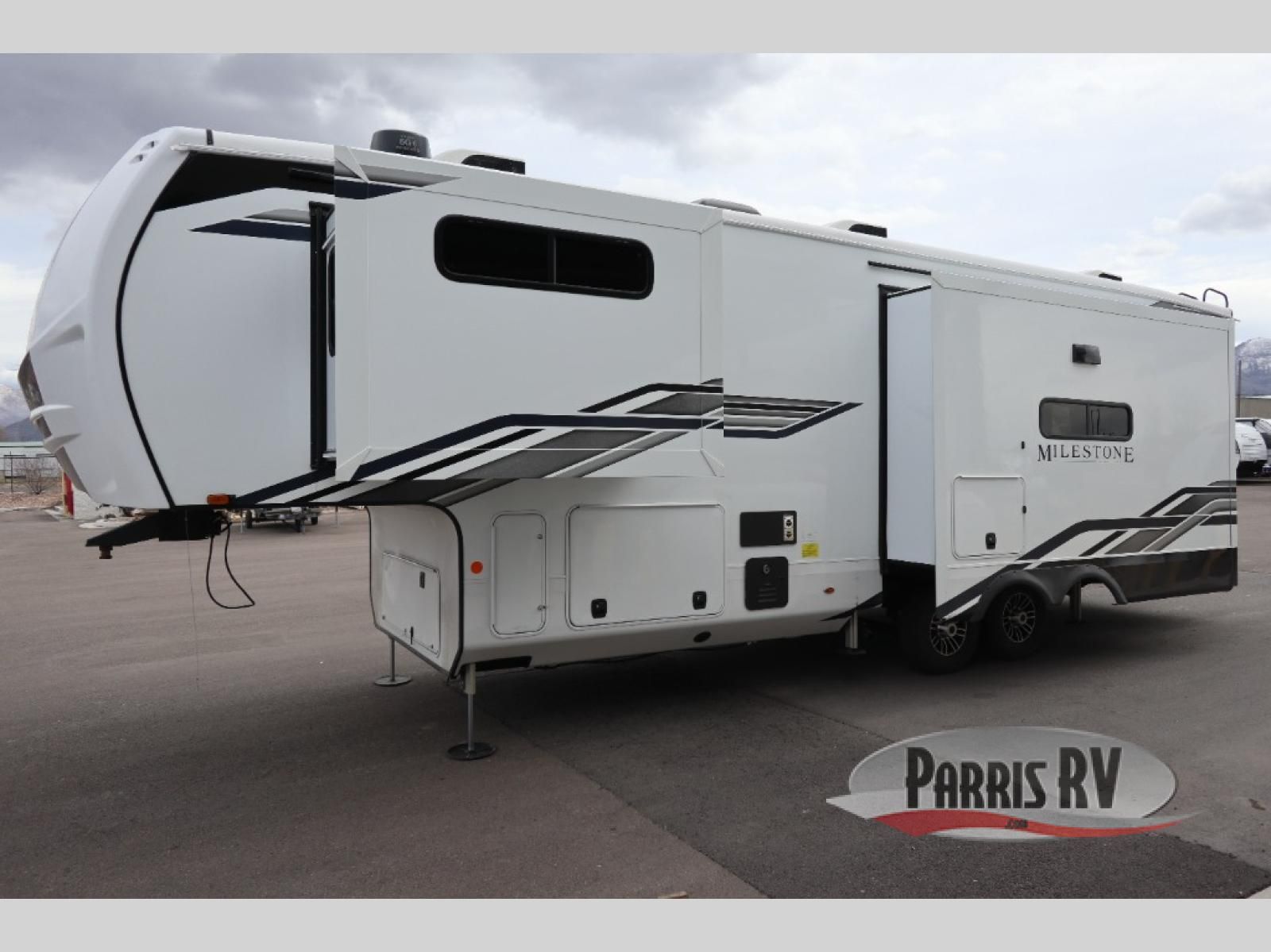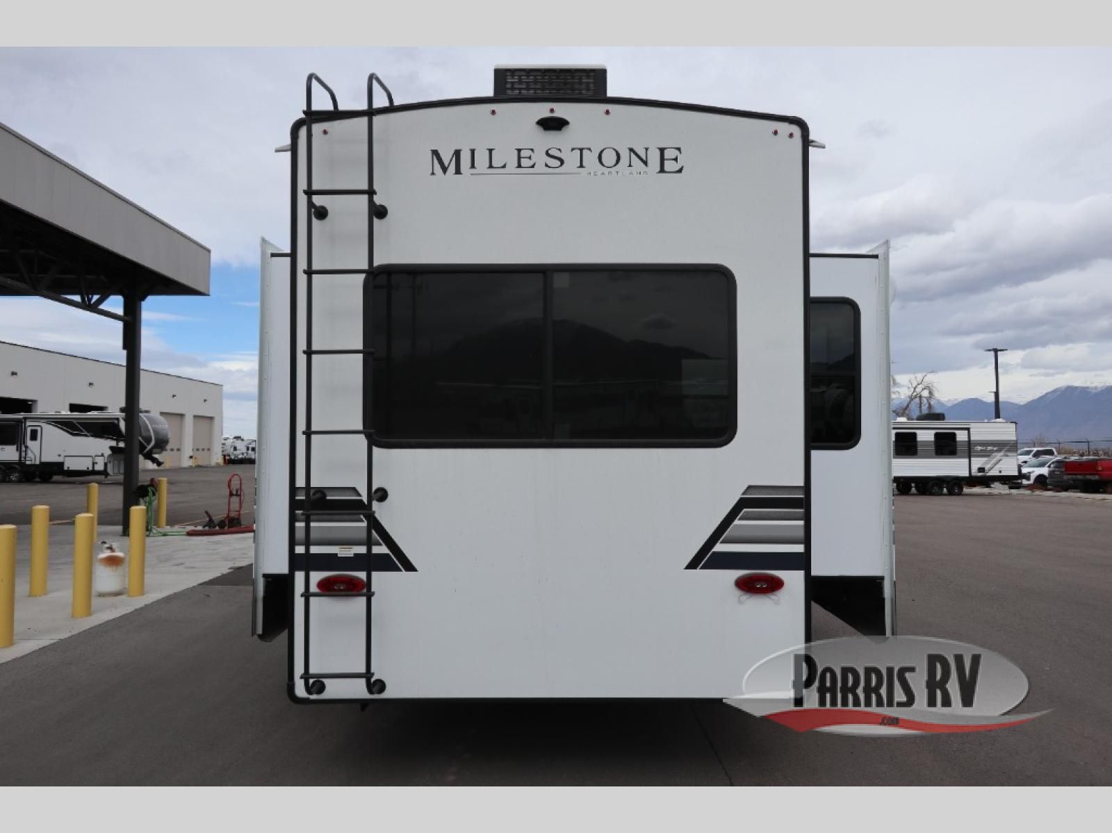 The Heartland Milestone is a full-profile luxury fifth wheel that is ready to help you make the most of your adventures! You will find a TrussTXL Roof System with Alpha roof membrane system offering quality exterior protection, and the Power Up Solar that includes a 200 watt solar panel will let you go off-grid when the adventure calls for it. The upgraded MORryde Step Above entrance steps will help you enter your unit with ease, and the 6-point hydraulic auto-leveling system comes standard to help you keep your unit secure while camping. The interior kitchen has some great features, like residential solid surface countertops and a large farmhouse sink. There are roller night shades throughout each unit to have privacy and comfort.