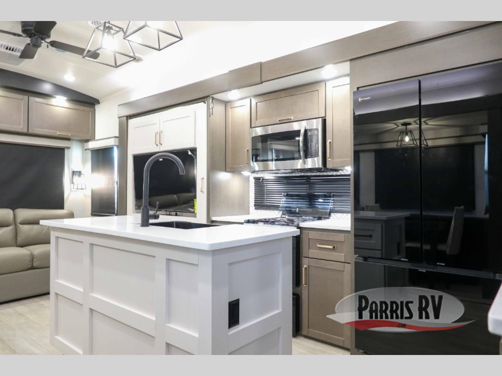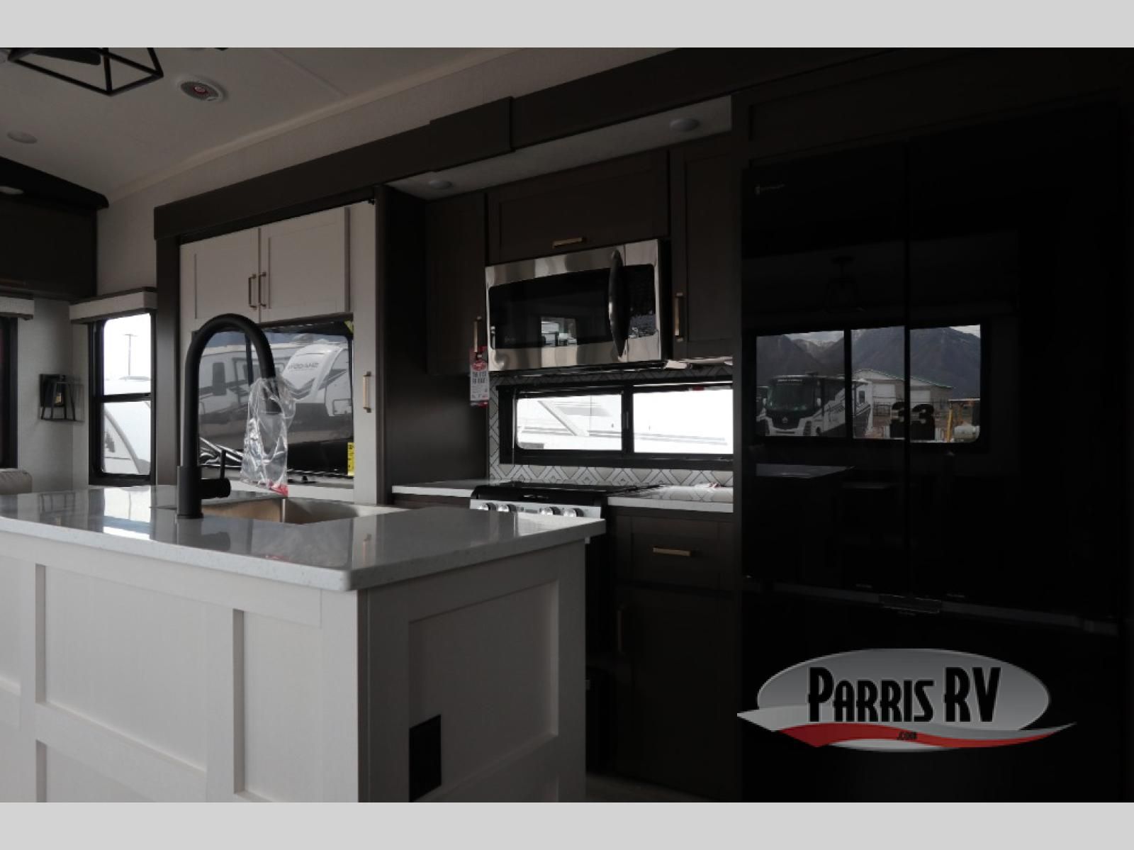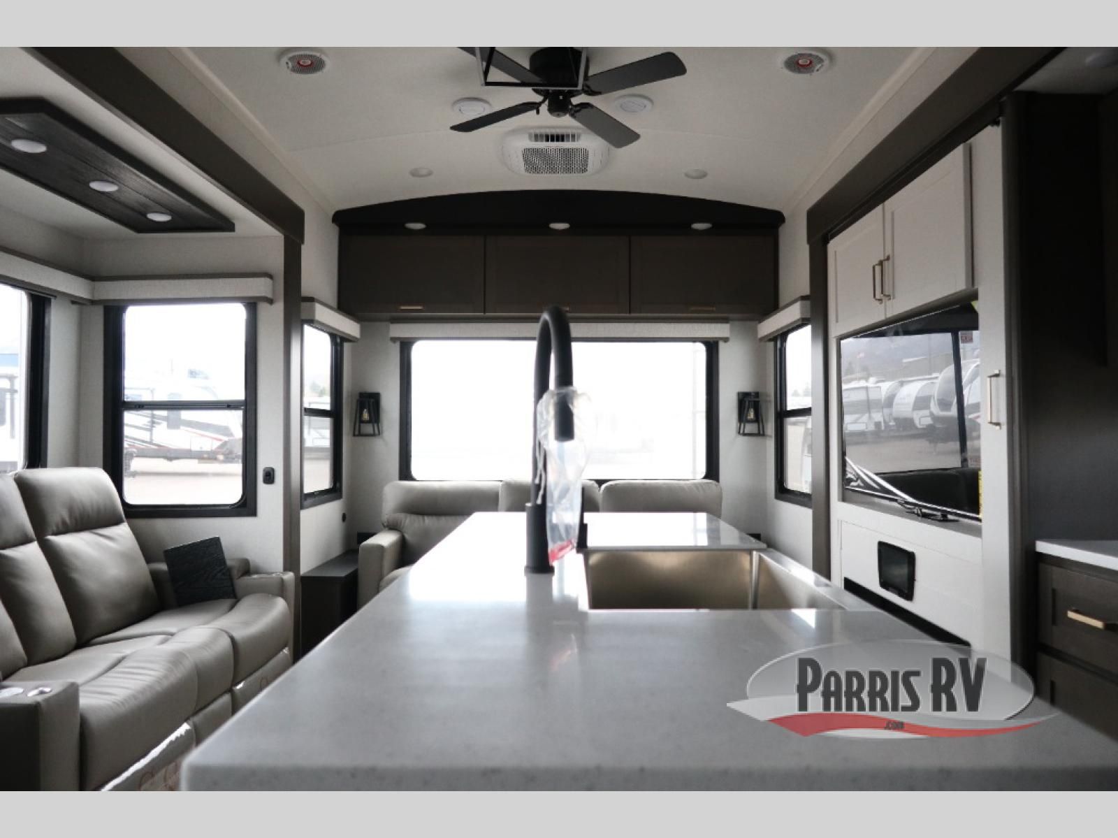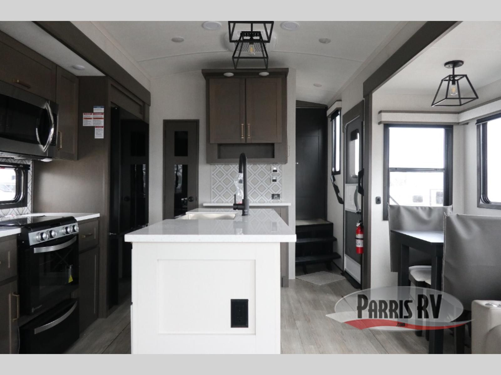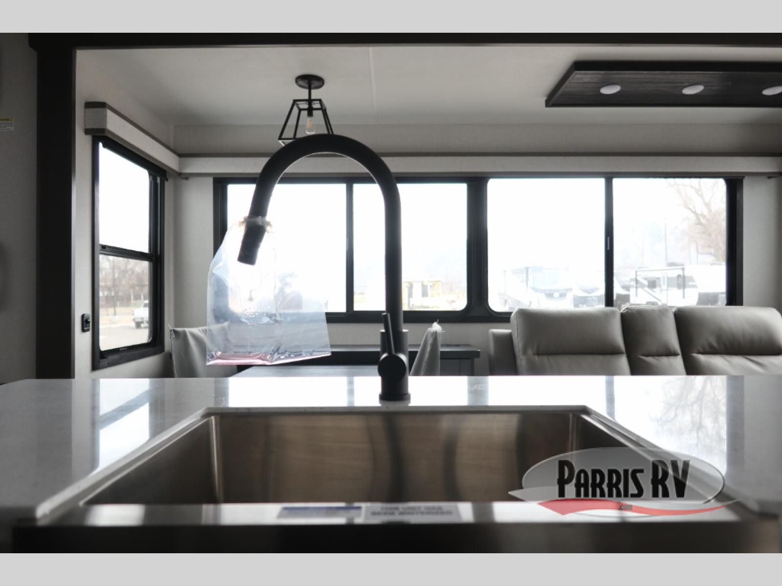 The Heartland Milestone is a full-profile luxury fifth wheel that is ready to help you make the most of your adventures! You will find a TrussTXL Roof System with Alpha roof membrane system offering quality exterior protection, and the Power Up Solar that includes a 200 watt solar panel will let you go off-grid when the adventure calls for it. The upgraded MORryde Step Above entrance steps will help you enter your unit with ease, and the 6-point hydraulic auto-leveling system comes standard to help you keep your unit secure while camping. The interior kitchen has some great features, like residential solid surface countertops and a large farmhouse sink. There are roller night shades throughout each unit to have privacy and comfort.