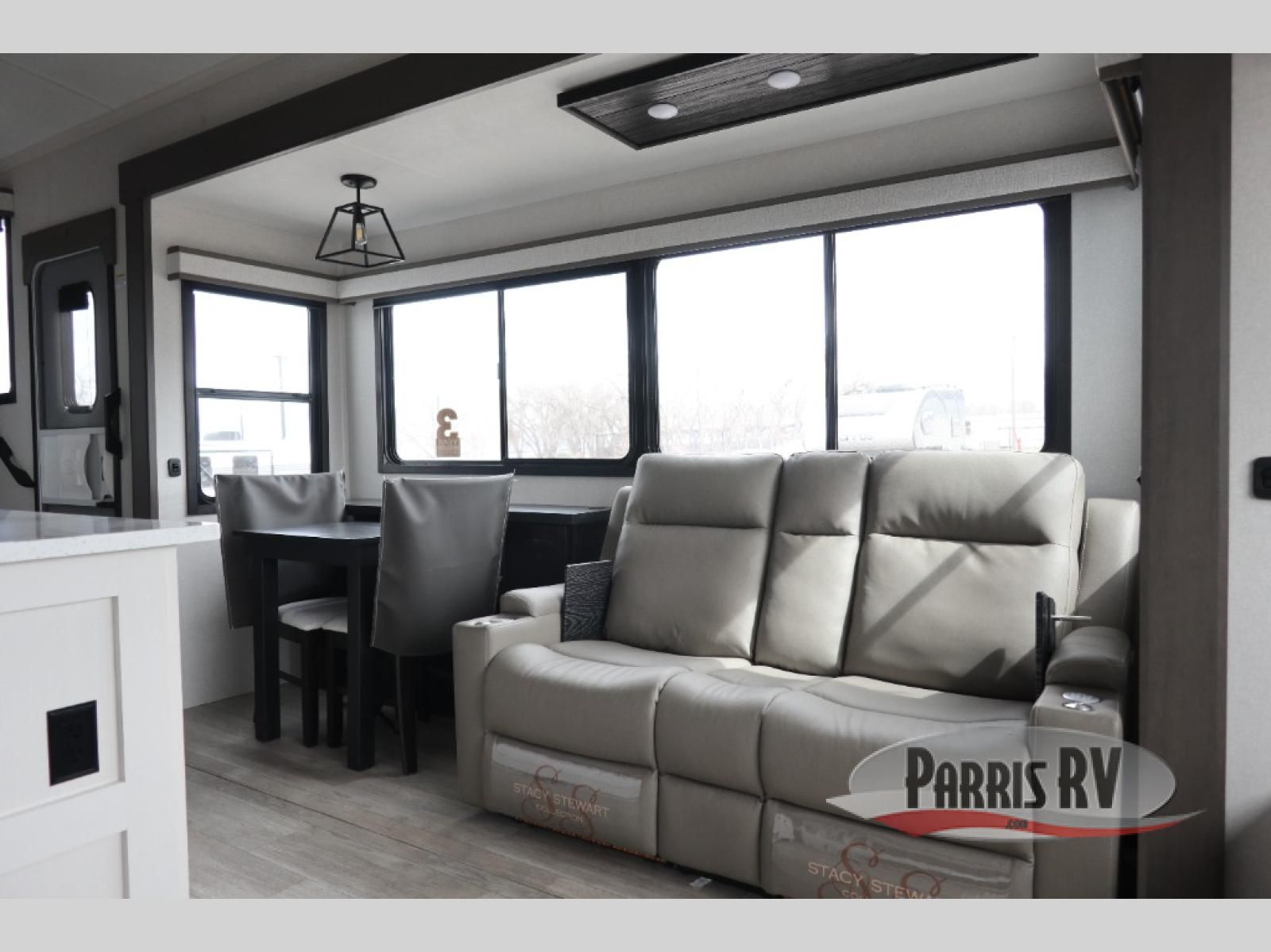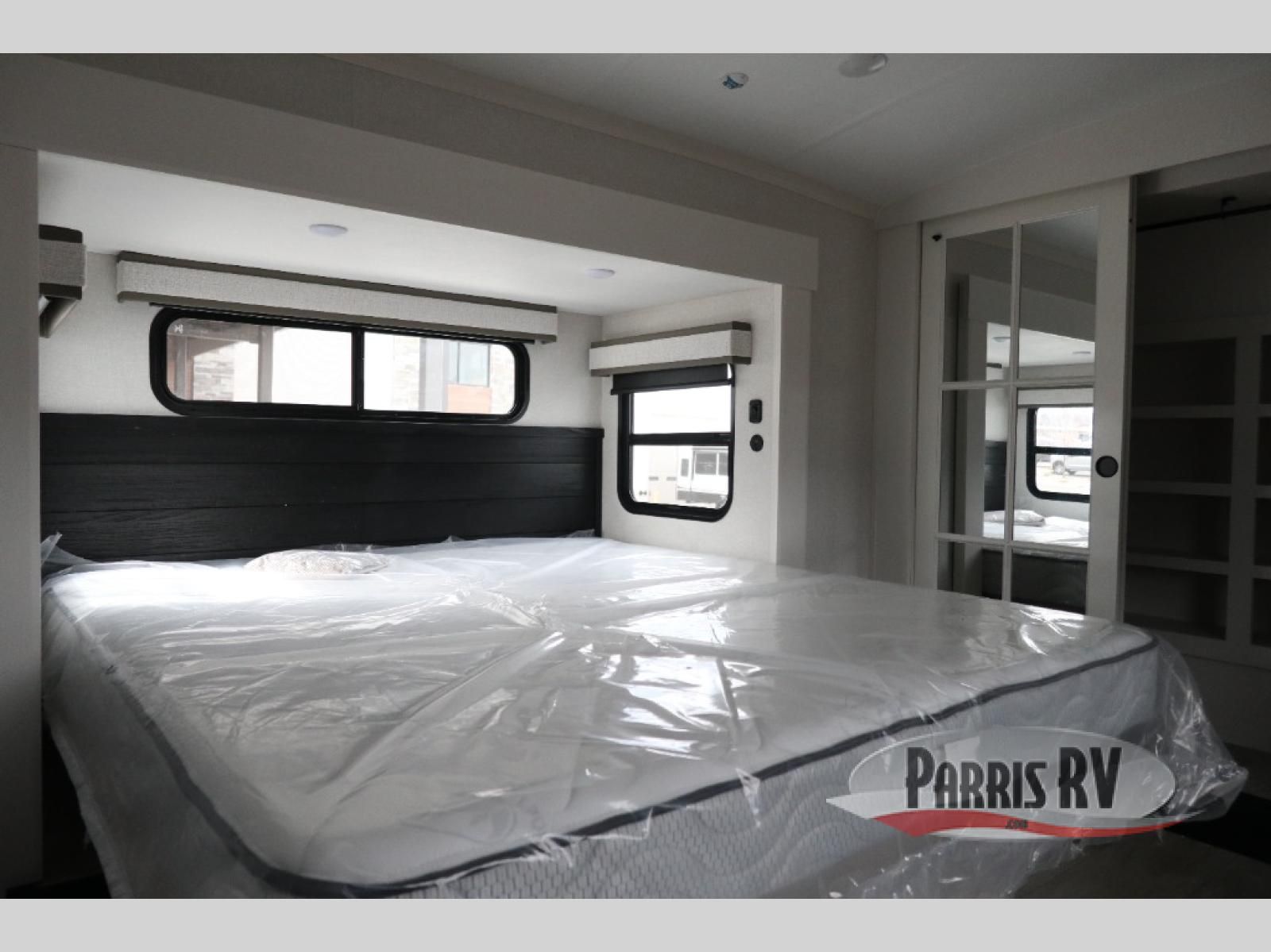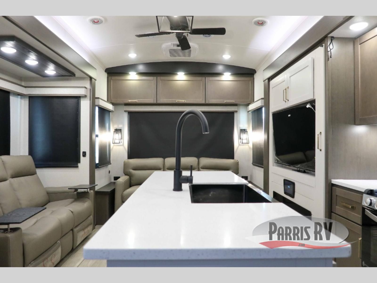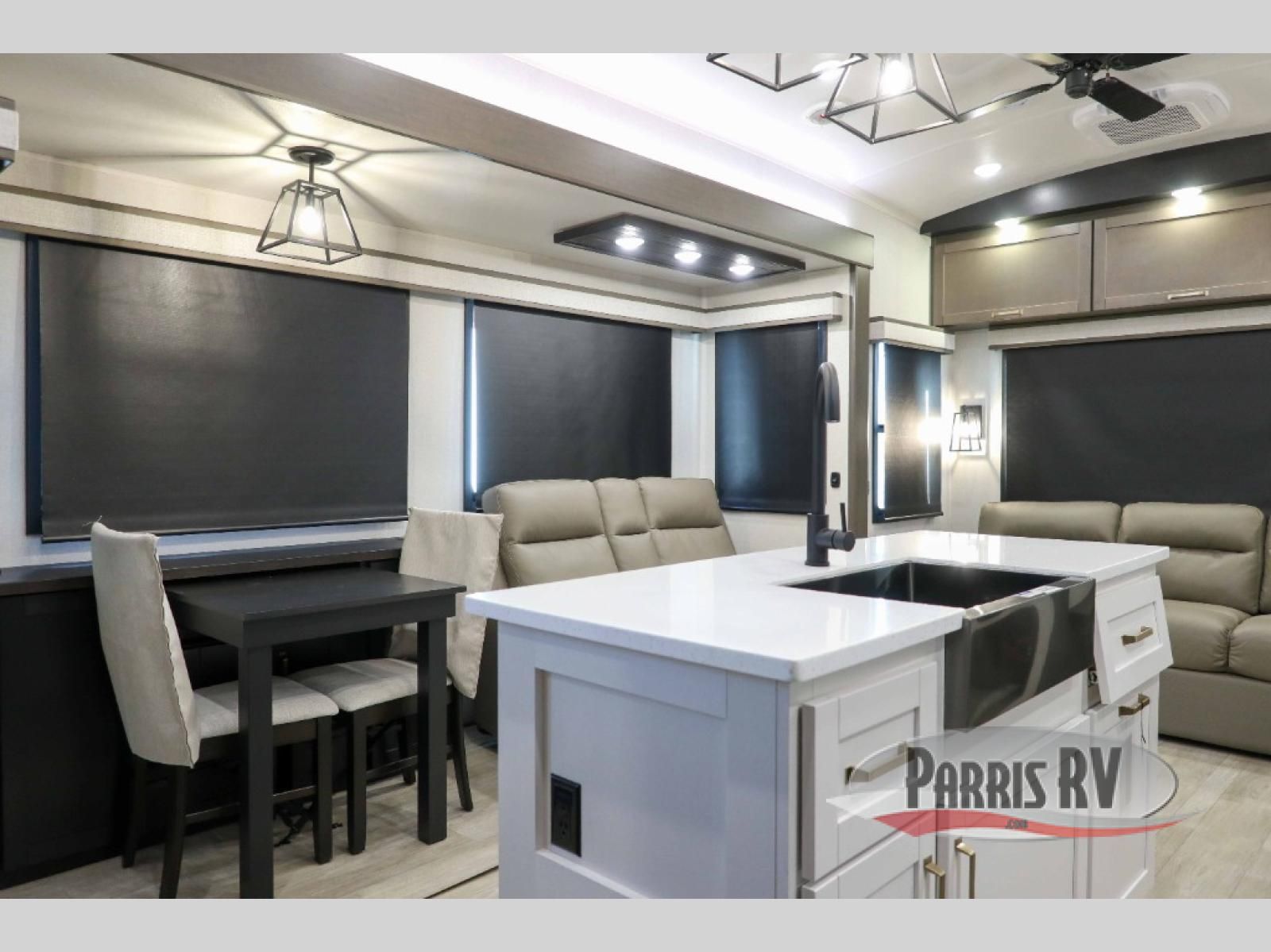 The Heartland Milestone is a full-profile luxury fifth wheel that is ready to help you make the most of your adventures! You will find a TrussTXL Roof System with Alpha roof membrane system offering quality exterior protection, and the Power Up Solar that includes a 200 watt solar panel will let you go off-grid when the adventure calls for it. The upgraded MORryde Step Above entrance steps will help you enter your unit with ease, and the 6-point hydraulic auto-leveling system comes standard to help you keep your unit secure while camping. The interior kitchen has some great features, like residential solid surface countertops and a large farmhouse sink. There are roller night shades throughout each unit to have privacy and comfort.