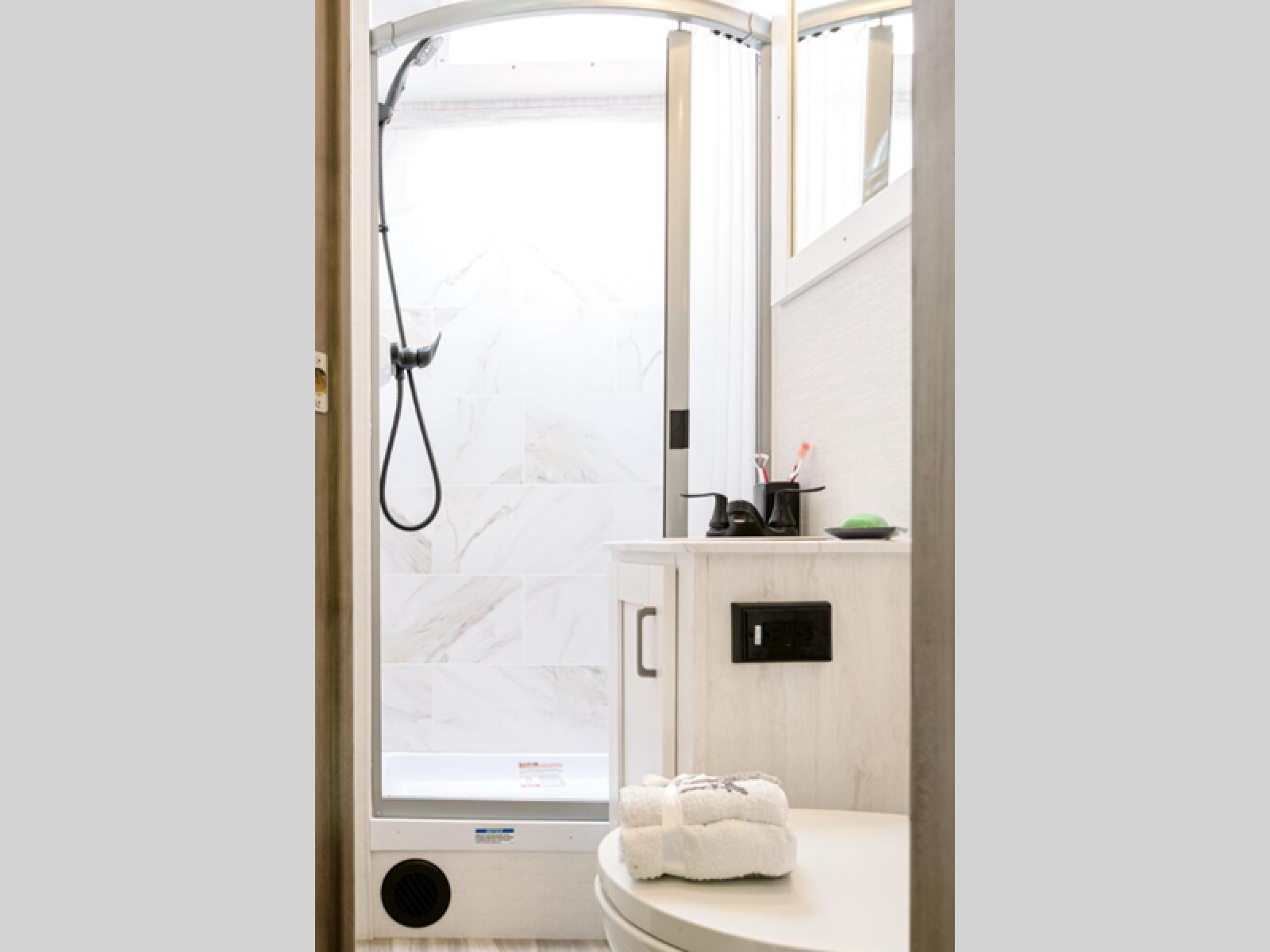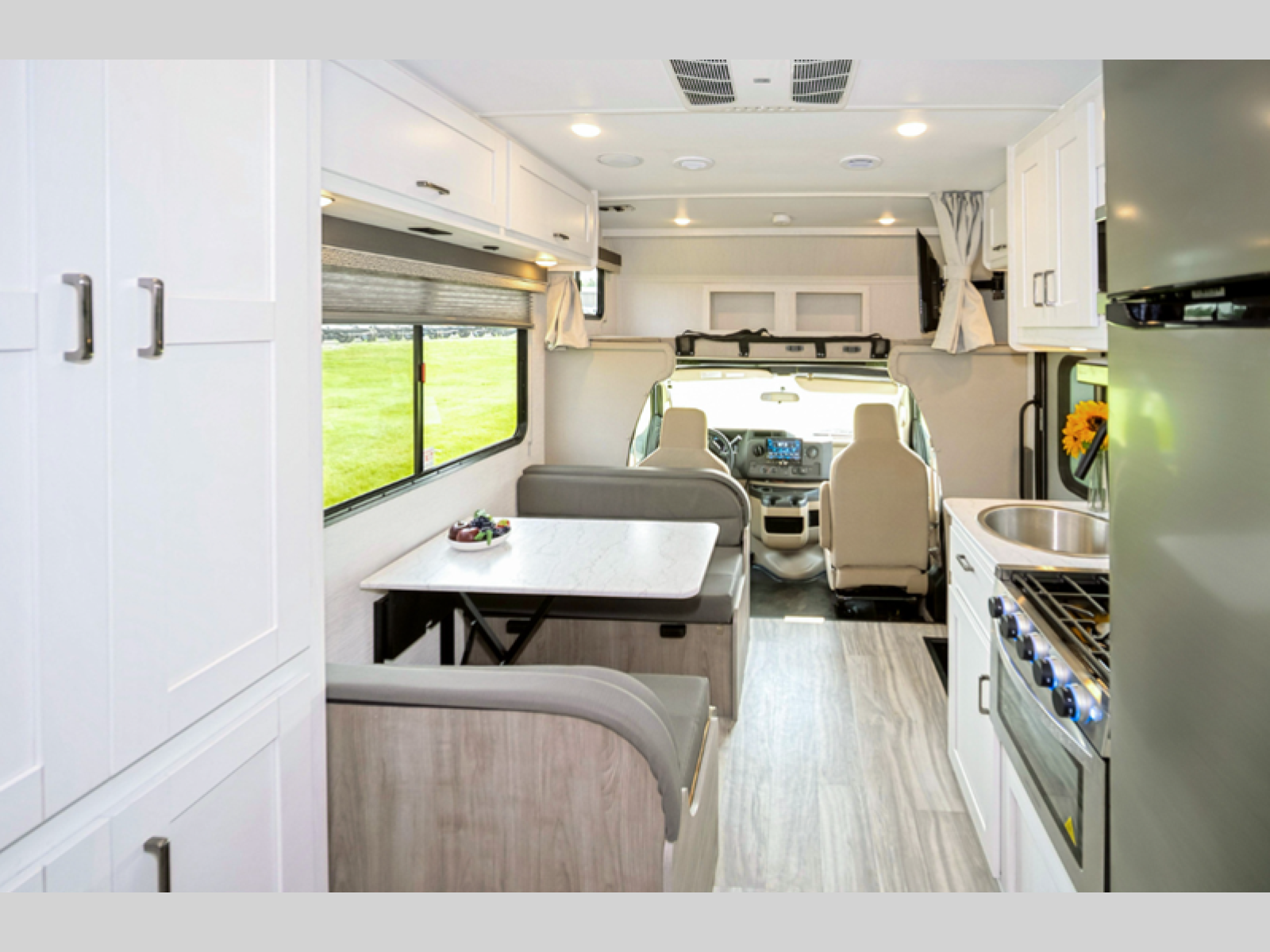 Looking for sleeping space for five, extra storage space, and loads of comfort in your next motorhome? This motorhome gives you a double-door basement storage allowing you to bring extra gear and an interior wardrobe and overhead cabinets so you can travel for a weekend getaway or a month-long vacation. You will have your own bed while your guests or kids sleep on the overhead bunk and booth dinette, and you will also be able to make meals in the galley kitchen and get cleaned up in your own full bathroom.