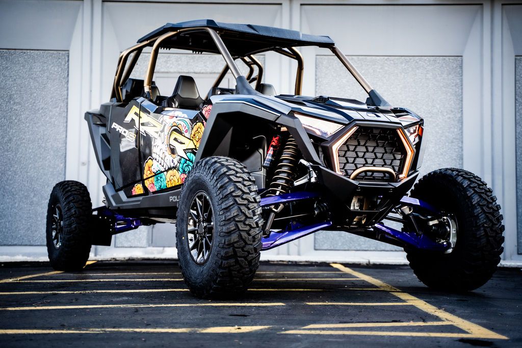 INCLUDES STREET LEGAL KIT, LIGHT BAR, MIRRORS. RZR PRO S 4 CALAVARA LIMITED EDITION Pro S STANDARD FEATURES: Fresh Cabin Air Intakes Xtreme Performance Isolated True On-Demand AWD/2WD MaxLink Suspension with 28" Usable Travel High Clearance Radius Rods 4-Pt. Harness CALAVERA EDITION TRIM INCLUDES: NEW! Limited-Edition Day of the Dead Inspired Graphics NEW! Amber RZR Fang Lights NEW! Color Matched ROPS Rockford Fosgate® Stage 4 audio DYNAMIX 2.0 with FOX® 3.0 Live Valve internal bypass shocks RIDE COMMAND off-road GPS integrated into a 7" display with rear camera Telescoping steering wheel & button controls Sport Poly Roof