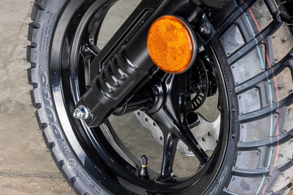 The rear wheel swingarm features twin rear shocks with 3.1 in of travel for comfortable riding both on streets and unpaved roads.