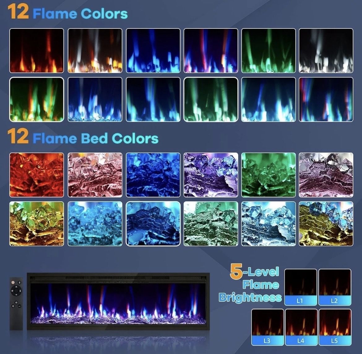 -Customizable Flame & Ember Visuals: Enjoy stunning ambiance with 12 flame colors, 12 ember bed colors, and 5 brightness levels, plus log or crystal ember options. This electric fireplace allows complete personalization, transforming any room into a visually captivating and inviting space.