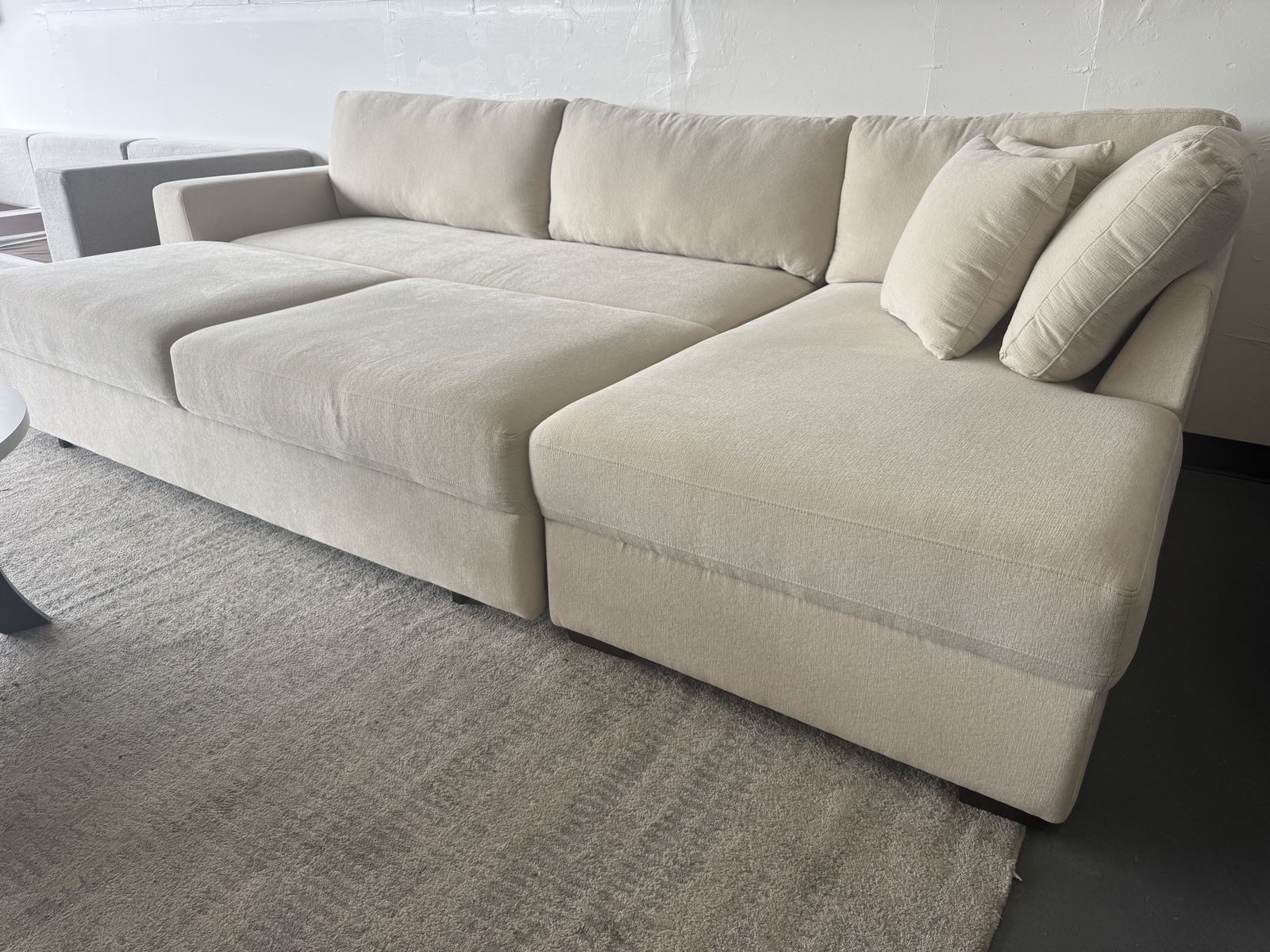 Features: Sleek, Modern Design with Wide Track Arms Extends to Create Additional Lounging Space Firm Attached Seats and Reversible Back Cushions Spacious L-Shape Layout 2 Toss Pillows Included