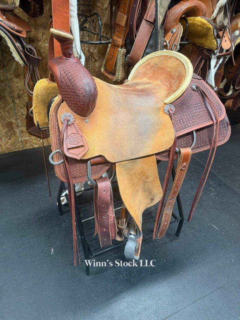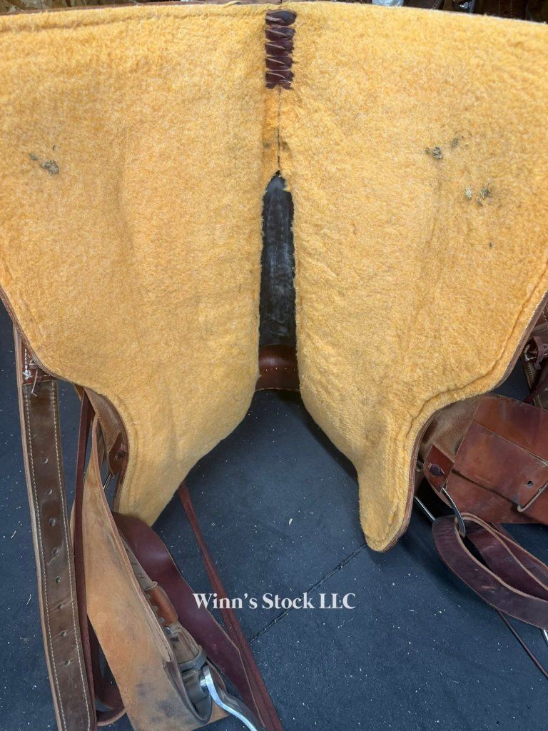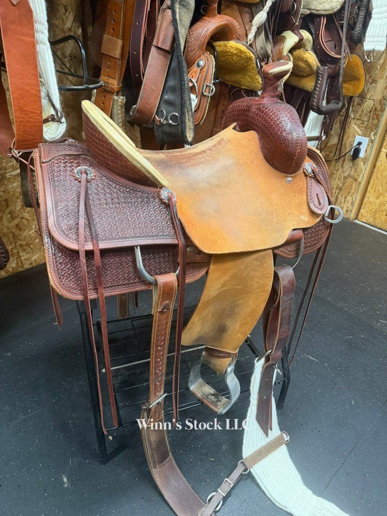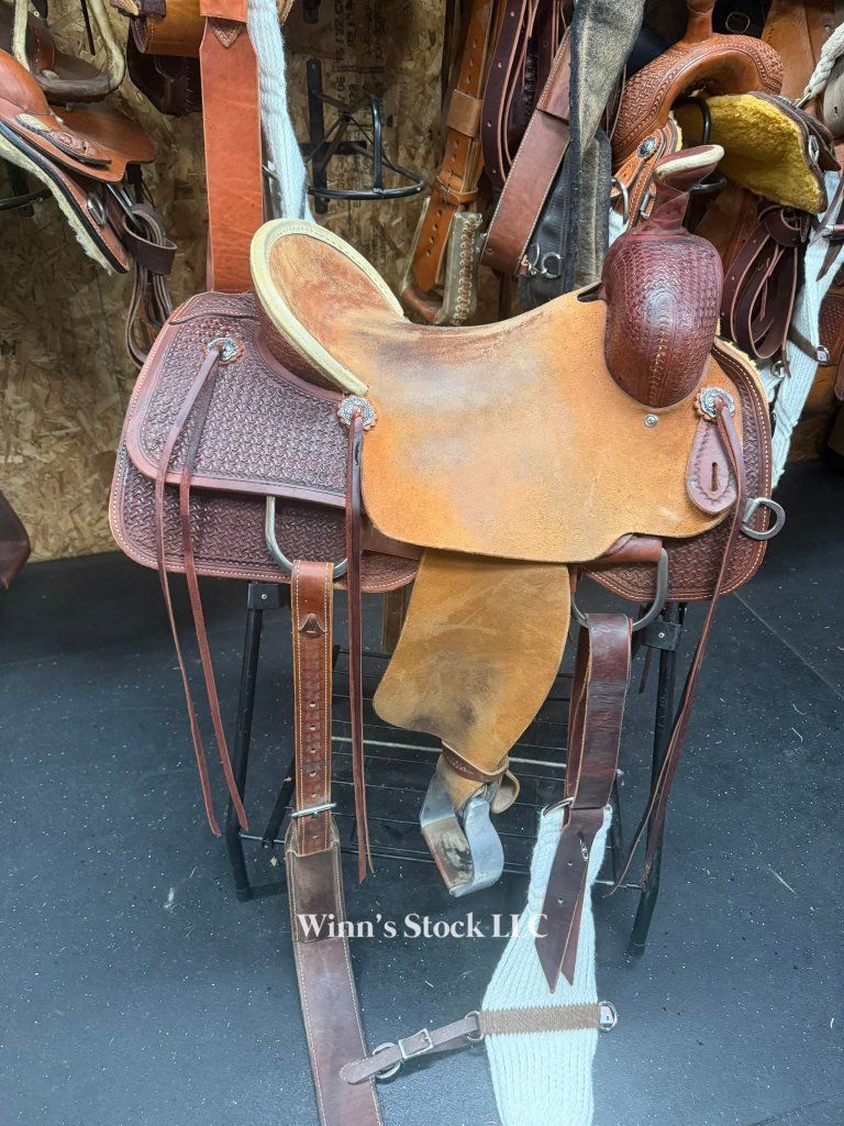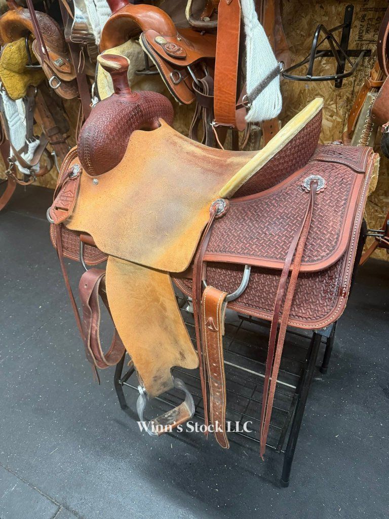 This saddle features a finished 16" rough-out hard seat, 7" gullet, FQH bars, 4" cantle with rawhide trim, 6 long leather ties, stainless rigging, breast collar dee rings, post horn, 14" swells, pre-twisted stirrups, new front cinch, and weight is around 40lbs.