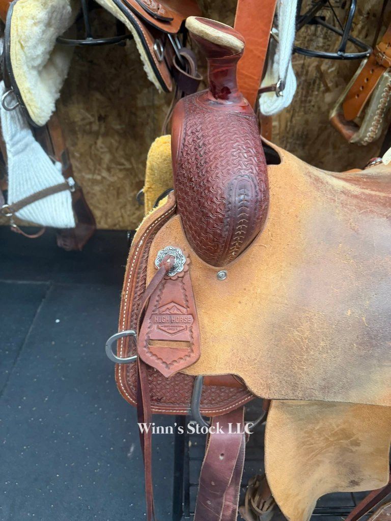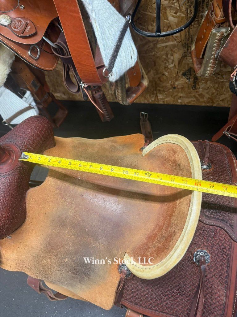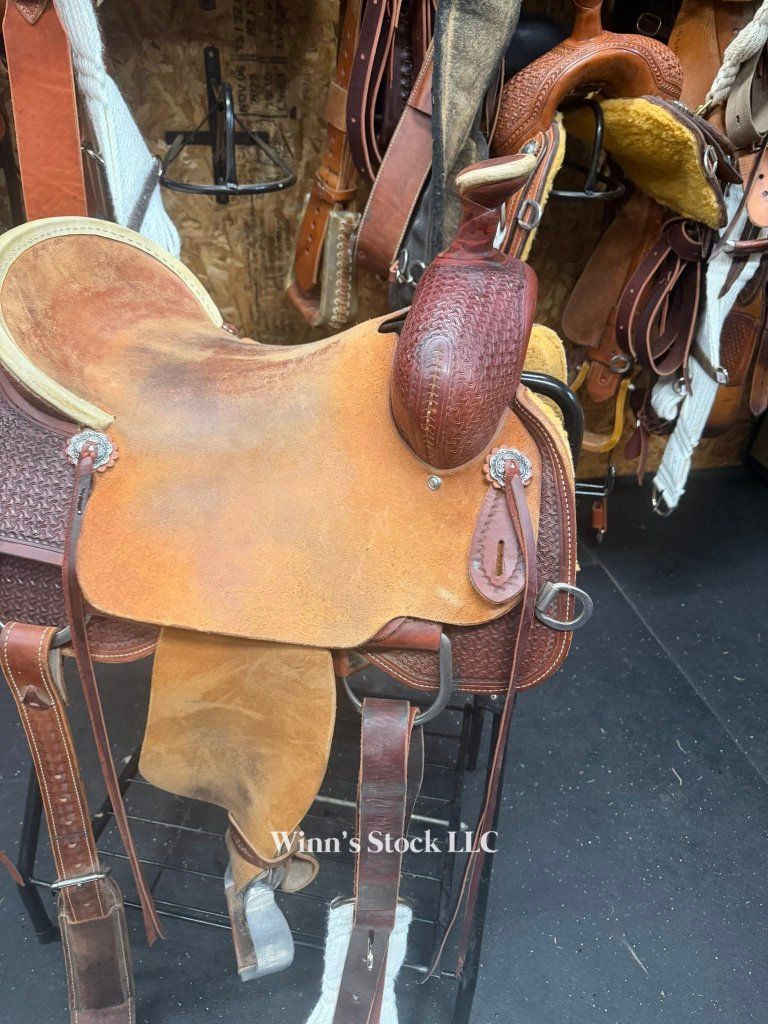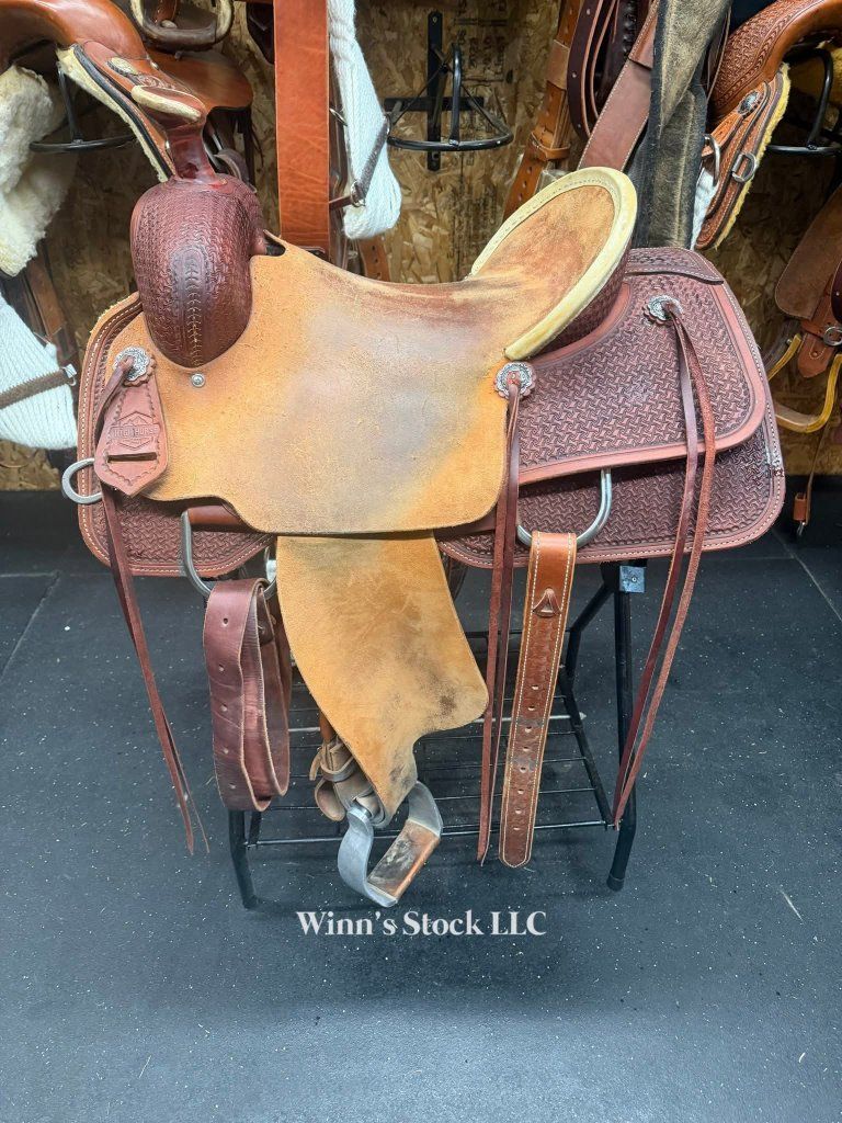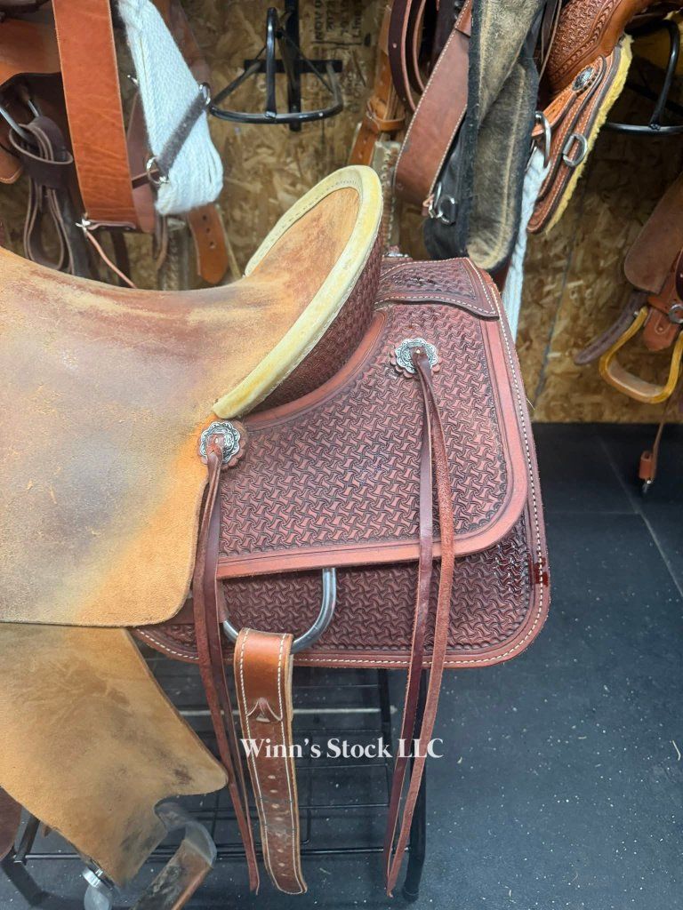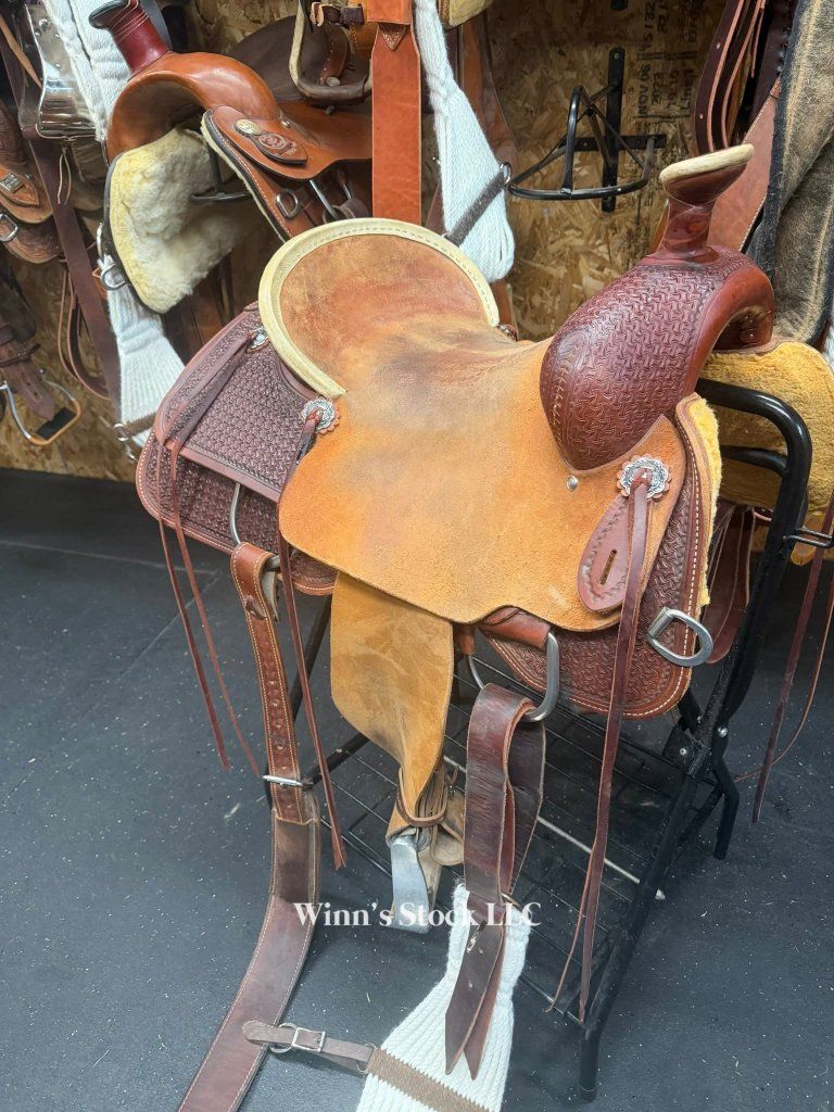 This saddle features a finished 16" rough-out hard seat, 7" gullet, FQH bars, 4" cantle with rawhide trim, 6 long leather ties, stainless rigging, breast collar dee rings, post horn, 14" swells, pre-twisted stirrups, new front cinch, and weight is around 40lbs.