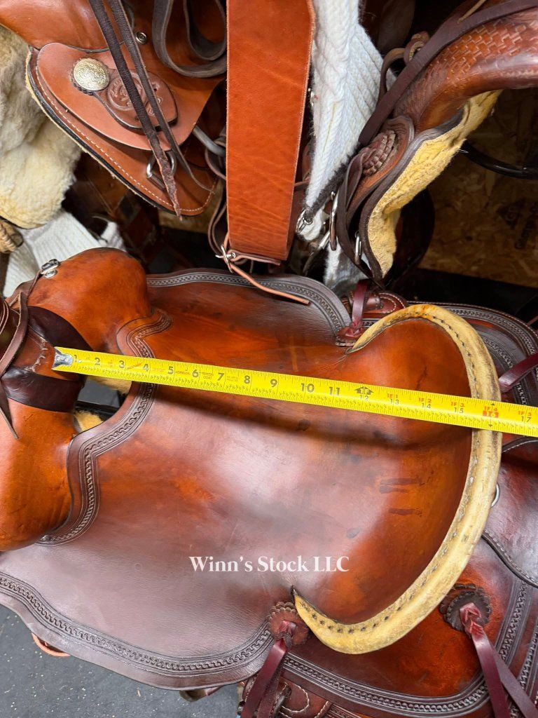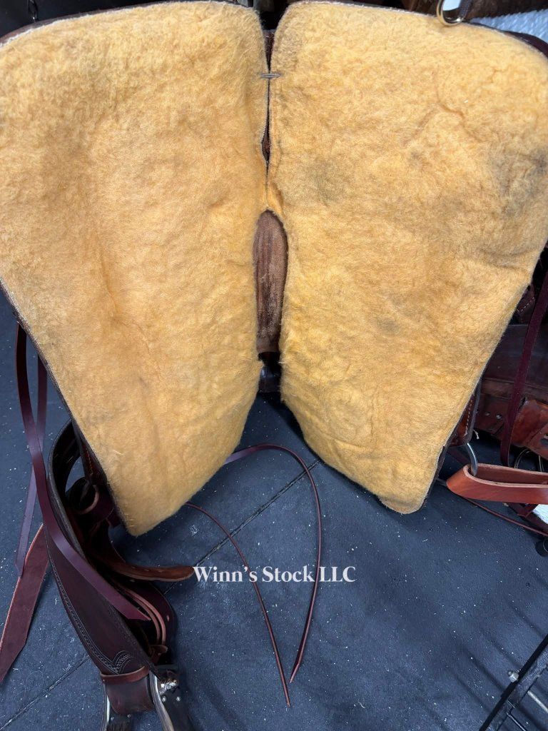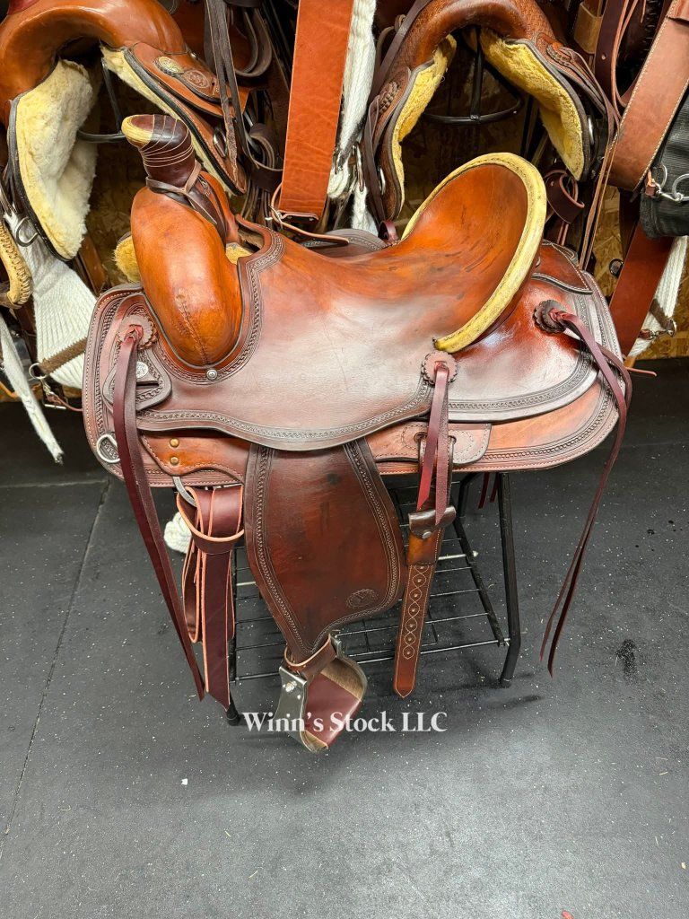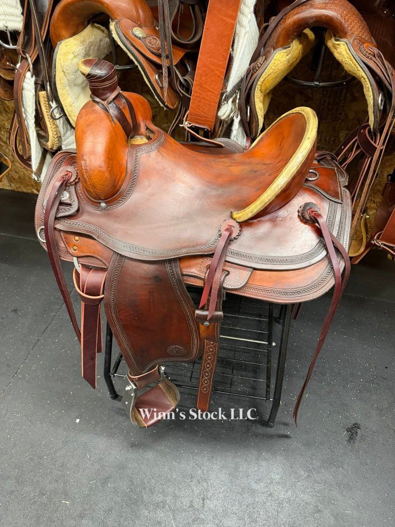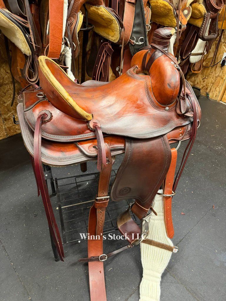 This saddle features a 16" hard seat, 6 3/4" gullet, Standard Quarter Horse bars, rawhide wrapped wood tree, 5" high back cantle with rawhide trim, 13 1/2" swells, post horn with leather dally wrap, rope strap, 6 long leather ties, new bell stirrups, new back cinch, new front cinch, fleece is good, and weight is around 36lbs.