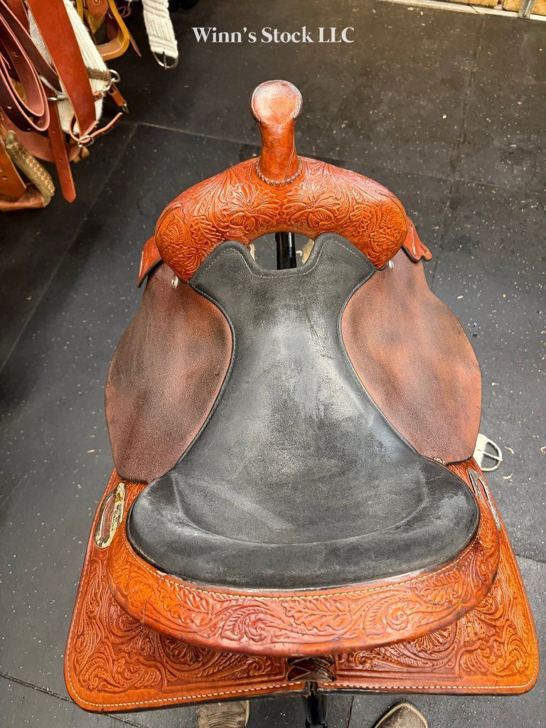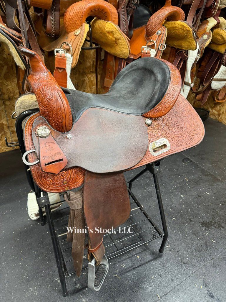 This saddle features a 16" padded leather suede seat, 5" cantle, rough-out fenders, Adjustable in-skirt rigging, pre-twisted aluminum stirrups, 7" gullet, FQH bars, fleece is good, and weight is around 23lbs.