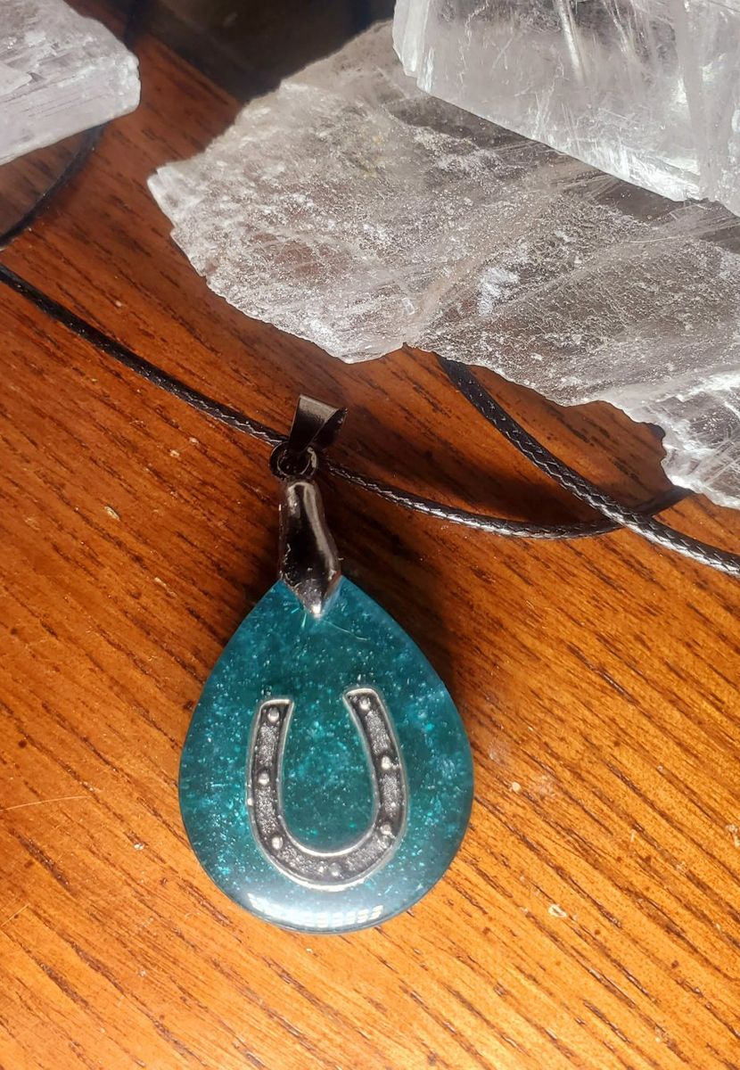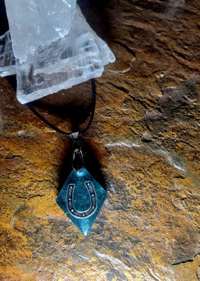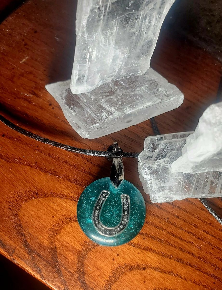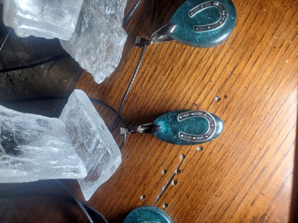 Handcrafted horseshoe pendants made with crushed Arizona selenite set in epoxy, giving each piece a subtle natural shimmer and unique look. The horseshoe symbolizes luck and protection, making these perfect for St. Patrick’s Day or everyday wear.