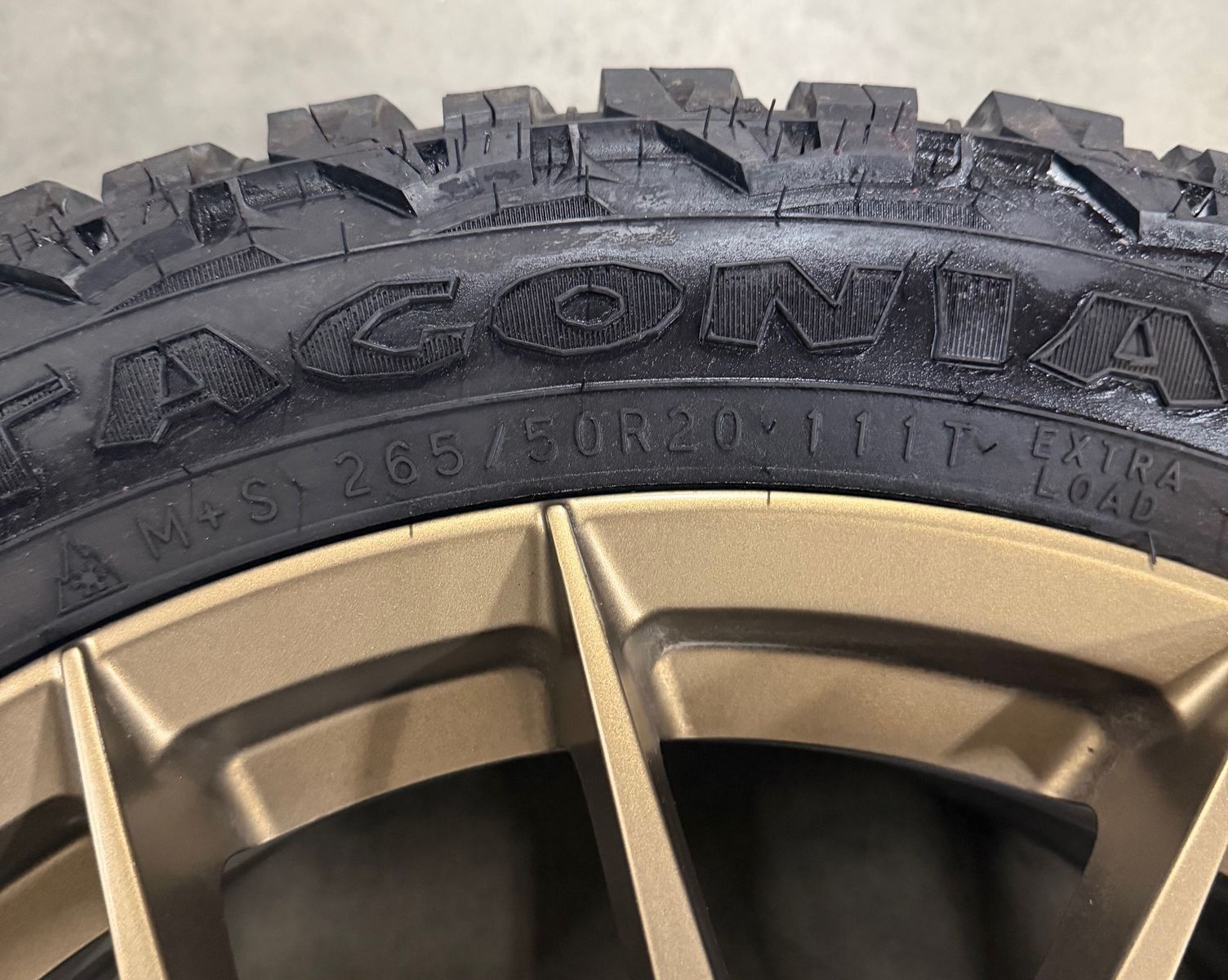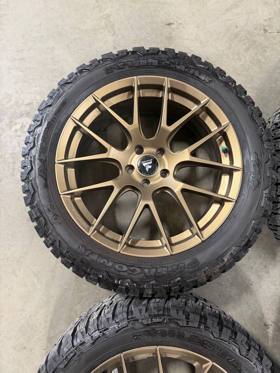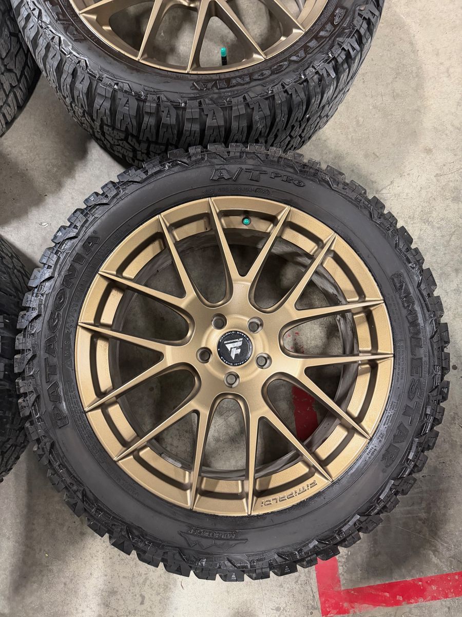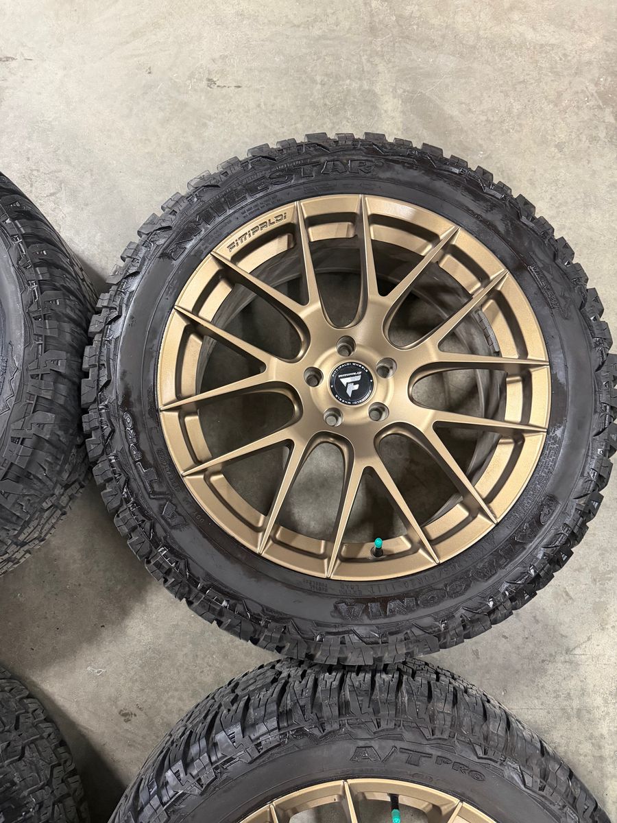 GooglePaySet of 4 20" Fittipaldi FS360 in Satin Bronze. 5x114.3 or 5x4.5 bolt pattern. 38mm Offset. Hub bore 73.1. Includes Patagonia Milestar A/T Pro tires. 265/50R20 111T with 14/32 tread. These came off of a 2024 Santa Fe. Call 801-265-9800 Mon-Fri 8:30am-5:30pm