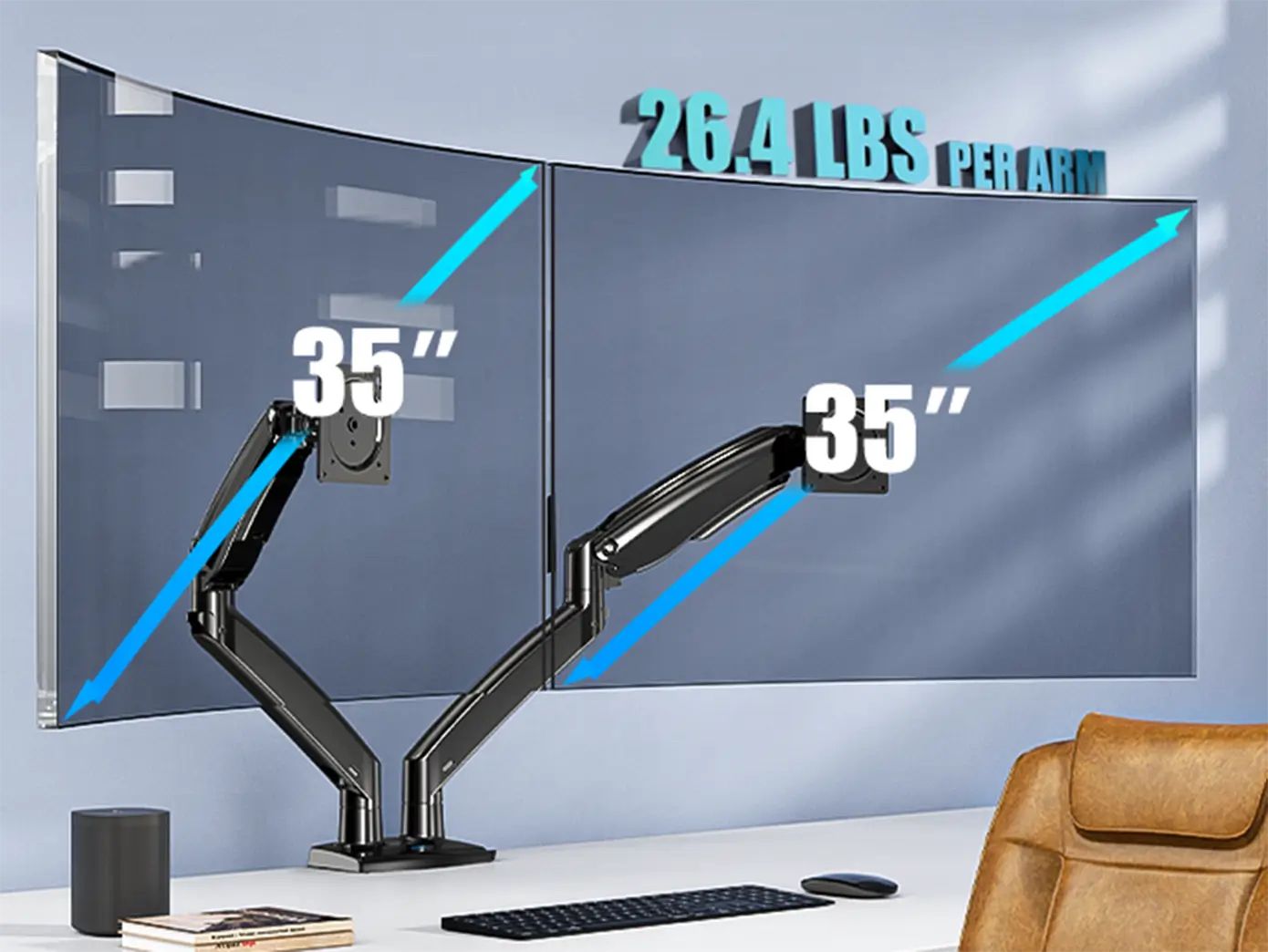 The HUANUO dual monitor mount features a heavy-duty base and strong arms, supporting screens up to 35 inches and 26.4 lbs per arm. This dual monitor stand offers complete adjustability with 360° rotation, -90° to +90° swivel, and -45° to +85° tilt. Customize your monitor angles for enhanced comfort and productivity.