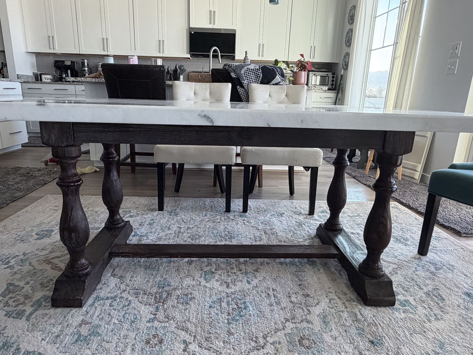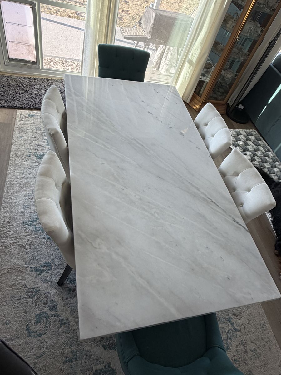 ZelleMarble top dining table and chairs. Seats 6. Will sell as a 7 piece set or the table individually.