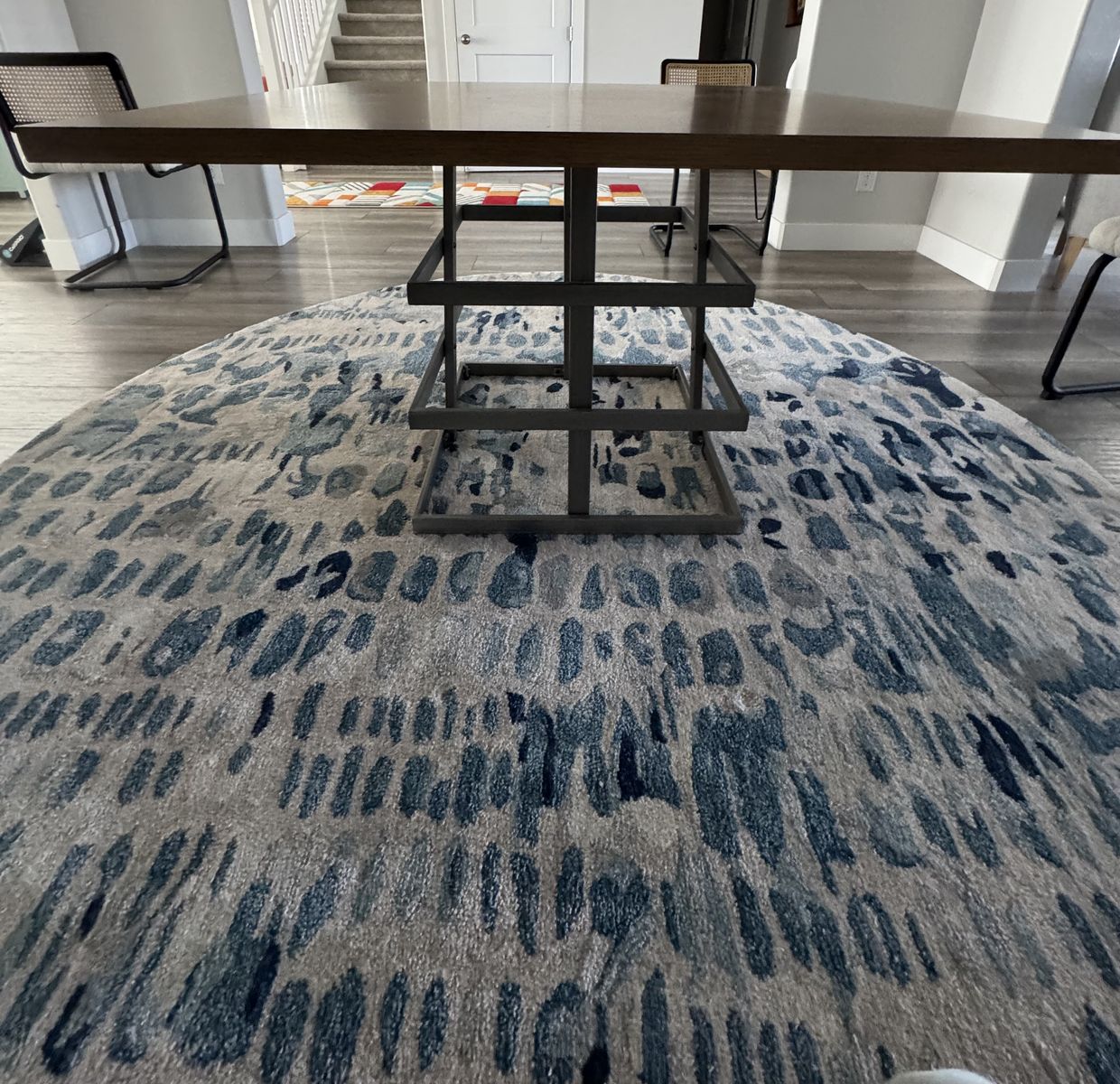 VenmoMetal framed base with beautifully designed natraul wood slab. Spacious table for 4, owned 5 years and too small for current space.