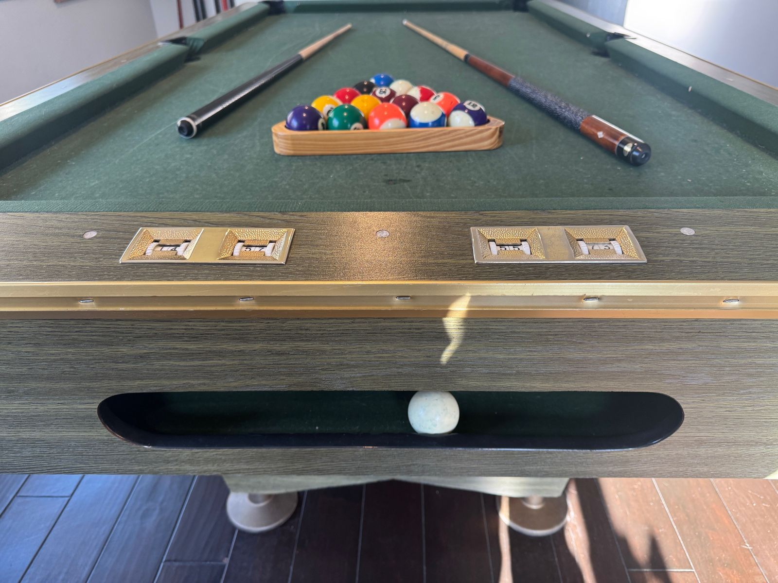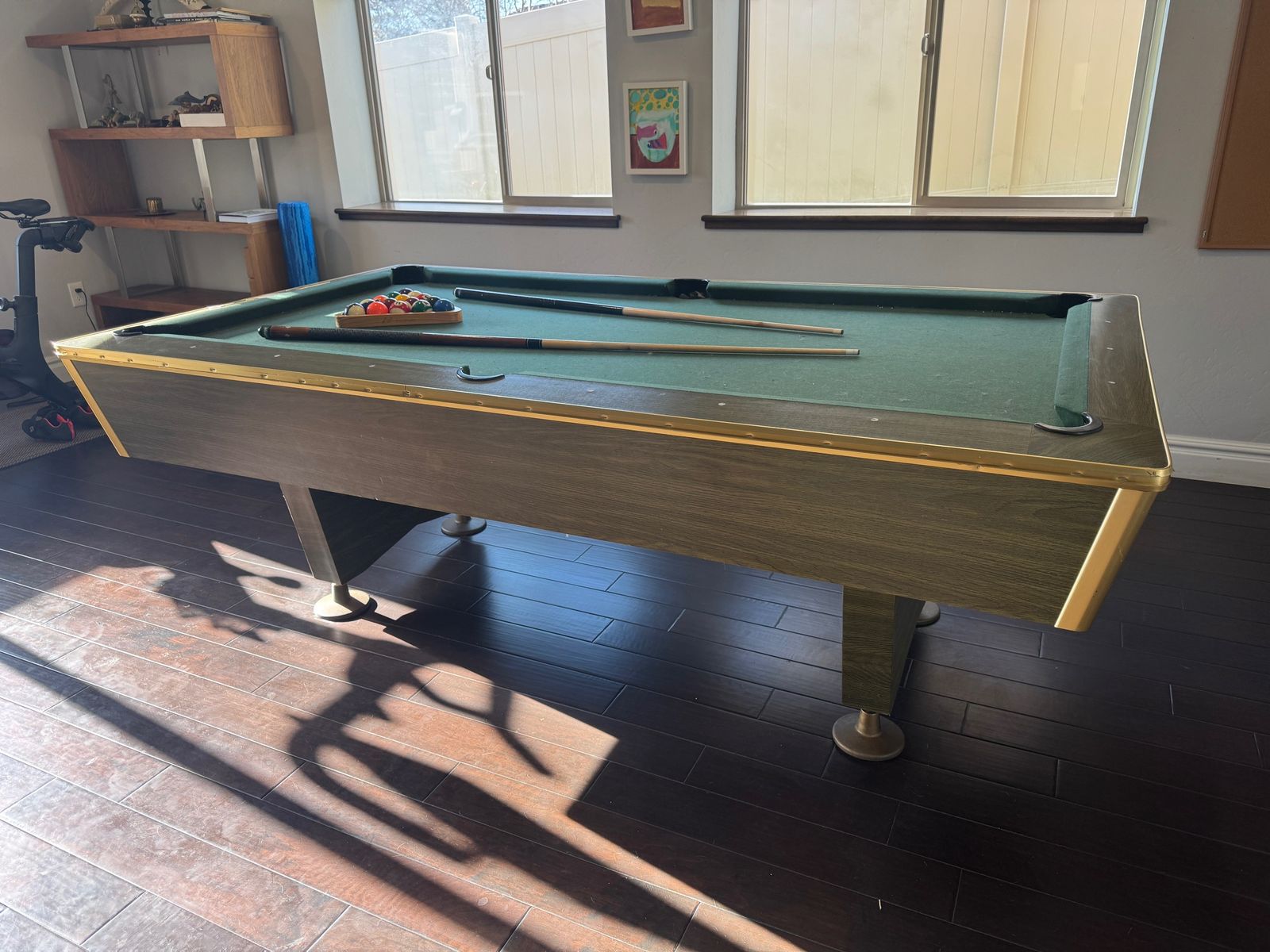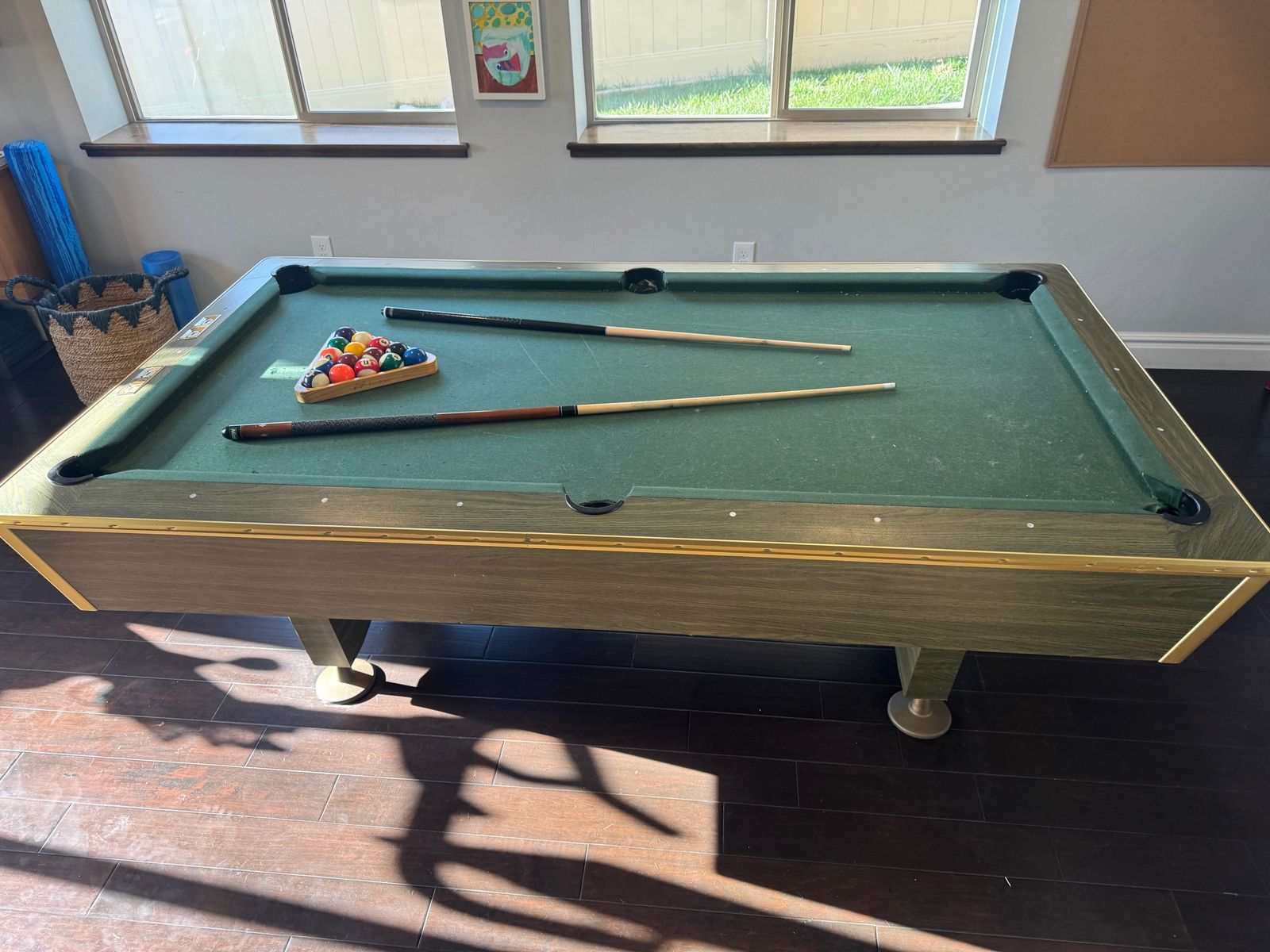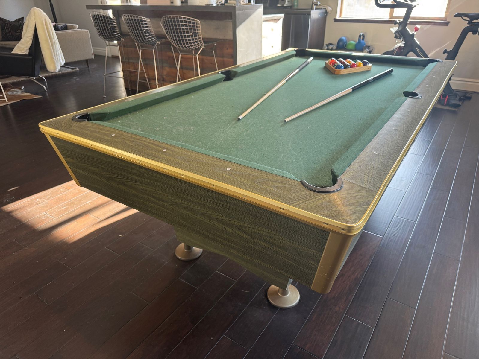 VenmoCan't take this with us. Vintage pool table that is flat and works great. 7 sticks, 2 sets of balls. Some wear on the cloth but no holes and we've had to use a little duct tape inside the holes to get them to return. No other issues or problems. Overall dimensions are 90"x50". The playing surface is slate and evenly level.