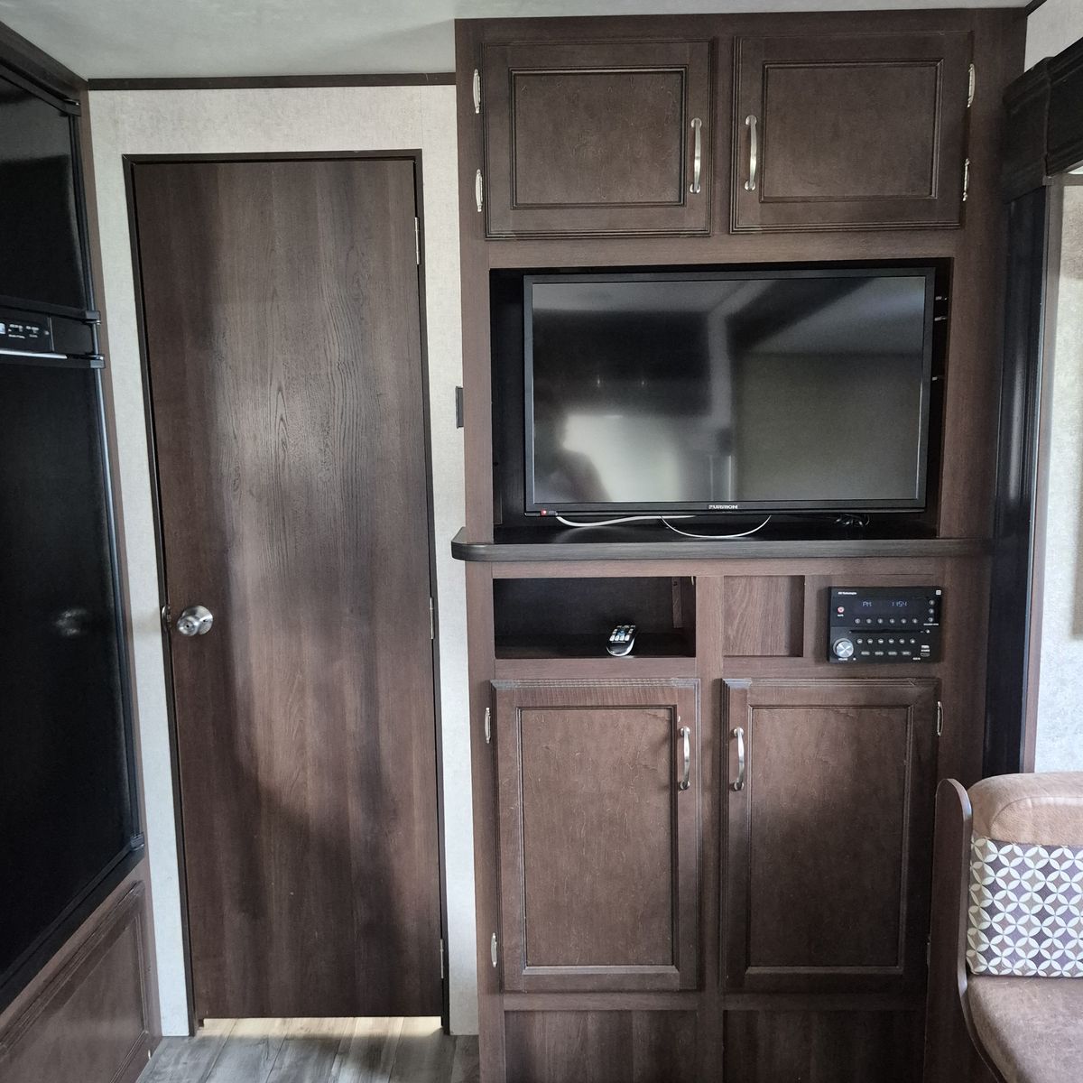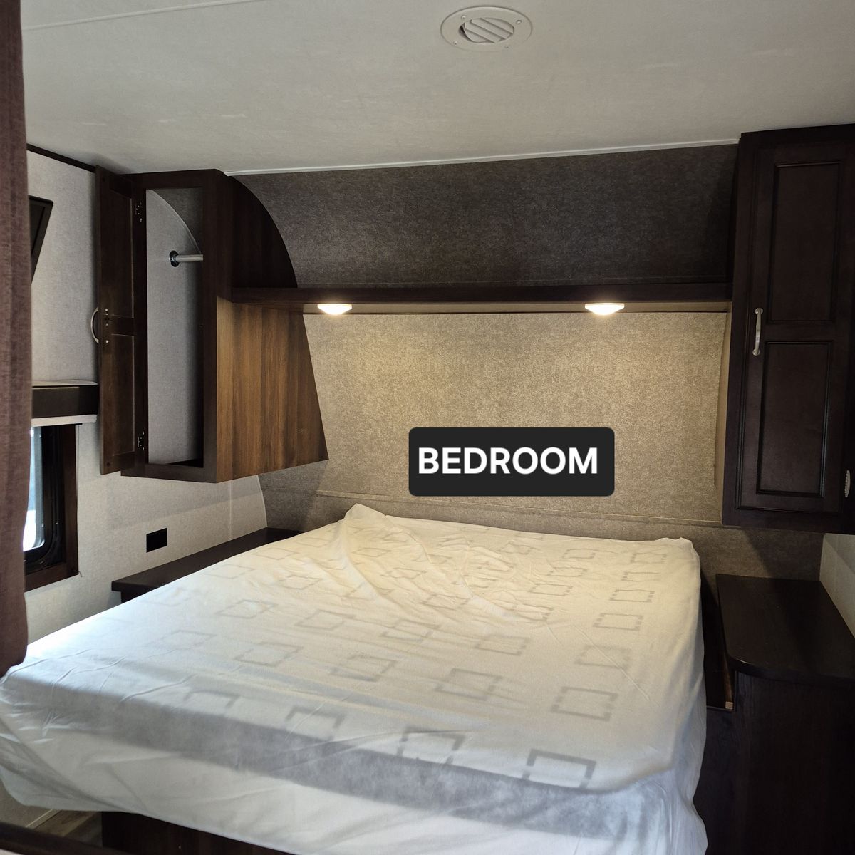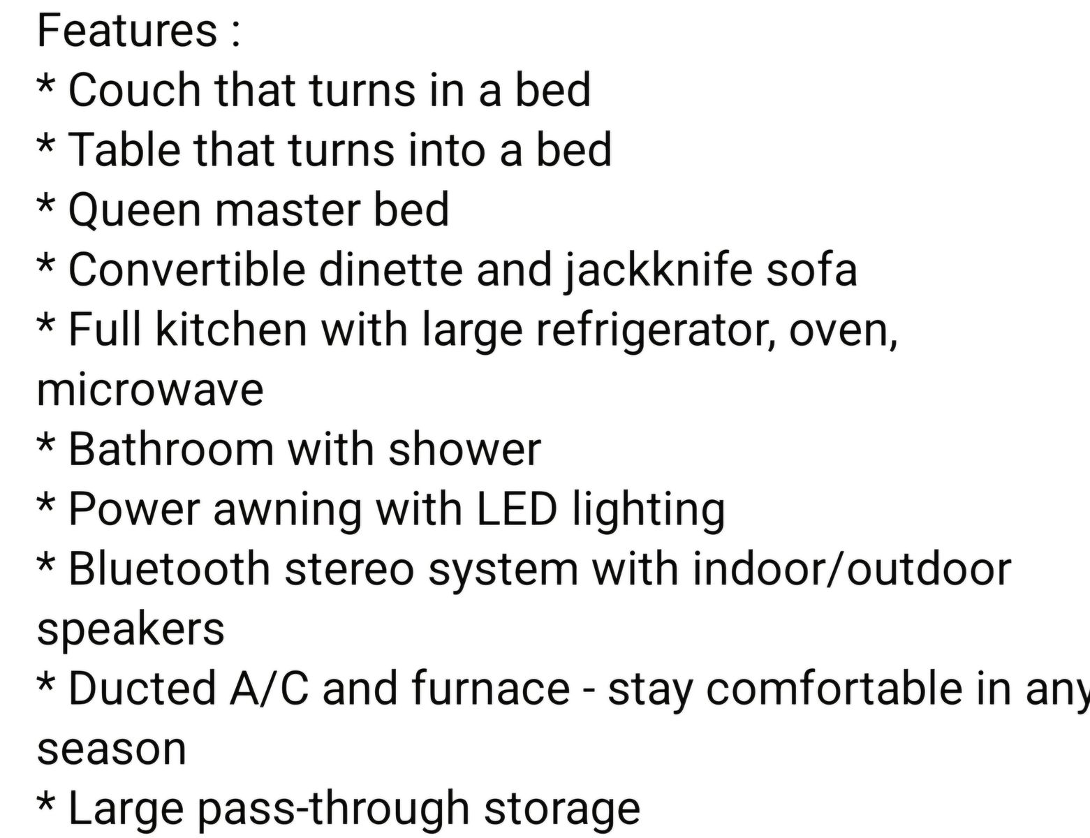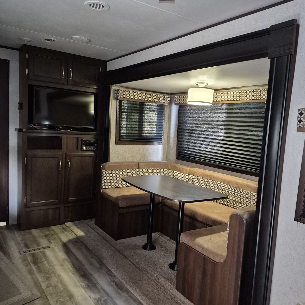 Has an open interior layout with a queen bed and large bathroom. This unit is a all weathr 4 season trailer with many extras ... Electric awning with outdoor speakers, and electric hitch with and electric slide gives the interior plenty of room in the kitchen area.