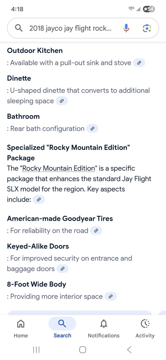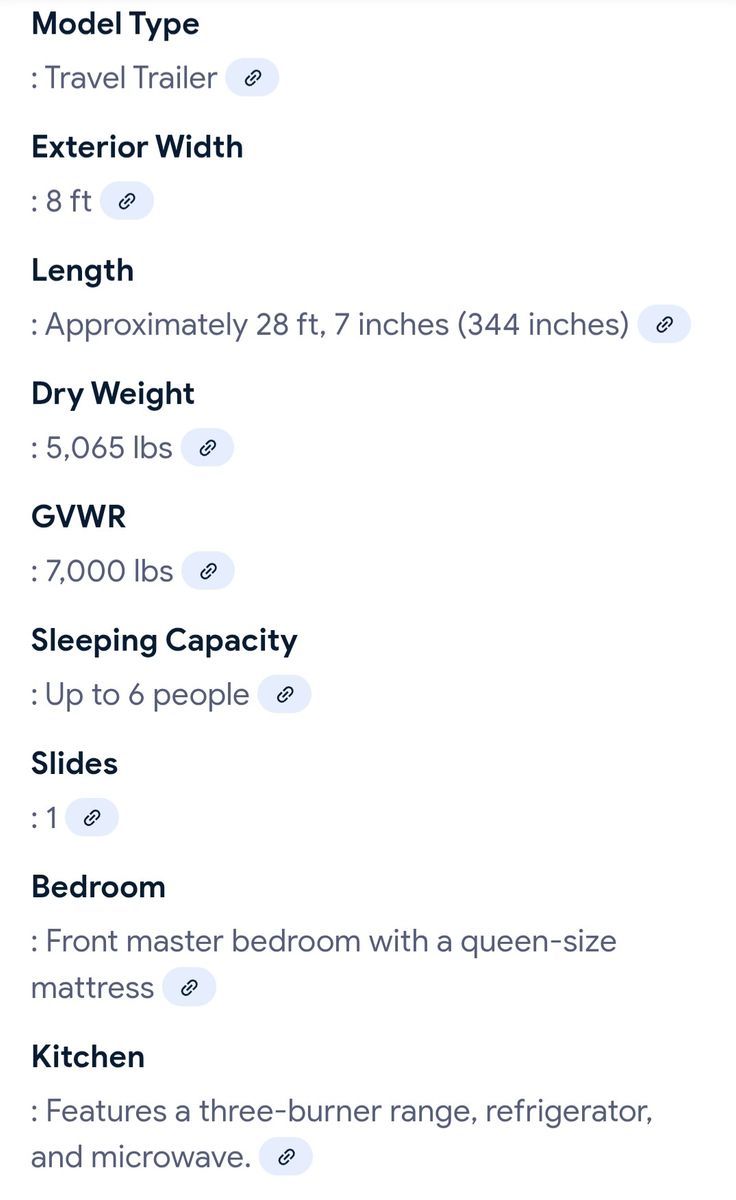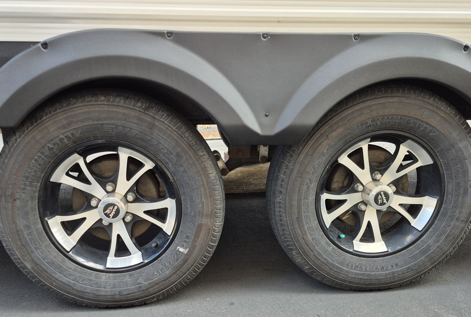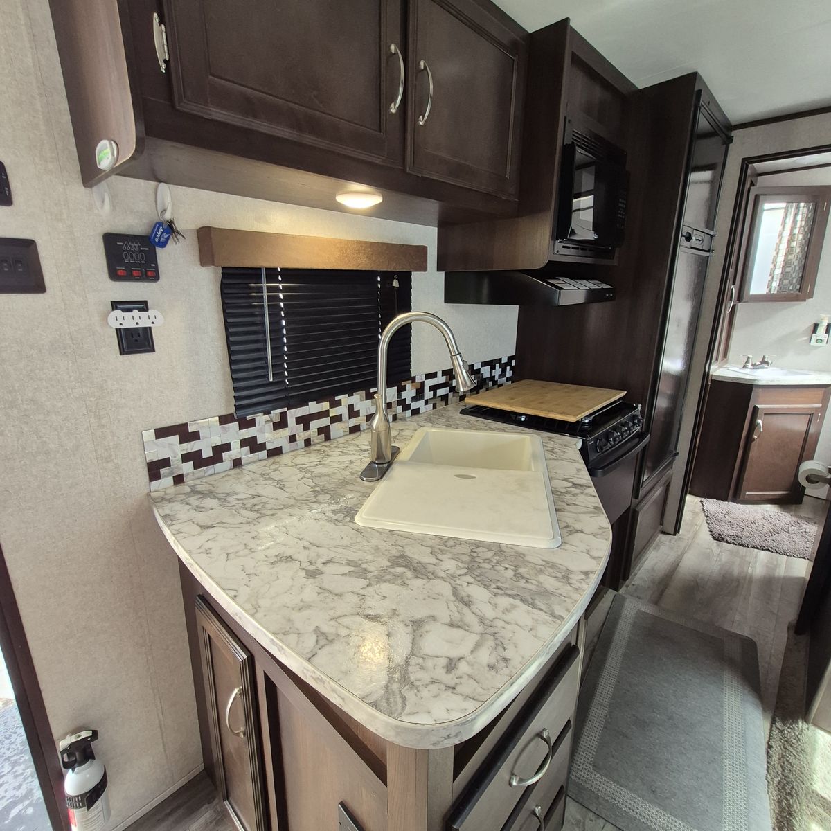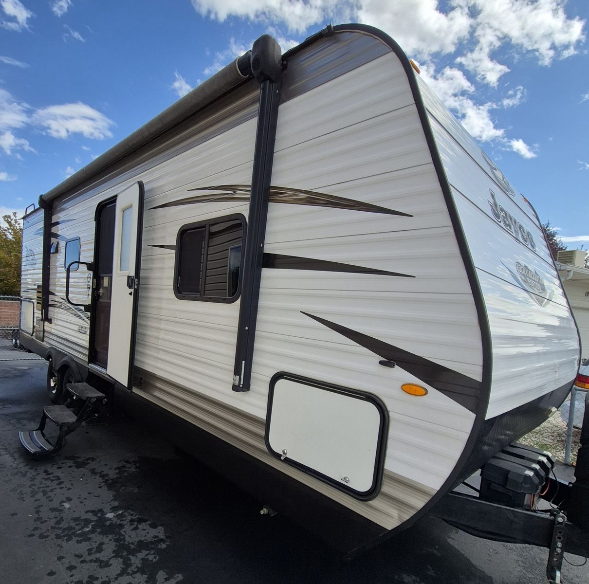 Has an open interior layout with a queen bed and large bathroom. This unit is a all weathr 4 season trailer with many extras ... Electric awning with outdoor speakers, and electric hitch with and electric slide gives the interior plenty of room in the kitchen area.