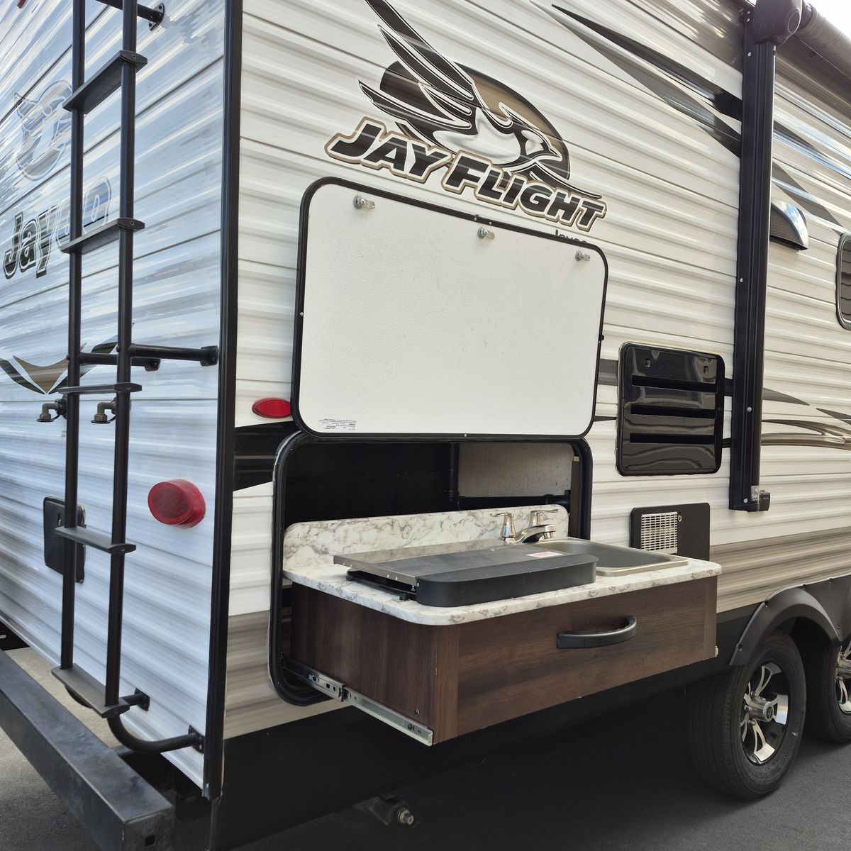 Outdoor kitchen with 2 burner stove and sink. Duel propane tanks 7.5 G tanks. Exterior shower and additional outside rear propane hookups.