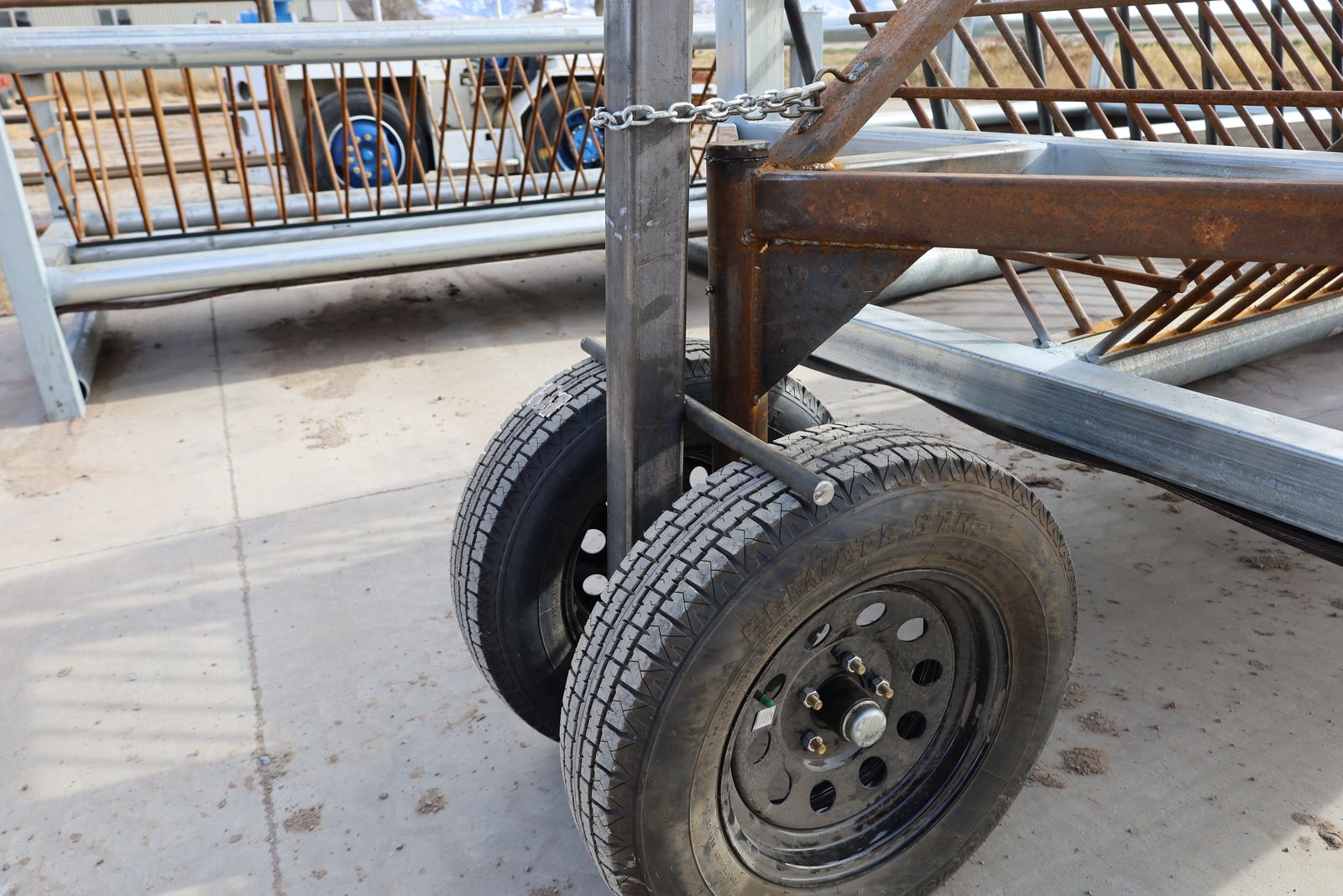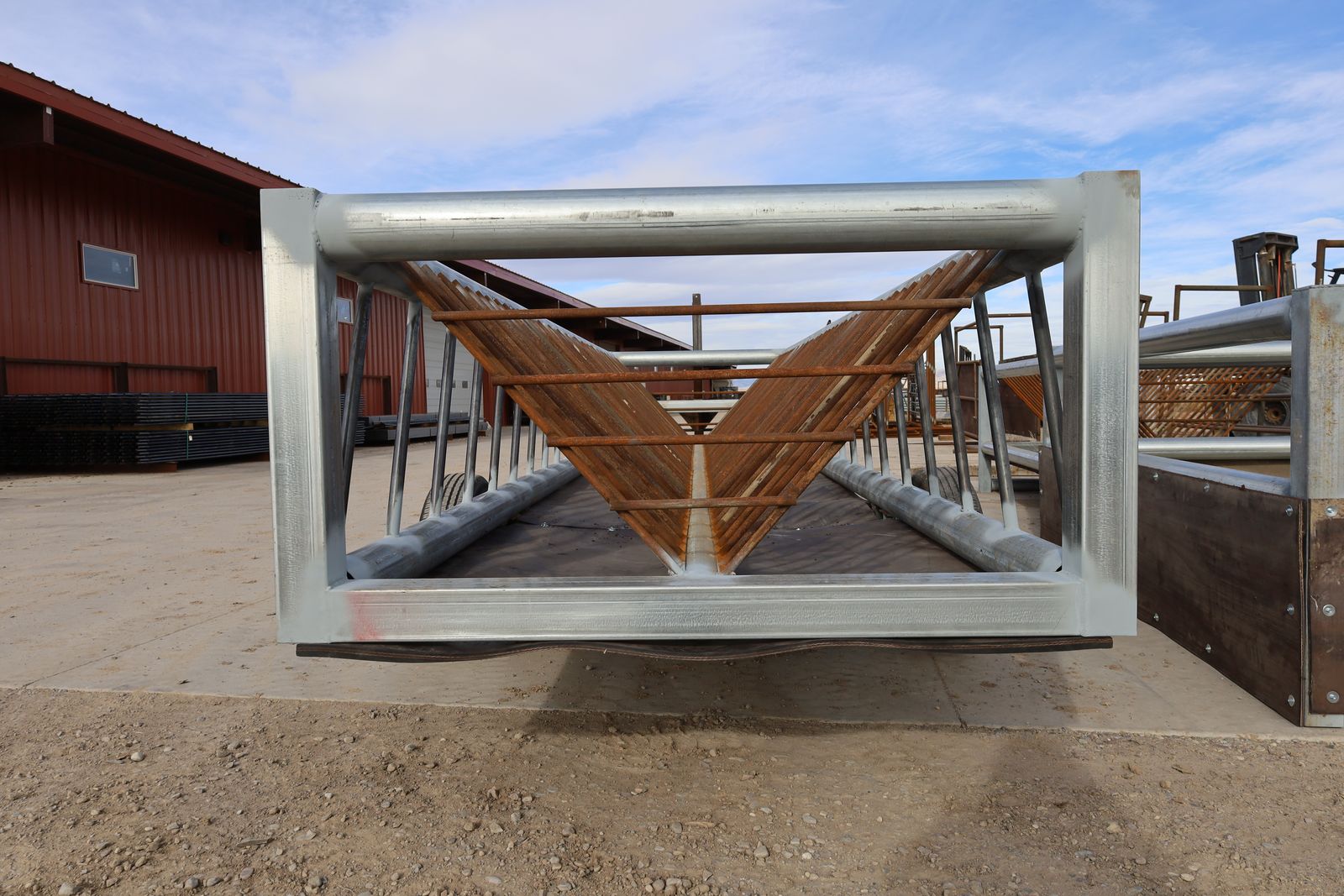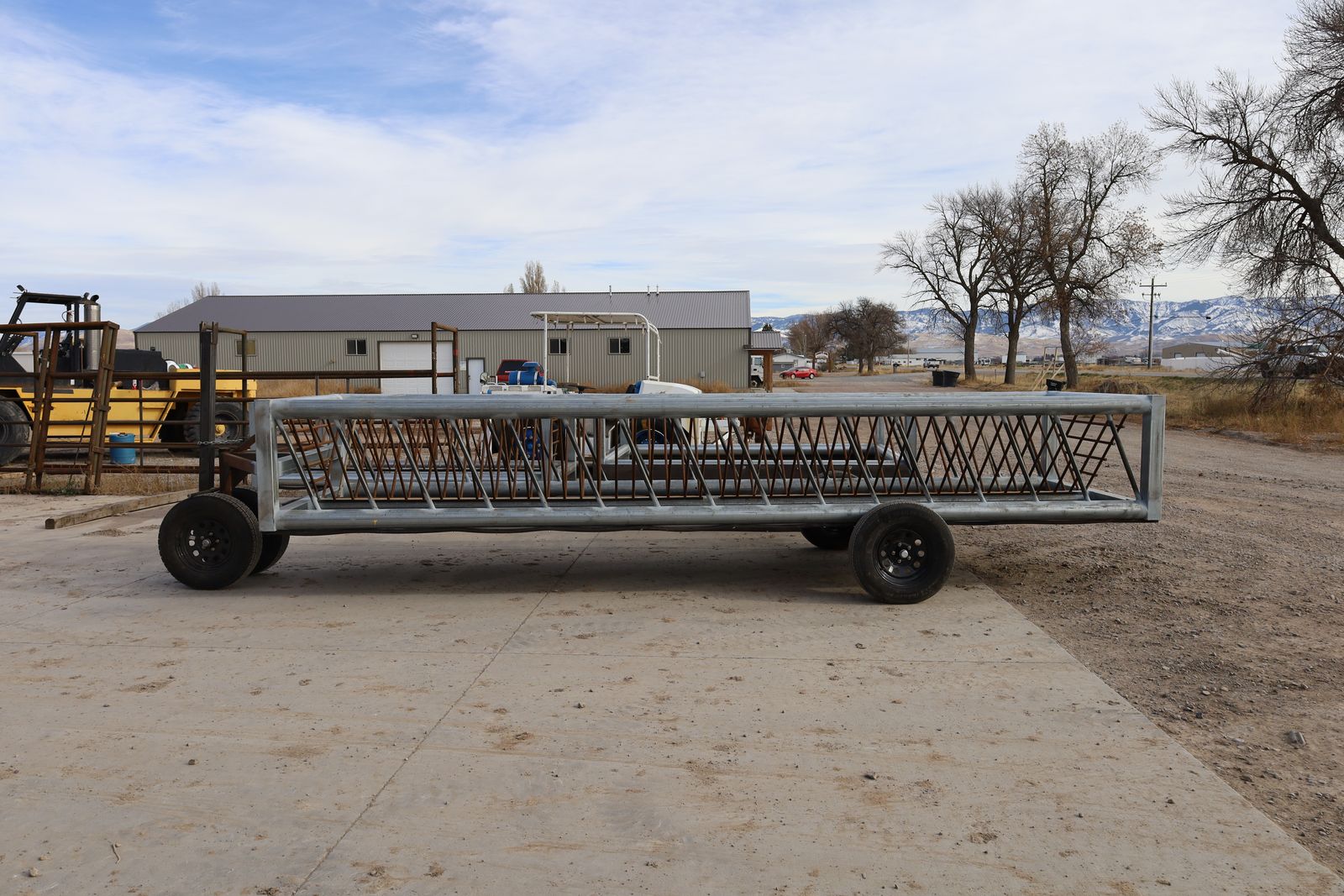 This heavy-duty mobile feeder is made out of 10 ga gavlanized tubing, 1.66 14 ga pipe and sucker rod. Spanning 20 ft it can hold two full sized bales.