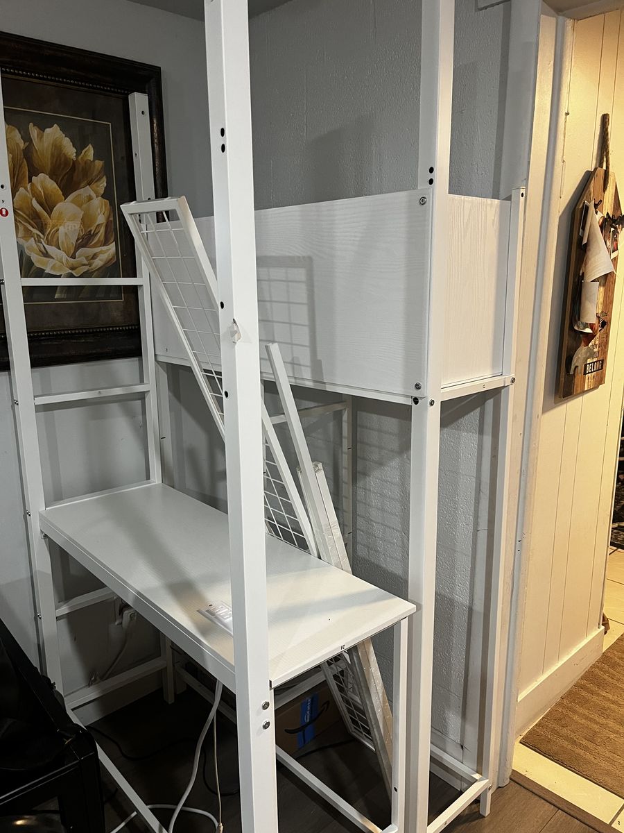 VenmoTwin Size Loft Bed with Desk and 8 Storage Drawers, Metal Kids Loft Bed Twin with LED Lights & Charging Sation, Storage Shelves, 13.1" H Safety Guard & Ladder, No Box Spring Needed, White
