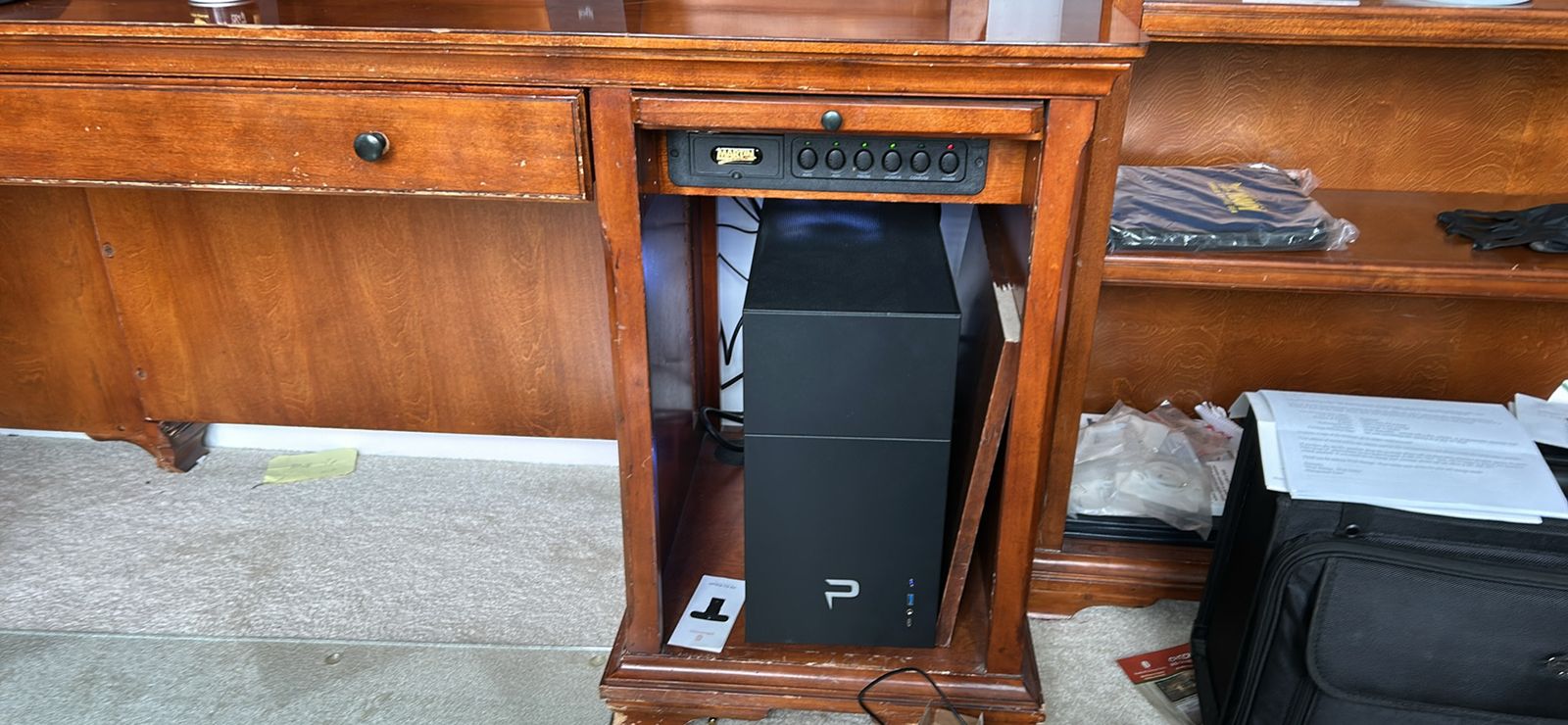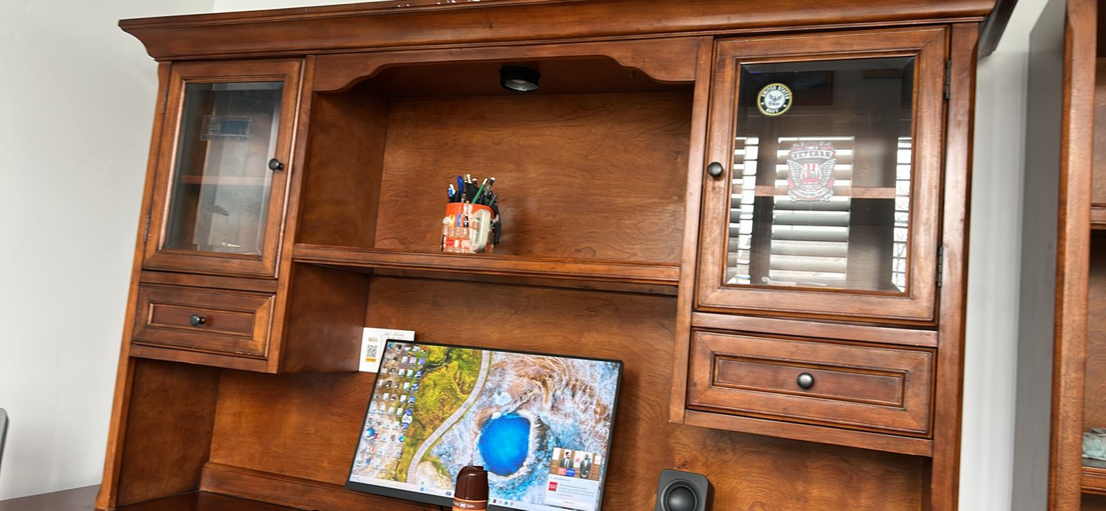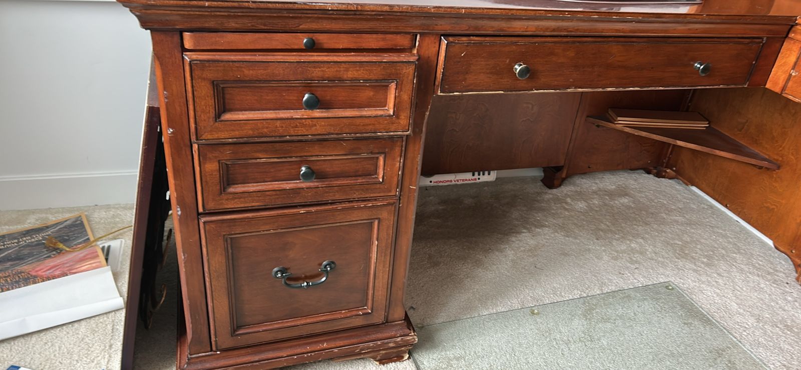 ApplePay77” x 68” x 28” 23” L shaped solid wood desk with Hutch w/ light bridge. Cherry veneer. Keyboard drawers both sides. Lots of storage w/ filing drawer. R.C. Willey original.