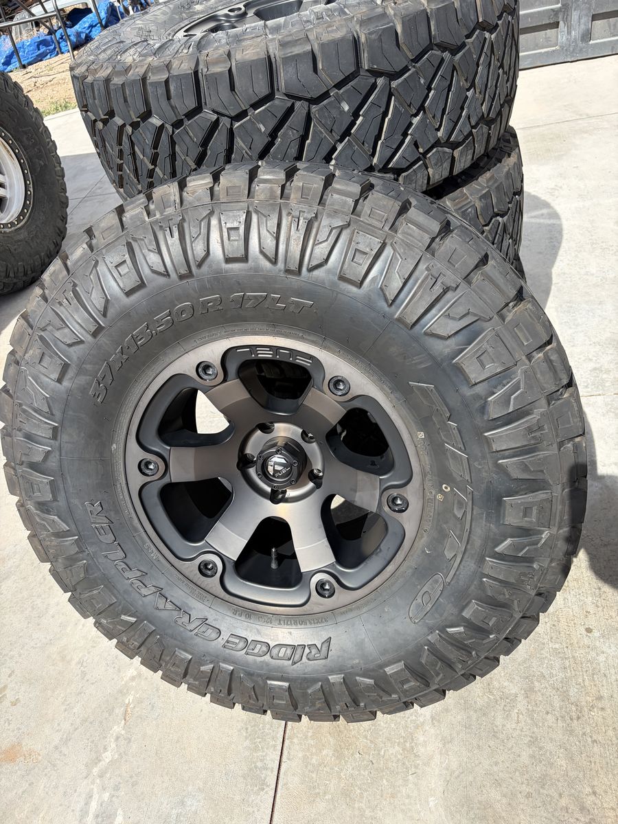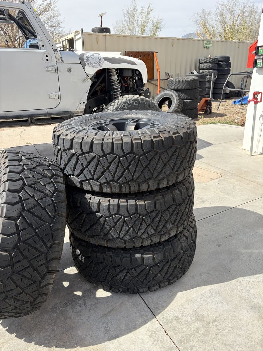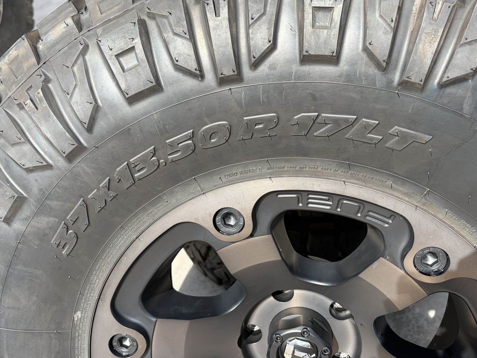Five 37x13.50R17 Nitto Ridge Grappler tires mounted on 17 inch rims. These are 10 ply rated tires with load index 121Q. They will fit Jeep JK and JL bolt pattern. Tires are in excellent shape with about 90 percent tread remaining. They are older but have been well stored and show zero dry rot or cracking anywhere. No patches or repairs. Rims are in good condition. Perfect setup if you want a full size matching spare or need a solid set of big tires without paying new tire prices. Located in Hurricane