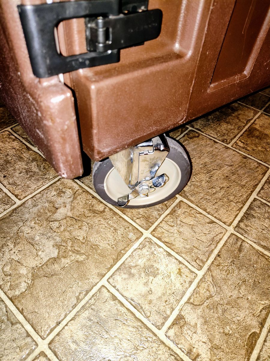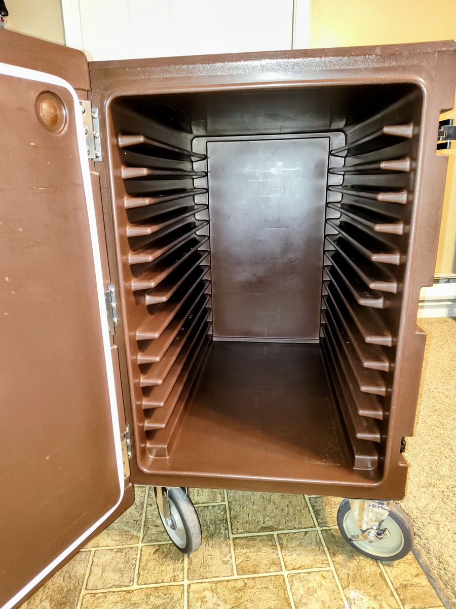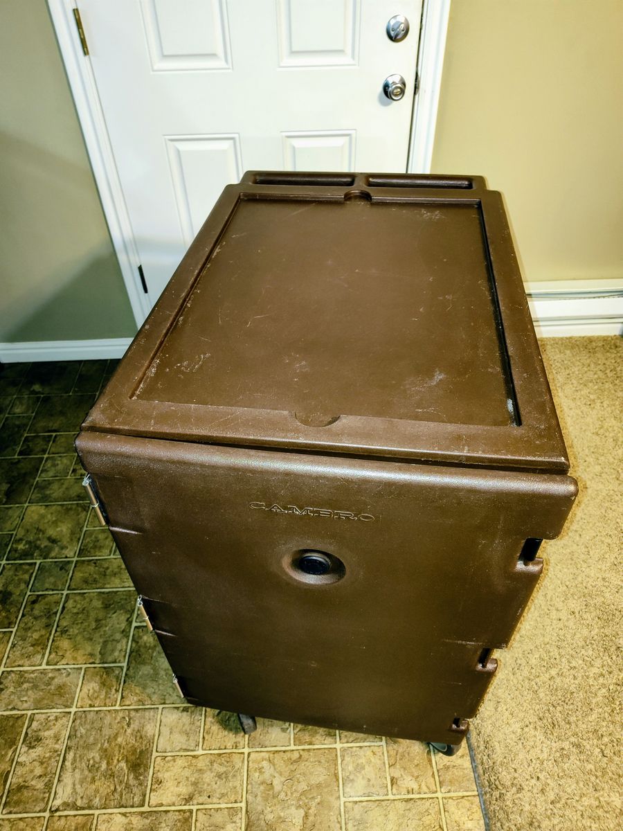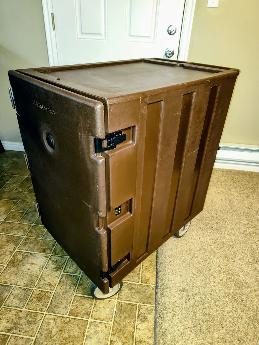 I have a Cambro non-electric hot box I no longer need. The box is in very good condition. The front wheels turn and have a break. It can fit 13 trays or 6 food pans. The middle latch is broken, but the box works fine with the other two. New latch costs about $6.