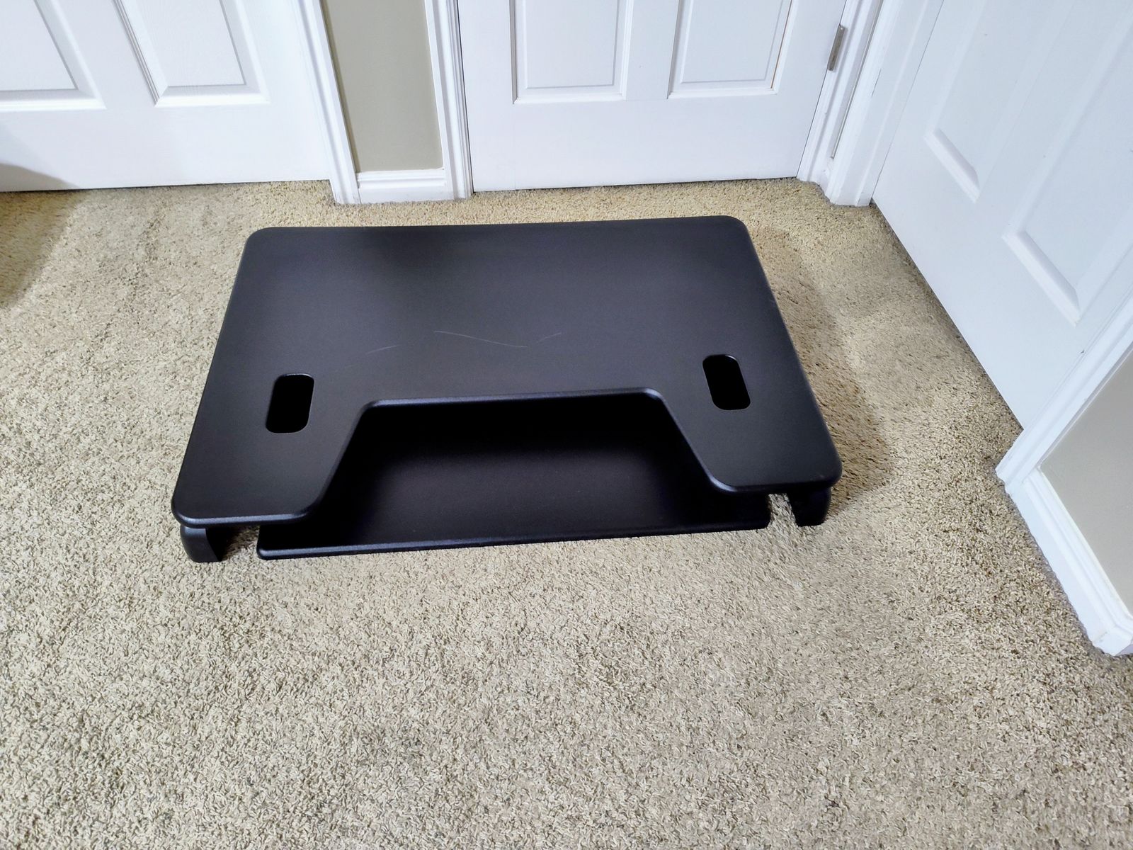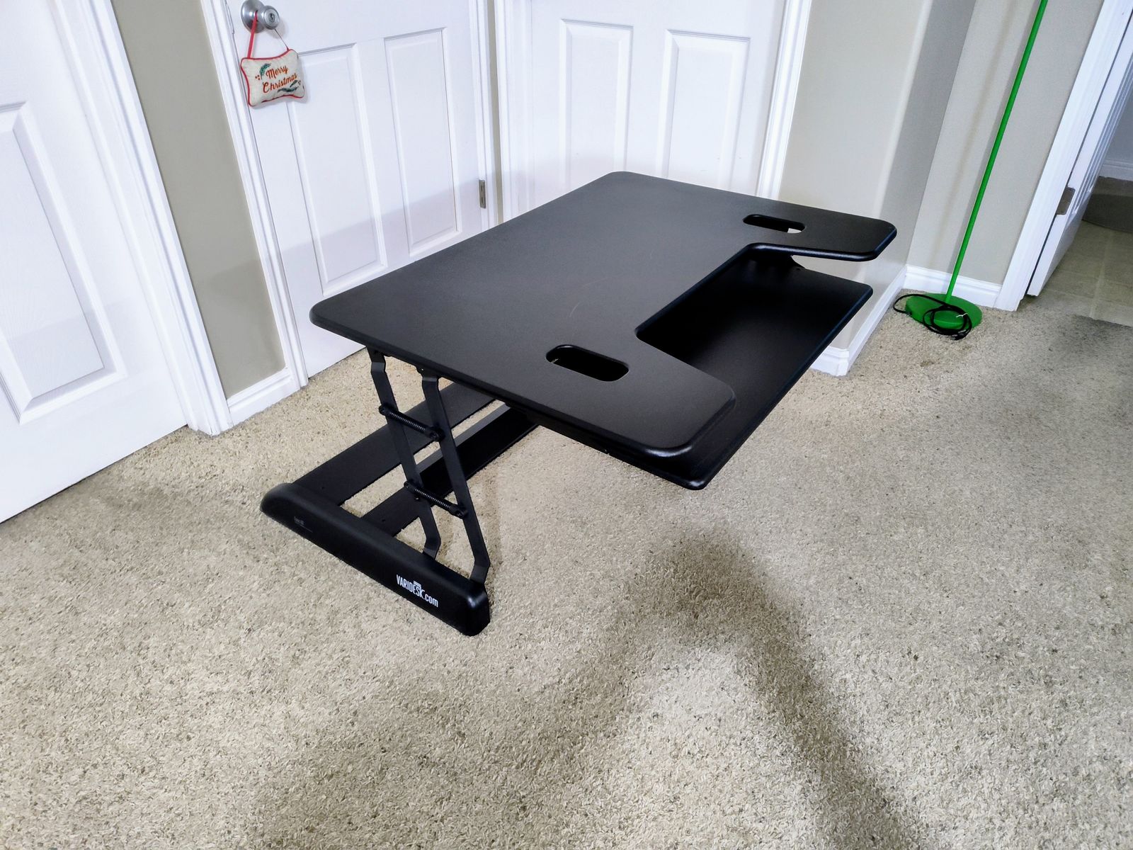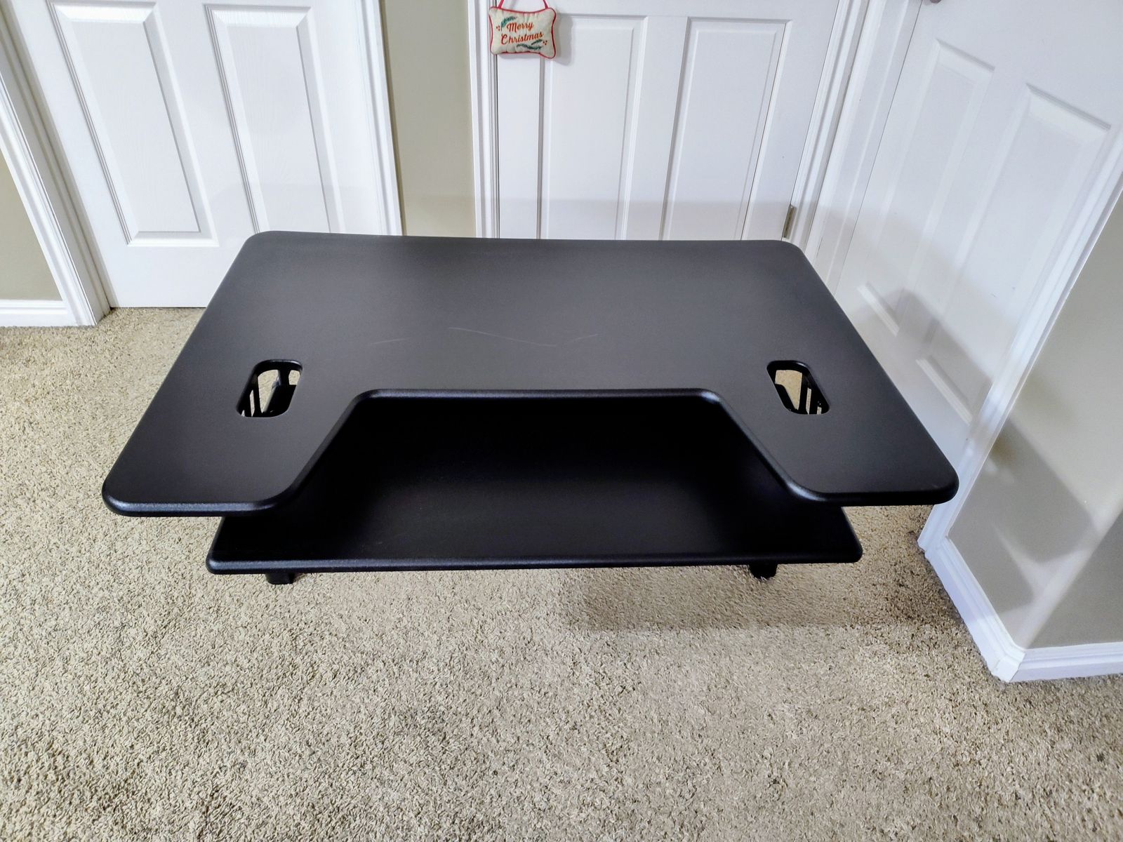 I have an extra standing desk converter I no longer need. It is very high quality and very sturdy. It fits two monitors and it is in very good condition. The top measures 40 x 28 inches. When the desk is folded its height is 5.5 inches. When the desk in extended its height is 24 inches. This desk costs 600 + tax new, so this one a is fraction of that price. Please feel free to reach out if you have any questions or want to come see it. I am open to offers. Thanks!