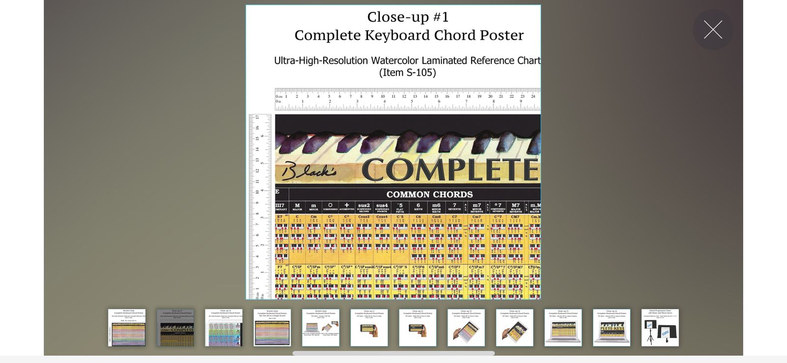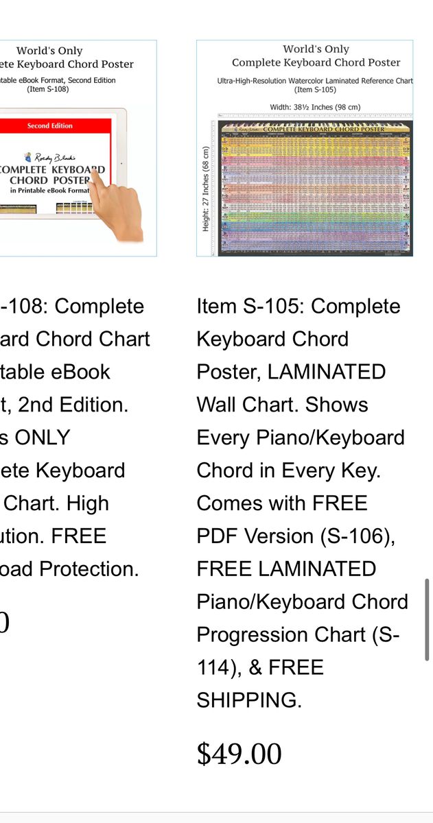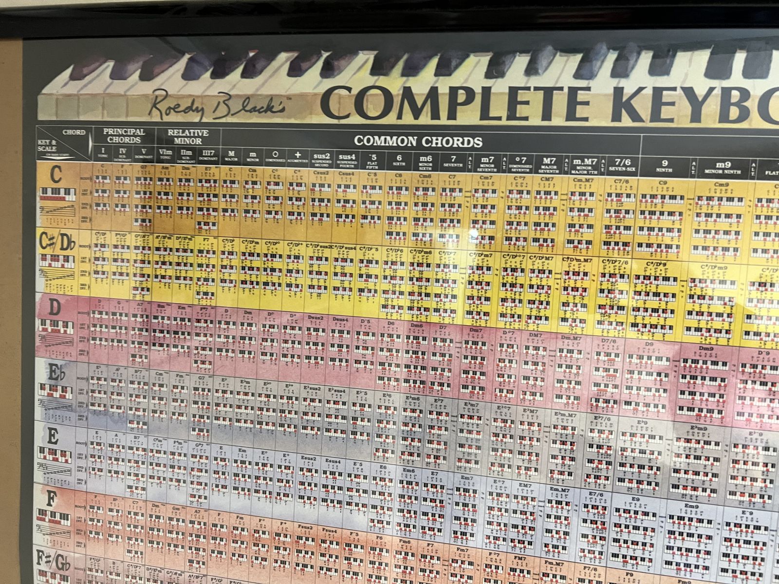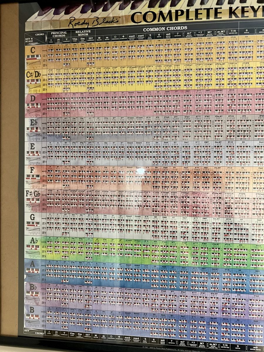VenmoSelling Roedy Black’s Complete Keyboard Chord Poster Reference Wall Chart • About: For Keyboard Players at All Levels The Complete Keyboard Chord Poster is a large, high-resolution watercolor laminated wall poster that shows the fingering positions of every keyboard chord, including the inversions. Players at all levels, from beginner to advanced, can take advantage of this poster’s various features. • Beginners—The chart shows chord diagrams for the simple, basic chords in all major and minor keys. The poster also includes major scales for each key (left and right margins). • Intermediate-level players—As you move from left to right across the poster, the chords become progressively more extended. This enables you to learn new, unusual chords and chord inversions at your own pace, without losing track of your progress. Color bands identify the chords in each key. This makes it possible to quickly transpose the chords of a song from the original key to any other key. The time required to learn and master beginner piano chords varies from person to person. With regular practice, it is possible to become comfortable with basic chords within a few weeks or months. Mastery comes with continued practice and application in different musical contexts. This means that while the poster helps you learn at your own pace, committing to regular practice is key to progressing from basic comfort to true mastery. By combining structured learning tools with consistent effort, you can efficiently track your progress and enjoy the process of becoming proficient at playing piano chords. • Advanced players—Even expert players usually don’t have all chords in all keys memorized. The right side of the Complete Keyboard Chord Poster shows the fingering positions of extended jazz chords such as 11ths and 13ths, organized so that you can find any chord fingering position in any key at a glance \