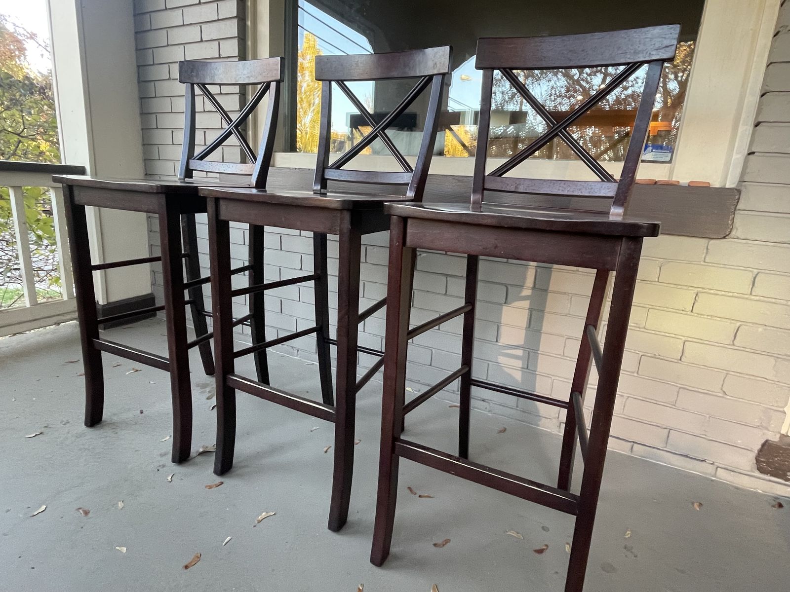 VenmoThese 3 wooden bar stools are in great condition. They are 45 inches tall, 17 inches deep, 17 inches wide.