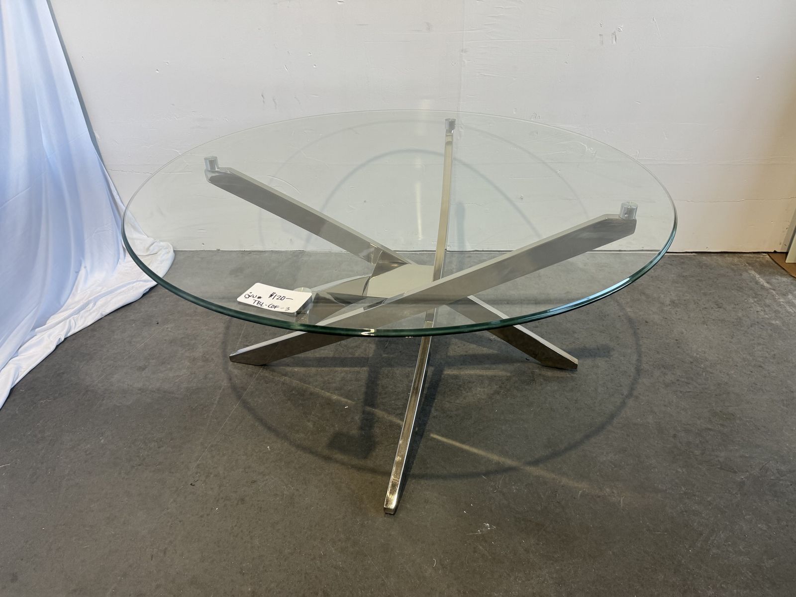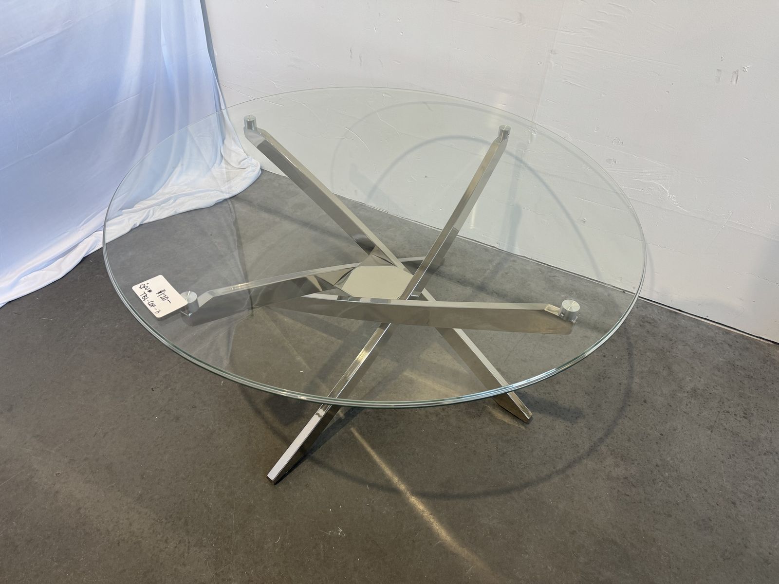 40” round glass top coffee table, chrome base. Brand unknown. 1 table available.