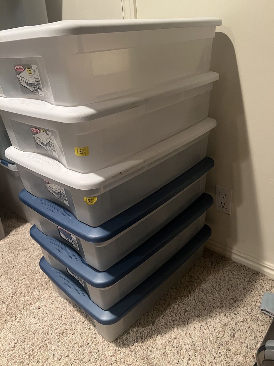VenmoSterilite bins with blue and white lids. 6 tall 16.5 wide 23 long 27 quart /26 liter. There are 6 available. Pick up in Herriman. Pet and smoke free home. Cash or Venmo. $6 each. listed for a client