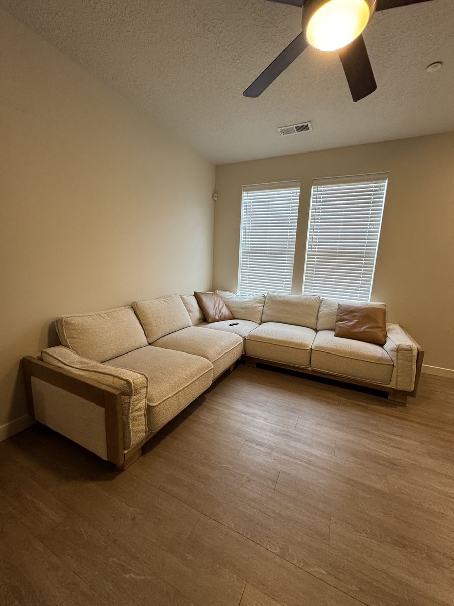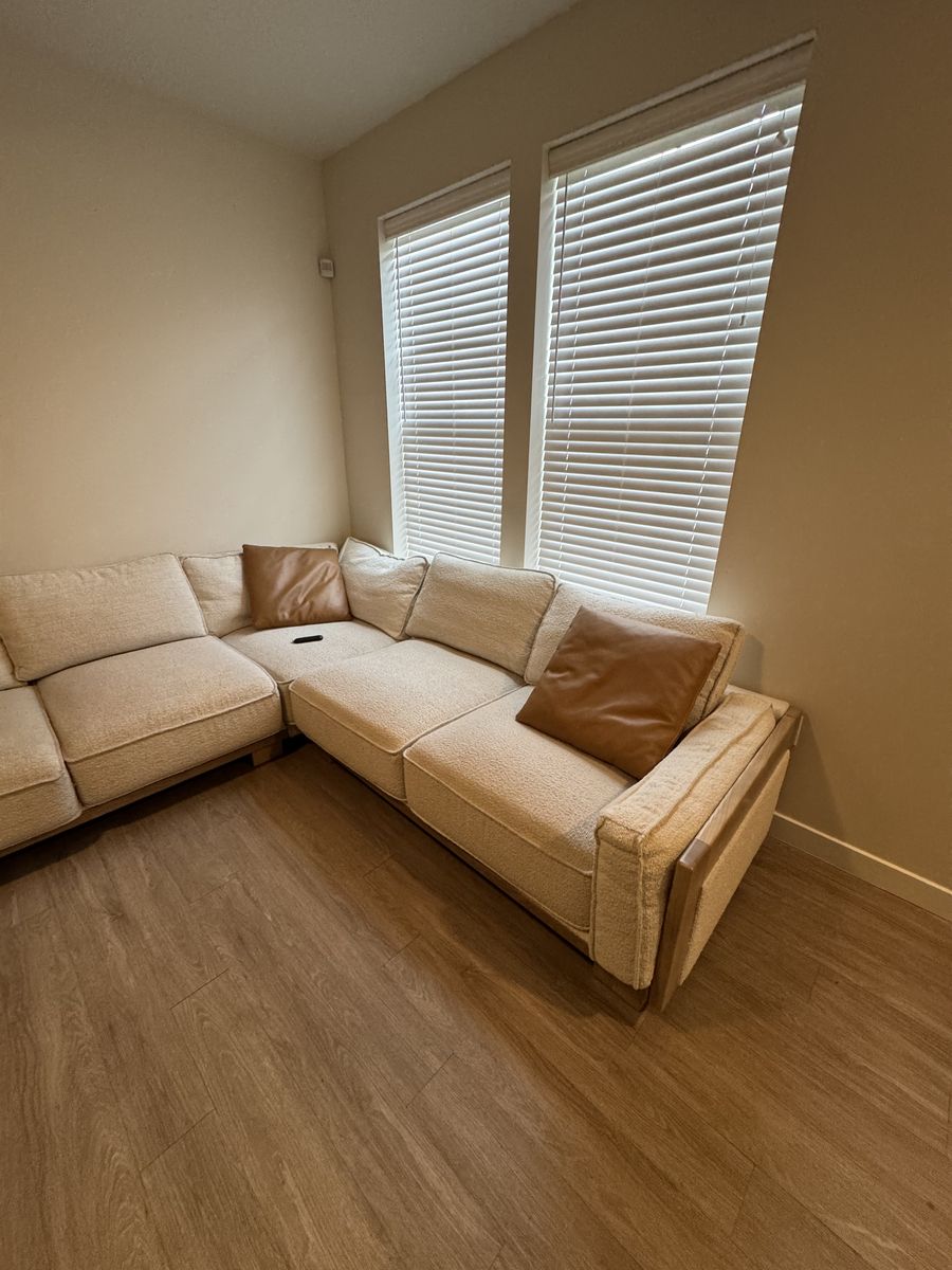 Beautiful modern sectional in great shape. Originally purchased for $4,000. Neutral textured fabric with solid wood frame detailing and clean lines fits well in both modern and transitional spaces.