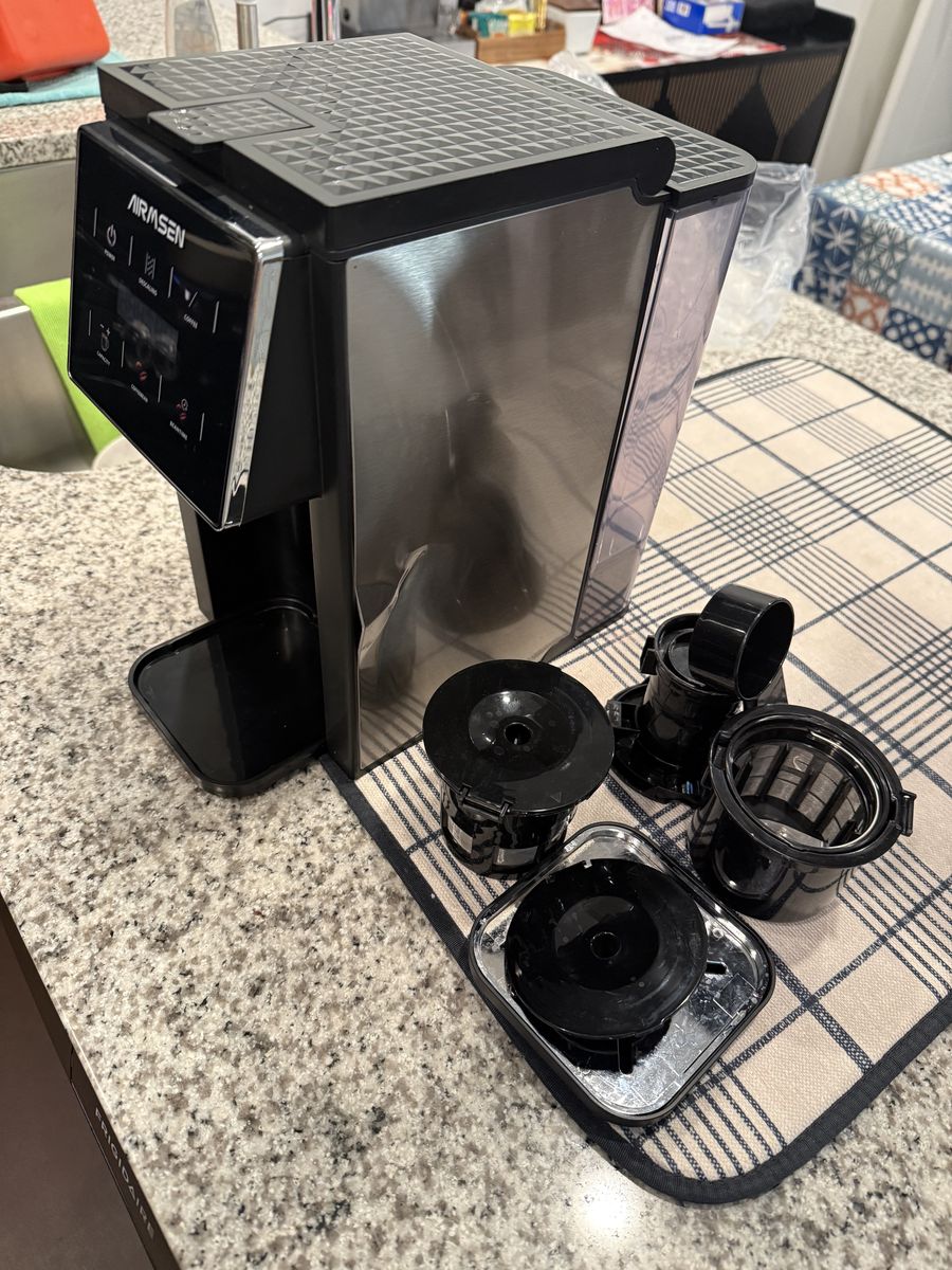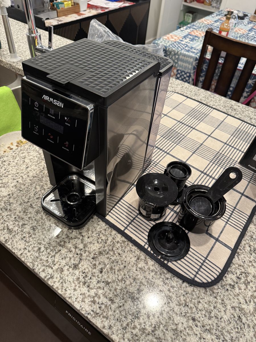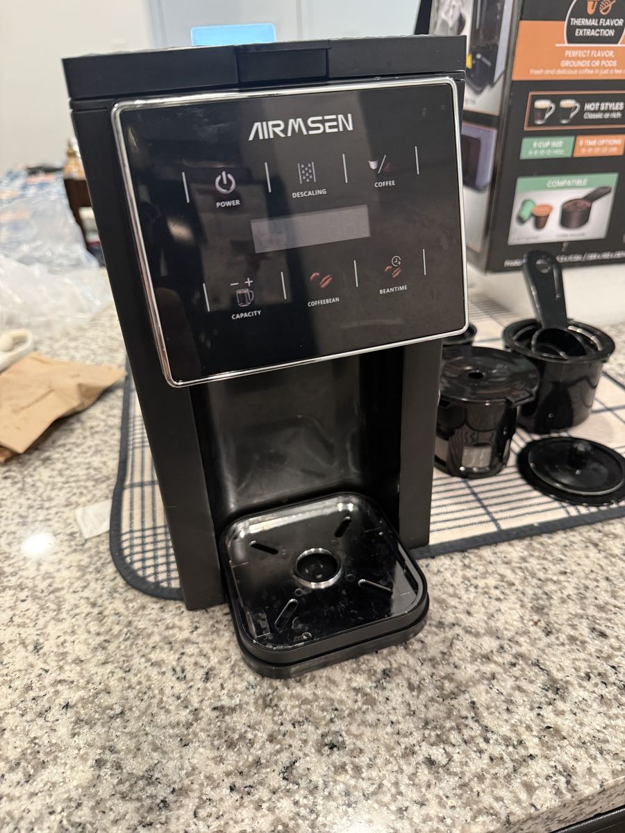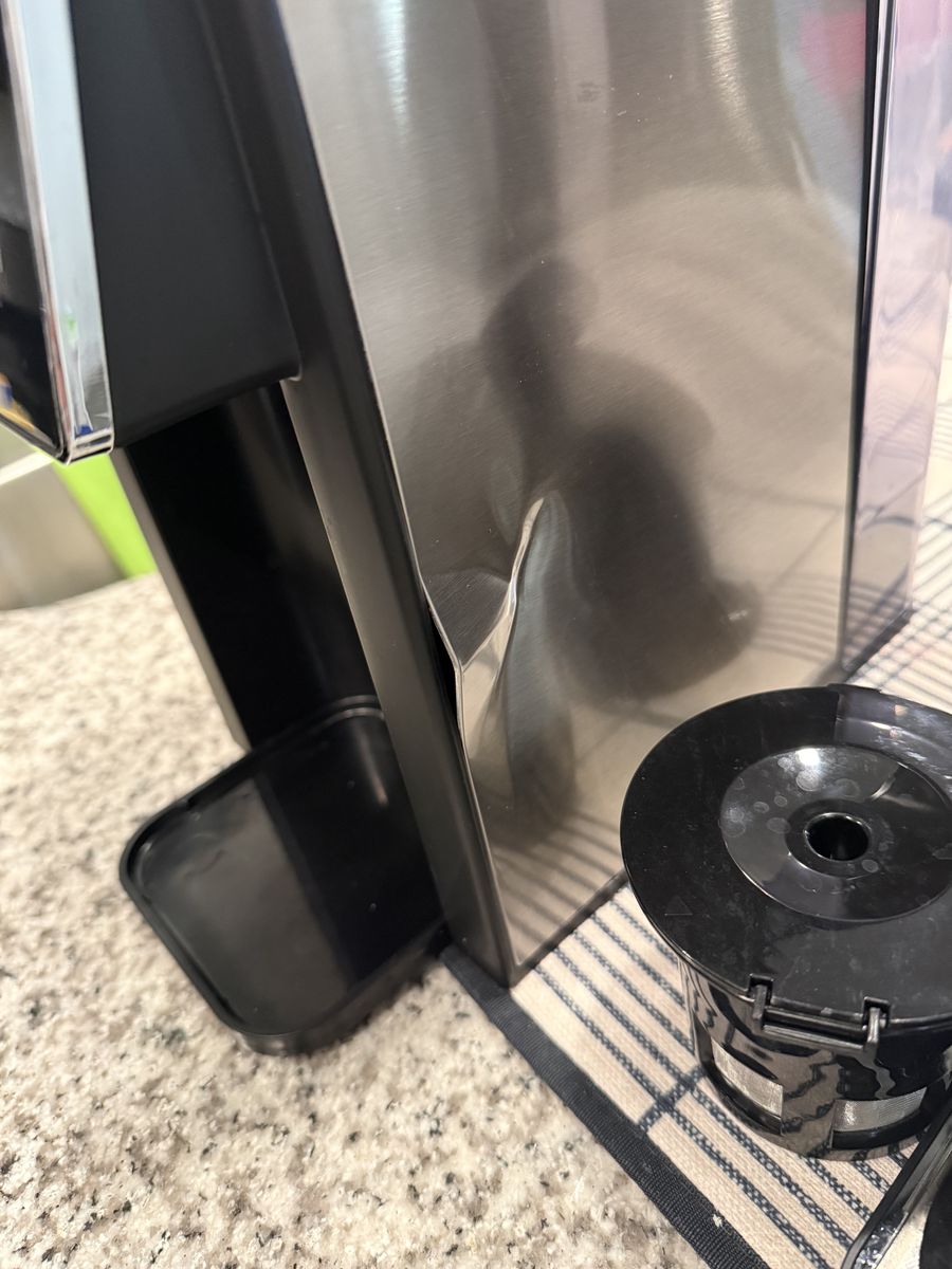 Coffee maker in excellent working condition. It was used only one time, and everything works perfectly. During a recent move, the side of the machine got a small dent, as shown in the photo. This does NOT affect the functionality at all — the machine works exactly as it should.