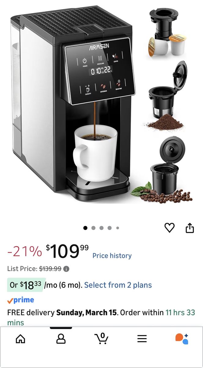 AIRMSEN Grind & Brew Coffee Maker with Built-in Grinder (2026 Model) - Single-Serve, Compatible with K-Cup Pods & Ground, 1000W Fast 6-14oz Brewer, Descaling Alert, Touchscreen & 50oz Removable Tank.