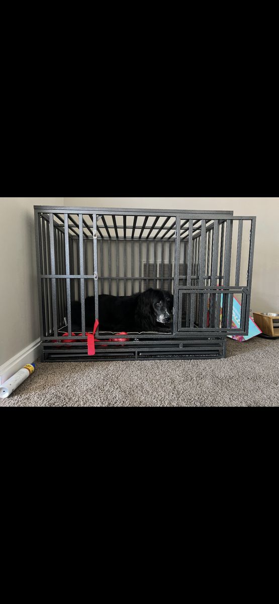ApplePaySturdy heavy-duty dog kennel. Dark gray color. Has double door design and secure latches. Removable tray at bottom. Metal construction. Great for large dog. Has some bite marks from my anxious boy. Dog photographed inside is 85lb golden retriever mix. Taken apart for easy transport. Overall Dimensions: 46'L X 32W X 39H; Internal height of the dog cage : 32H; (Dog not included)