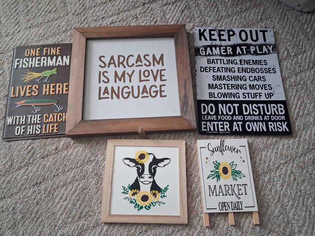 VenmoRedneck fish finder $5 Weed is my therapy $5 Keep out $5 Wooden tray $5 Sarcasm is my love language $20 One fine fisherman $10 Wherever the journey takes us $5 Don't feed the bears $5 I want to hold your hand at 80 $10 Skull $5 We may not have it all $5 Cow sunflower $5 Sunflower market $5