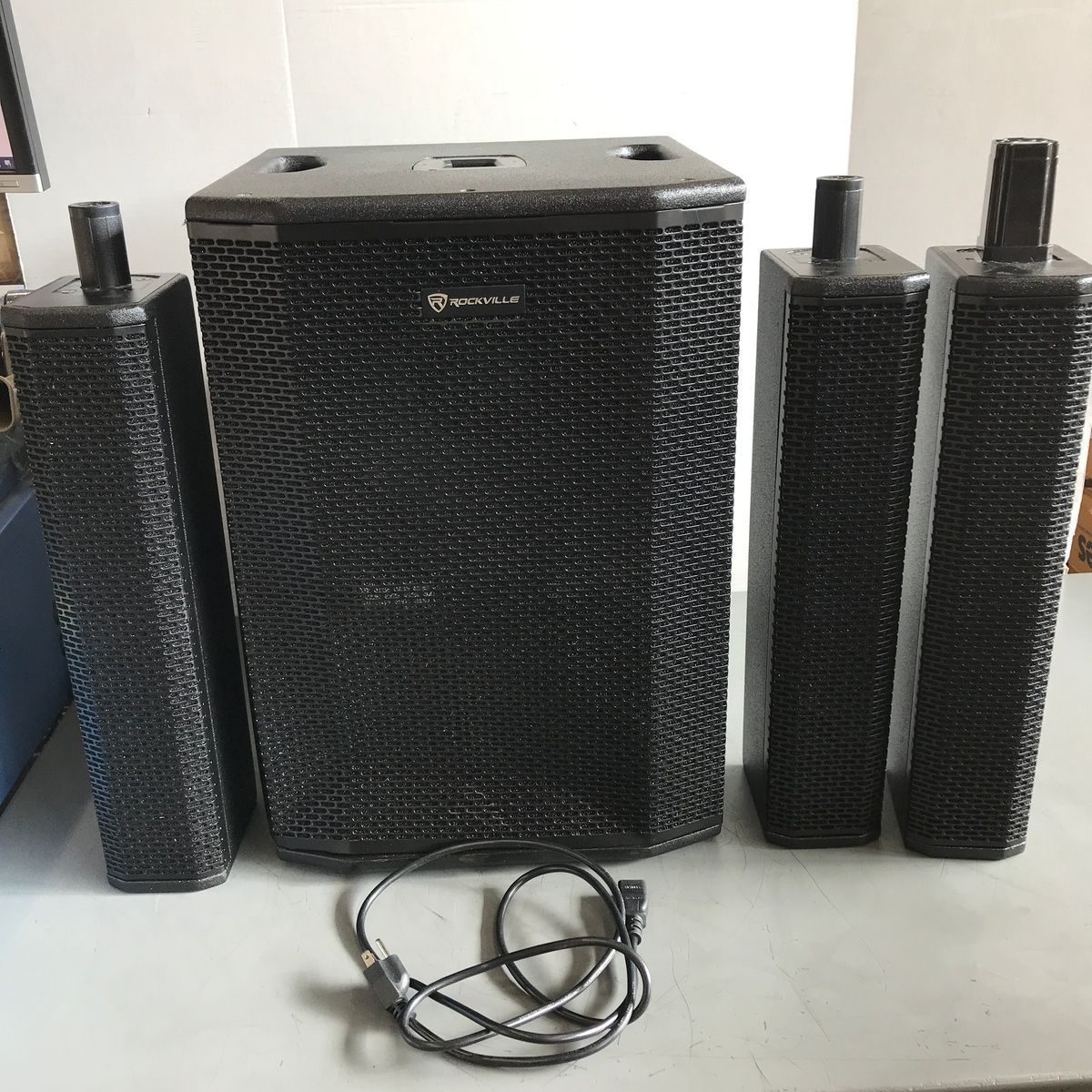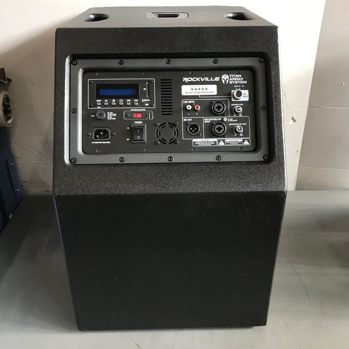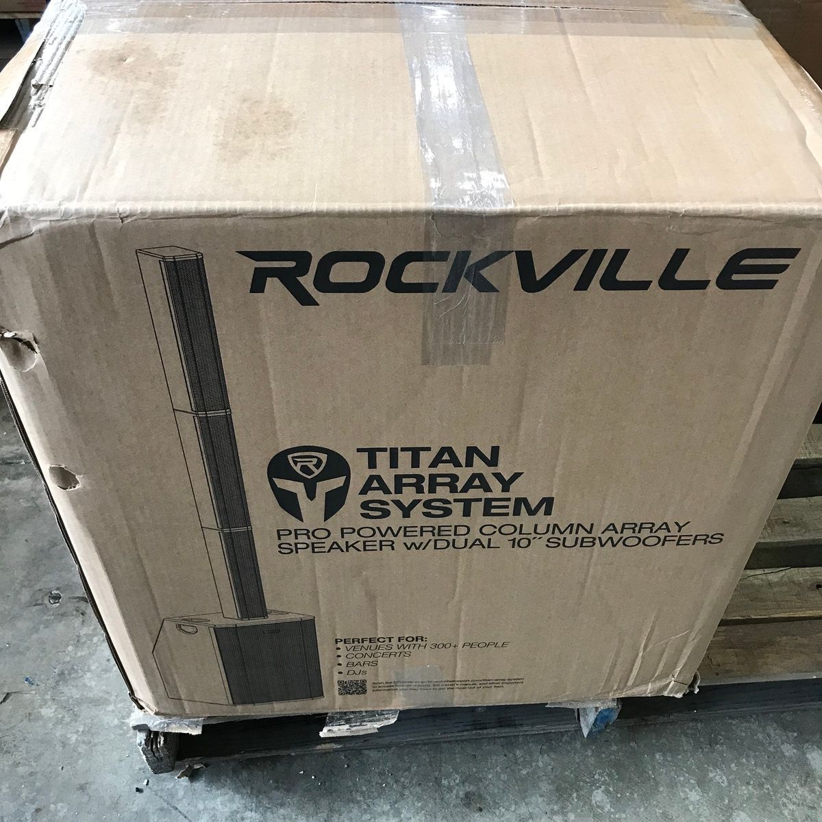 ROCKVILLE TITAN 3200 WATT LINE ARRAY POWERED PA SYSTEM V2 PRO WITH DUAL 10" SUBWOOFER. This is a new line array powered PA system that suffered some cosmetic damage in original shipping. It still works perfectly, and none of it compromises the function, but the front speaker grill is dented in, there are some minor surface marks on the sides and bottom, and there's a small bit of a crack near one of the feet. We'll do our best to show everything in the photos. It powers up, works perfectly, and sounds amazing! These are normally $700. It comes with everything shown. This is your chance to save big-time so don't miss out!!
