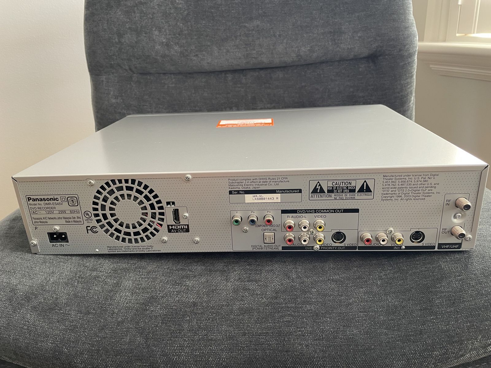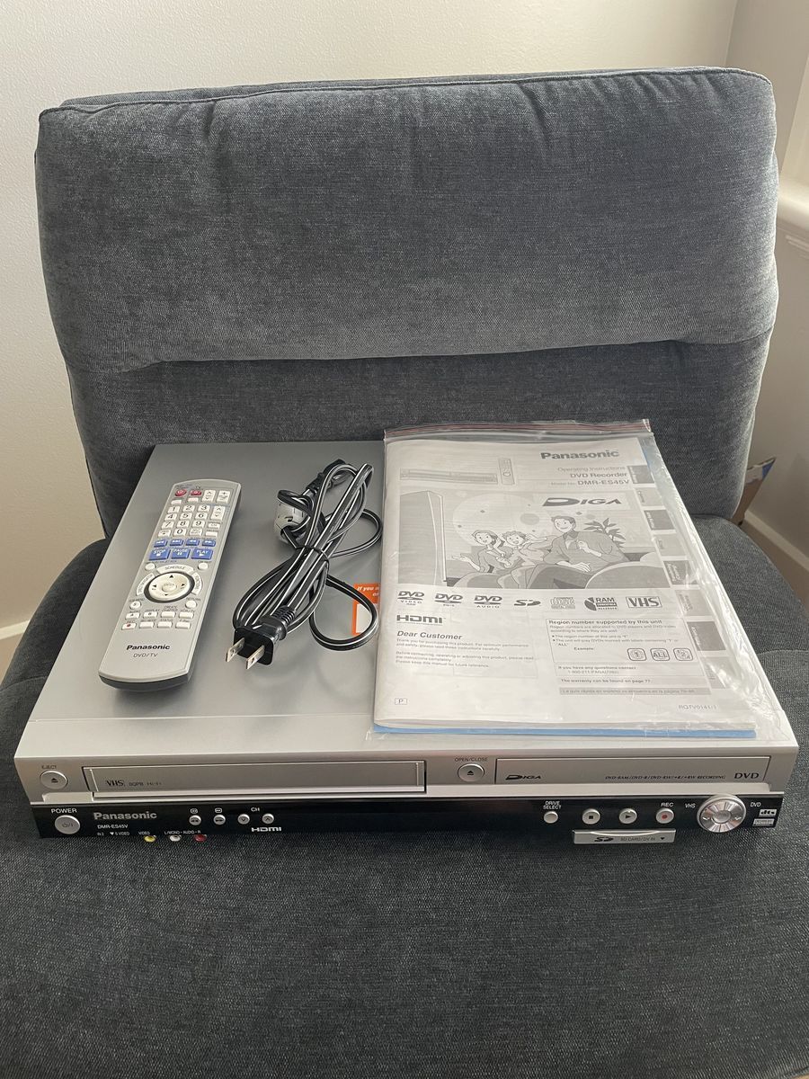 VenmoPanasonic VCR / DVD recorder player model DMR-ES45V in excellent condition. Features bi-directional recording VCR -> DVD or DVD -> VCR, one button copying, DV input, SD card input, HDMI output, and more. Includes original remote, power cord, and operating instructions. Everything works as new... "clean 1-owner".