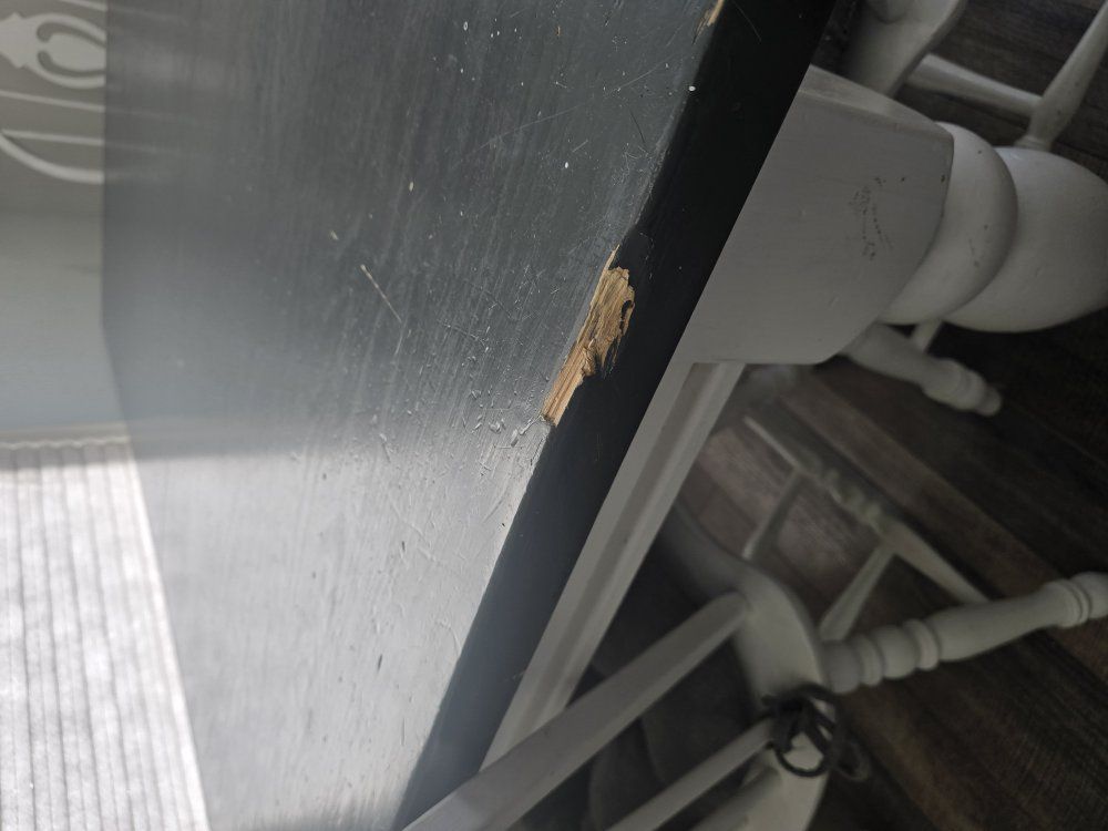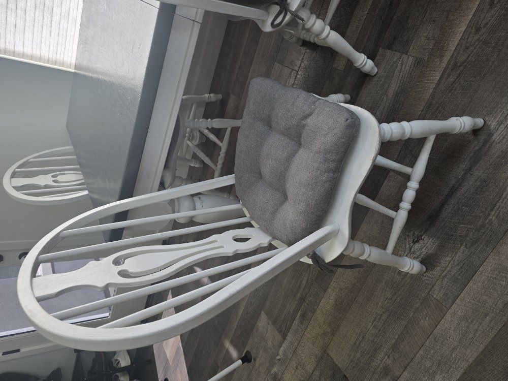 Solid wood dining table measuring 5 ft by 3.5 ft, comes with 4 matching chairs. The set is sturdy and well-built . The table and chairs have noticeable wear and markings and could use refinishing.