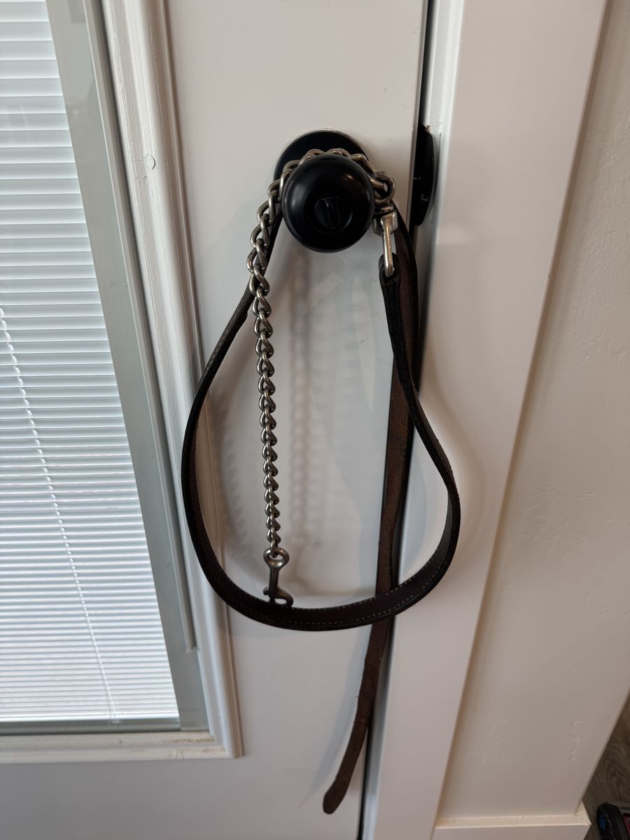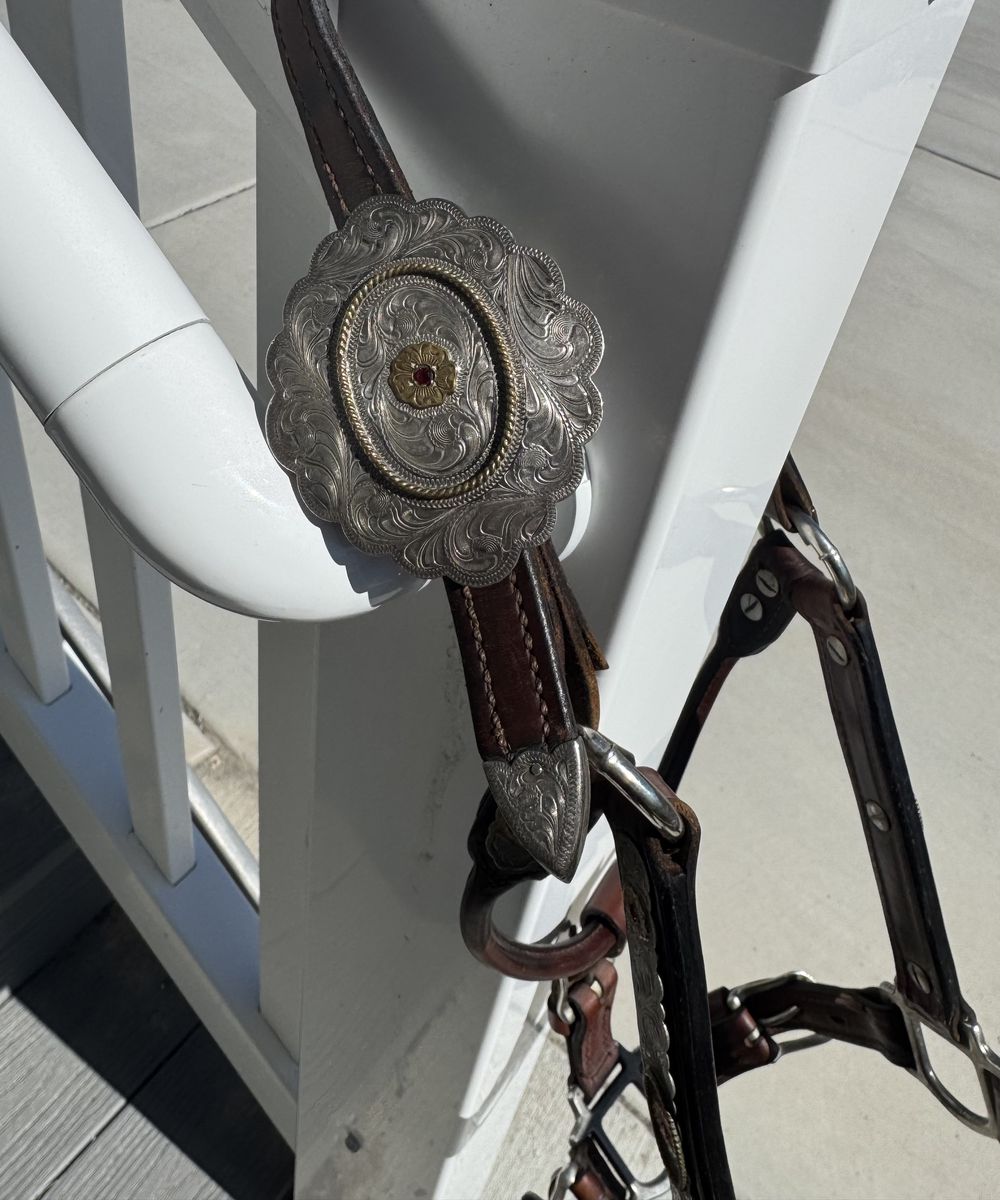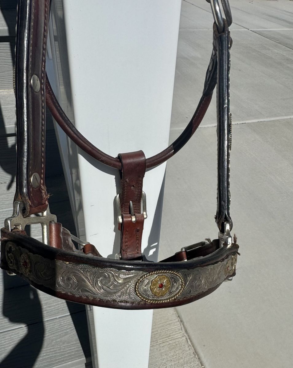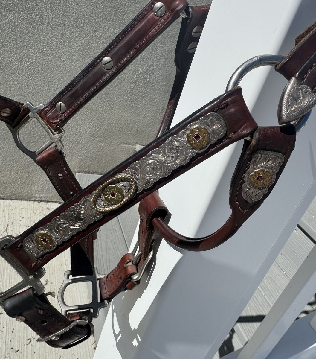 ApplePayOlder, petite show halter with lead in good condition. It was sold to me as a yearling halter, but I’ve used it on a quarter pony and a quarter horse with a smaller head (last photo). It is adjustable and has higher quality silver, which does need polished. Stored indoors in a smoke free home.